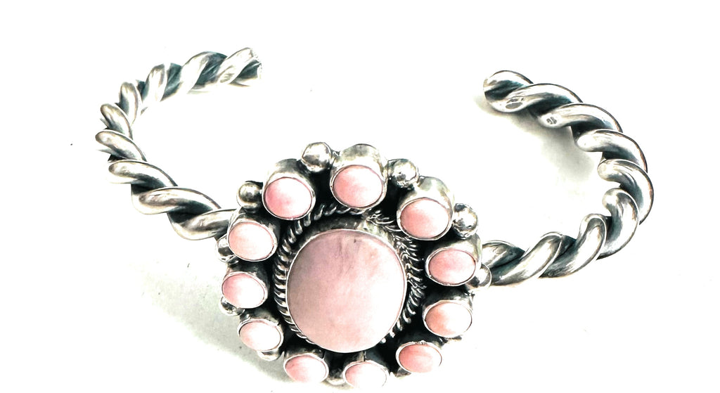 Lovely Queen Pink Conch Shell and Sterling Silver Cluster Cuff Bracelet. Such a pretty cuff! Cuff has an inside circumference of 5 3/8 inches with an adjustable gap of 1 3/8 inches. Width is 1 1/2 inches. Signed by the artist and stamped Sterling.