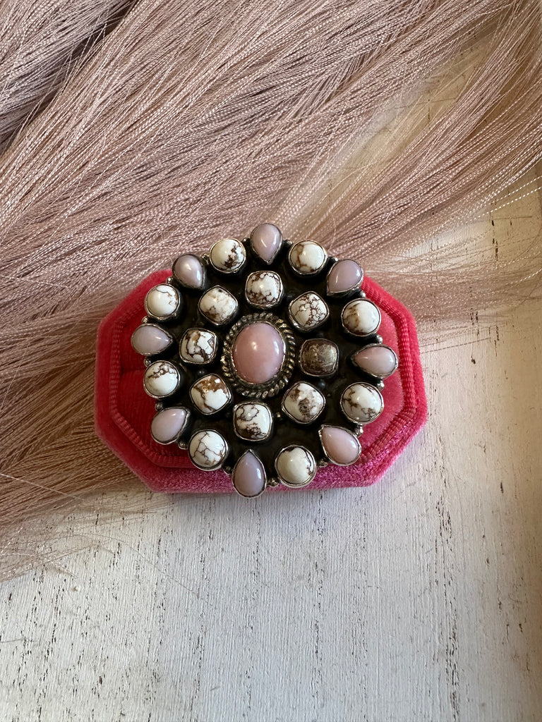Navajo Sterling Silver, Queen Pink Conch & Turquoise Cluster Adjustable Ring