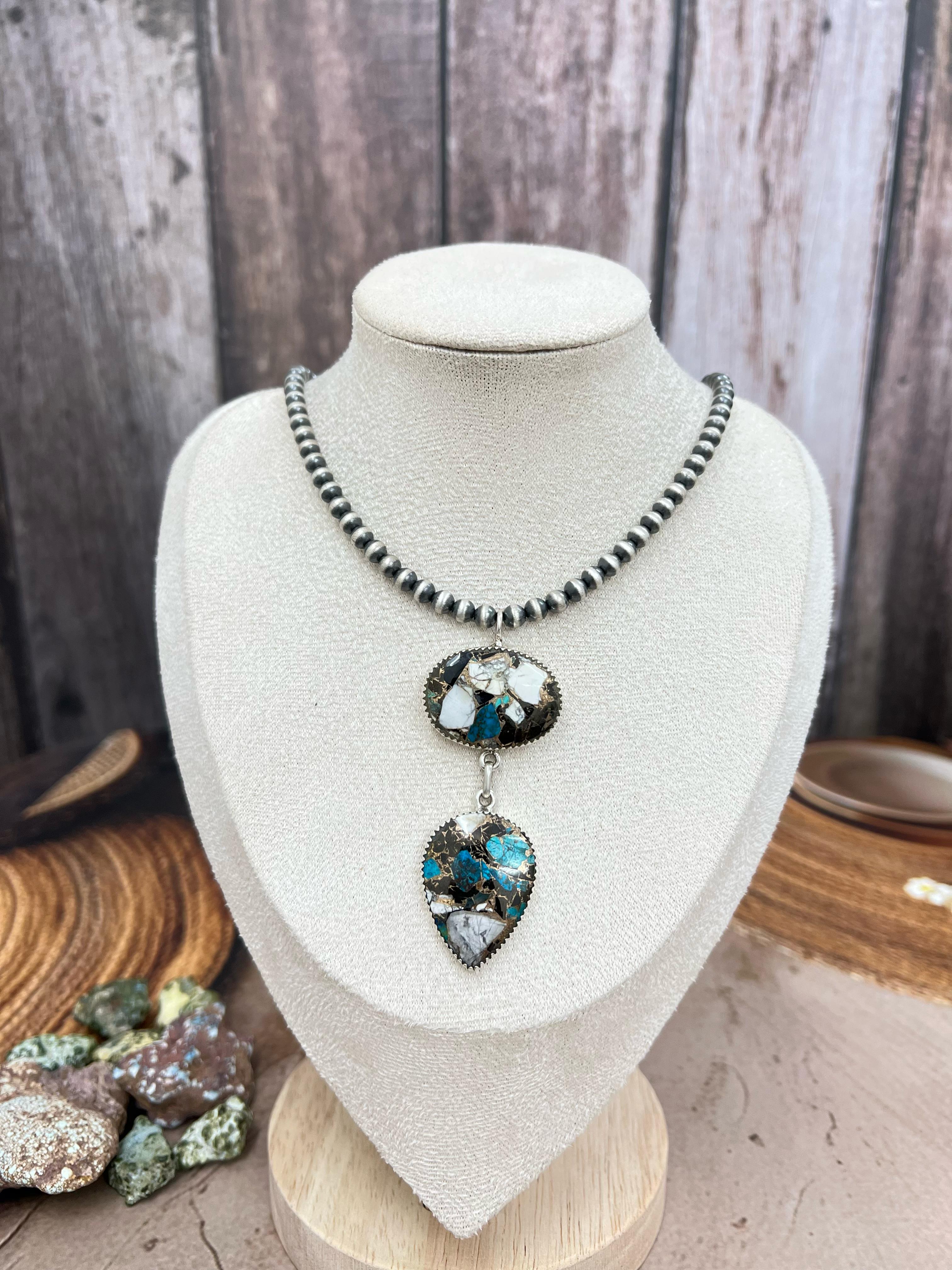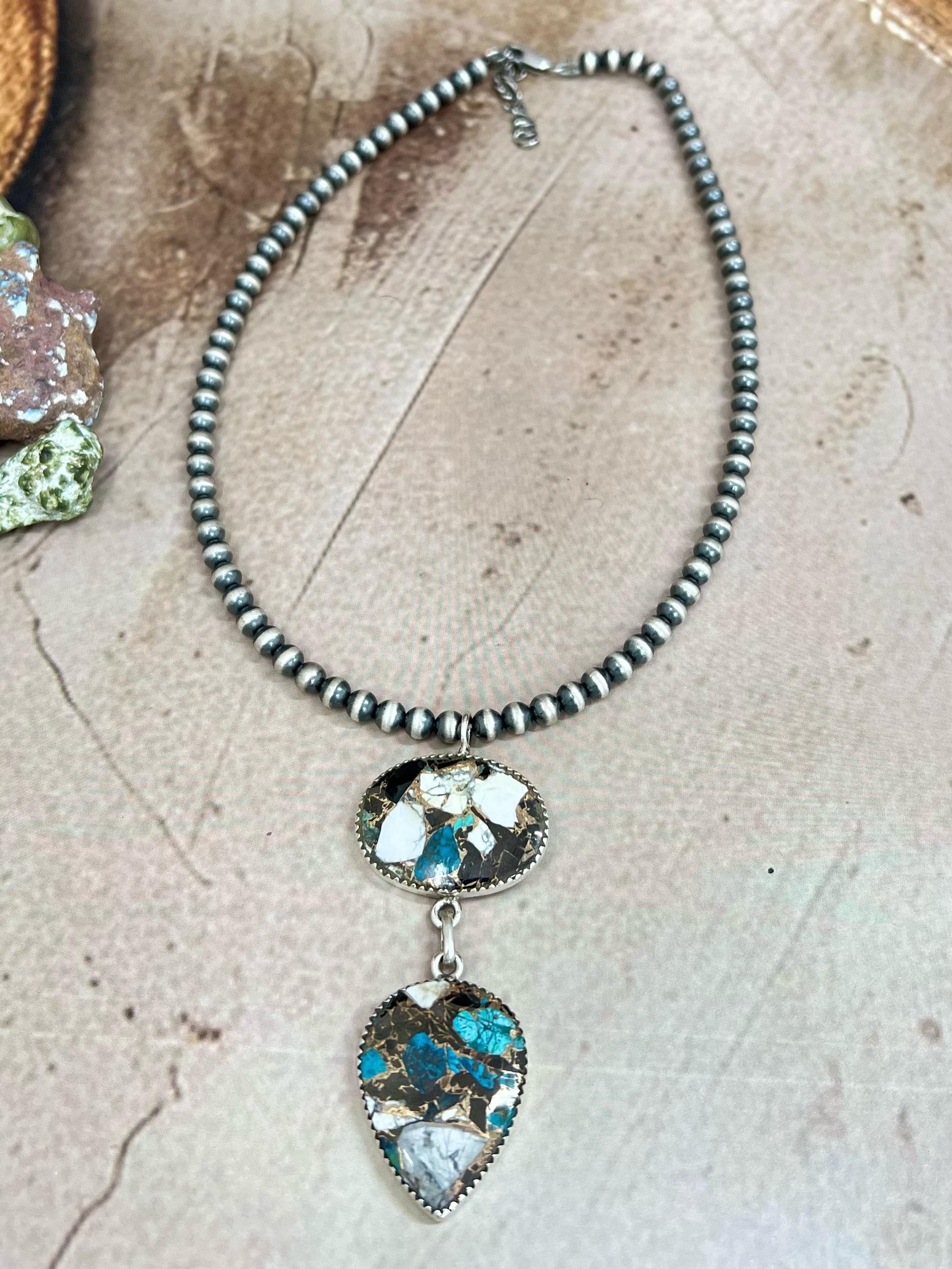 Handmade Newlander Turquoise & White Buffalo Sterling Silver Drop Necklace