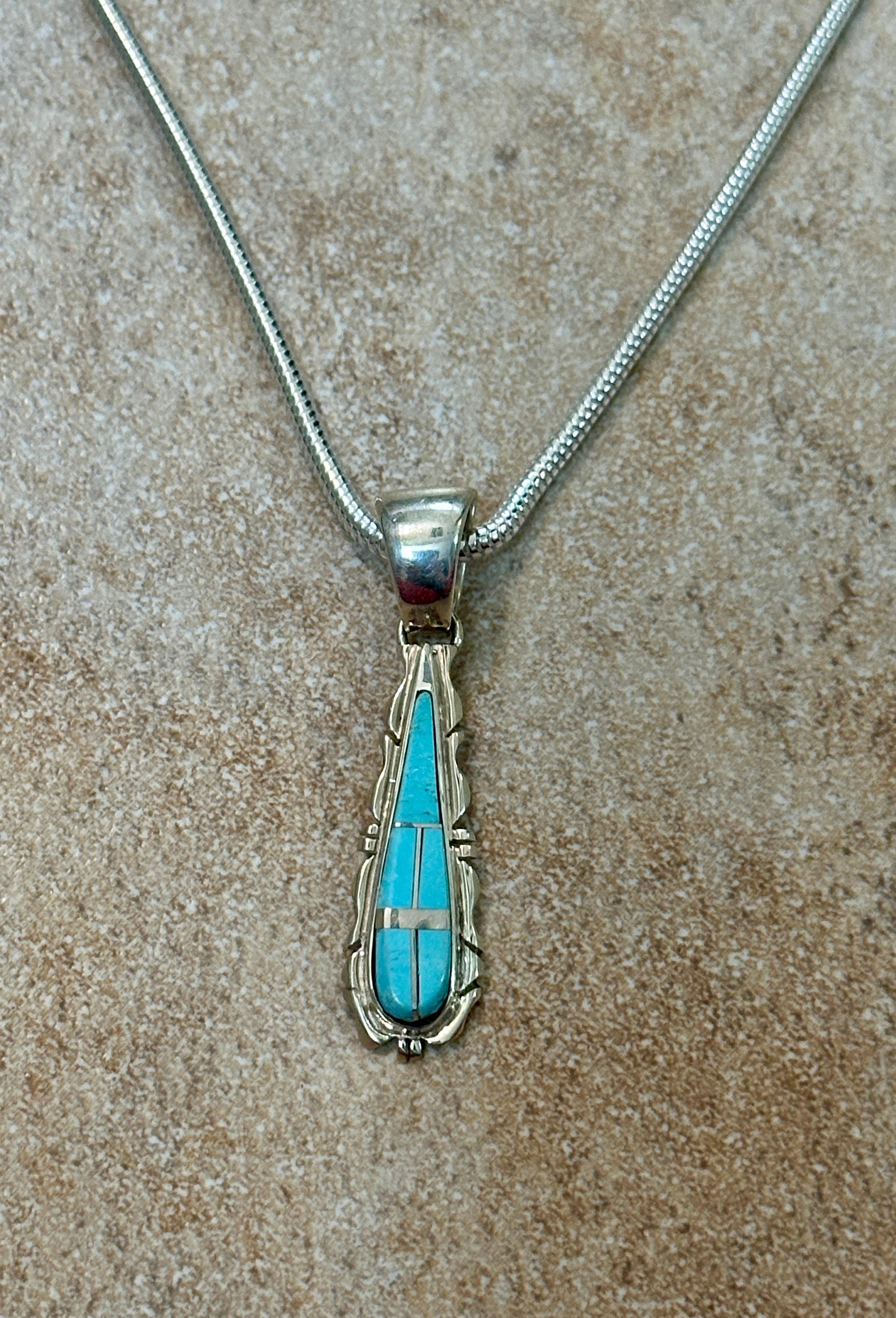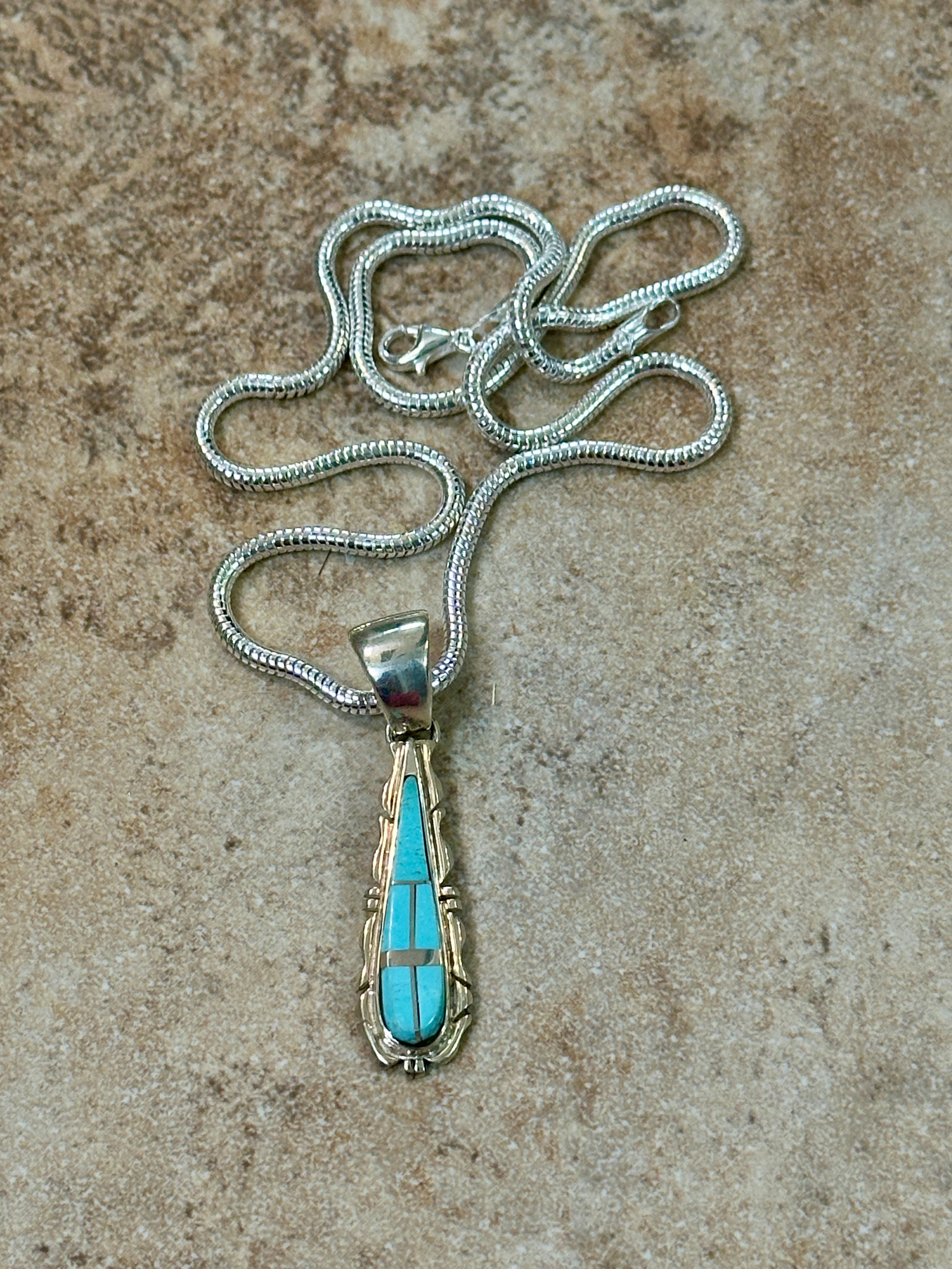 The Pendant is stamped Sterling and signed by the Artist. It measures 1.75” long and over 3/8” wide and comes with an Italian Sterling Silver Snake Chain that measures 2.4 mm and 24” long.