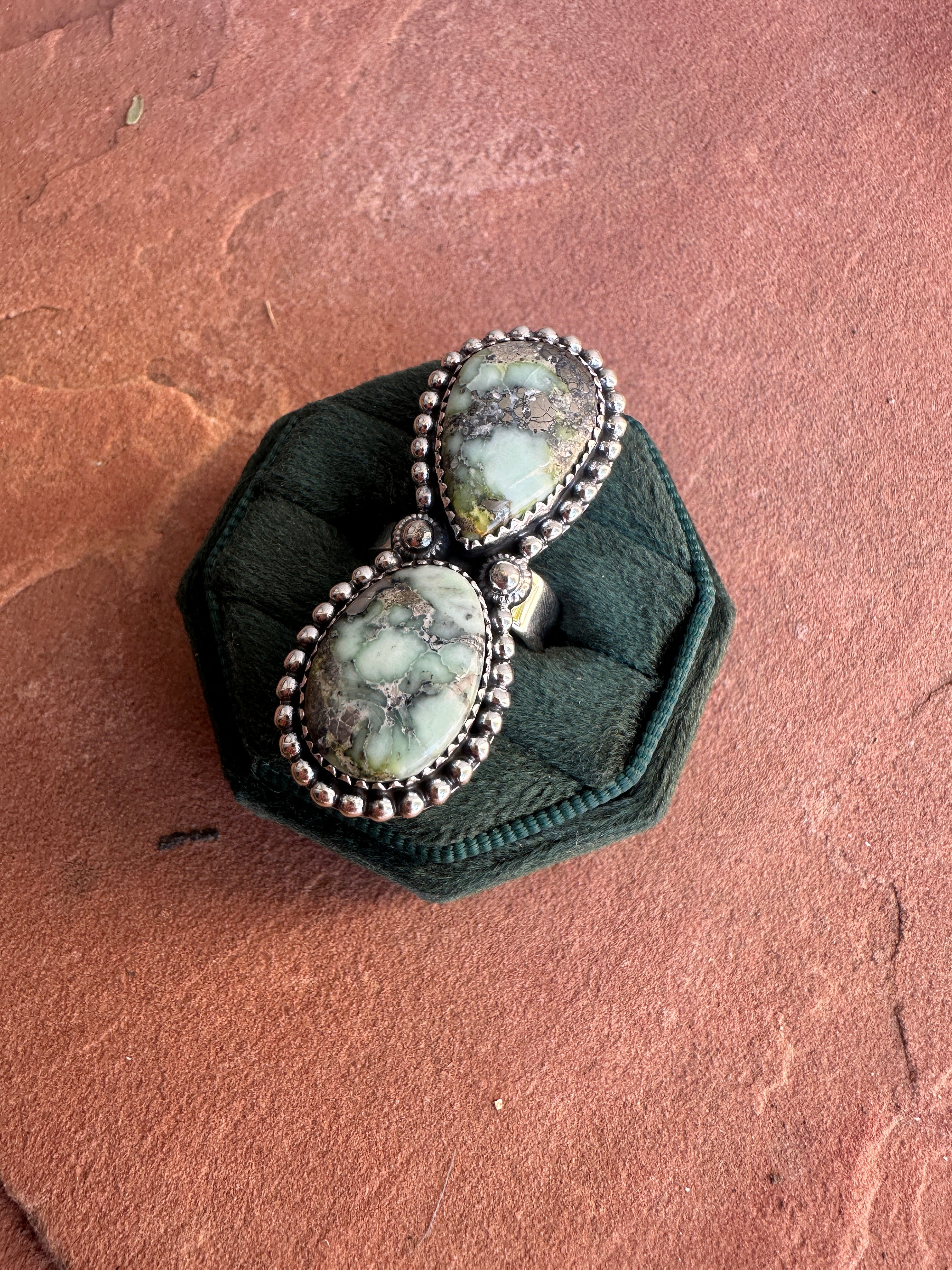 Adjustable in size to wear on any finger. Beautiful stones. Beautiful details. Really great Ring. Measuring 3 inch long and 3/4 inch wide.