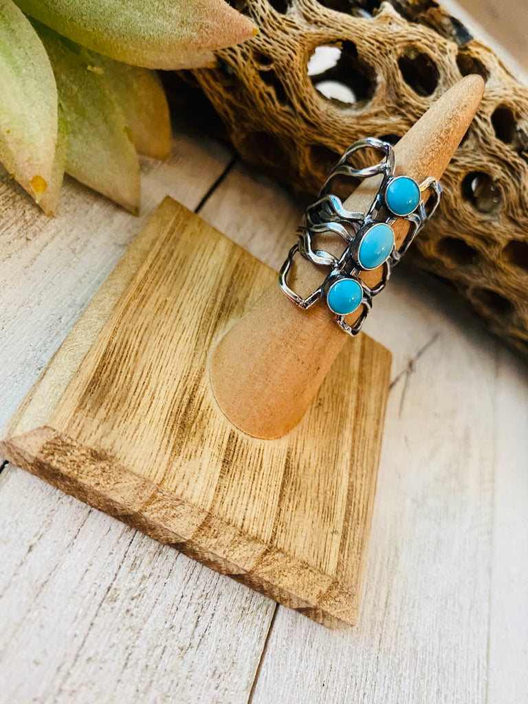 Beautiful Sterling Silver and Turquoise ring. Size 6. Such a cool design! Measuring 1 1/4 inches wide.