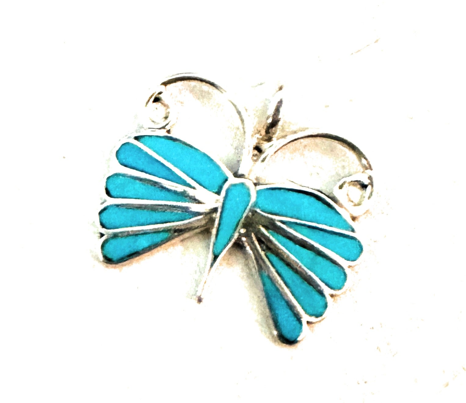Handcrafted Sterling Silver & Turquoise Inlay Butterfly Pendant. This pendant measures 1 inch long and 1 1/8 inches wide. Bale measures 1/8 of an inch across. Signed by the artist.