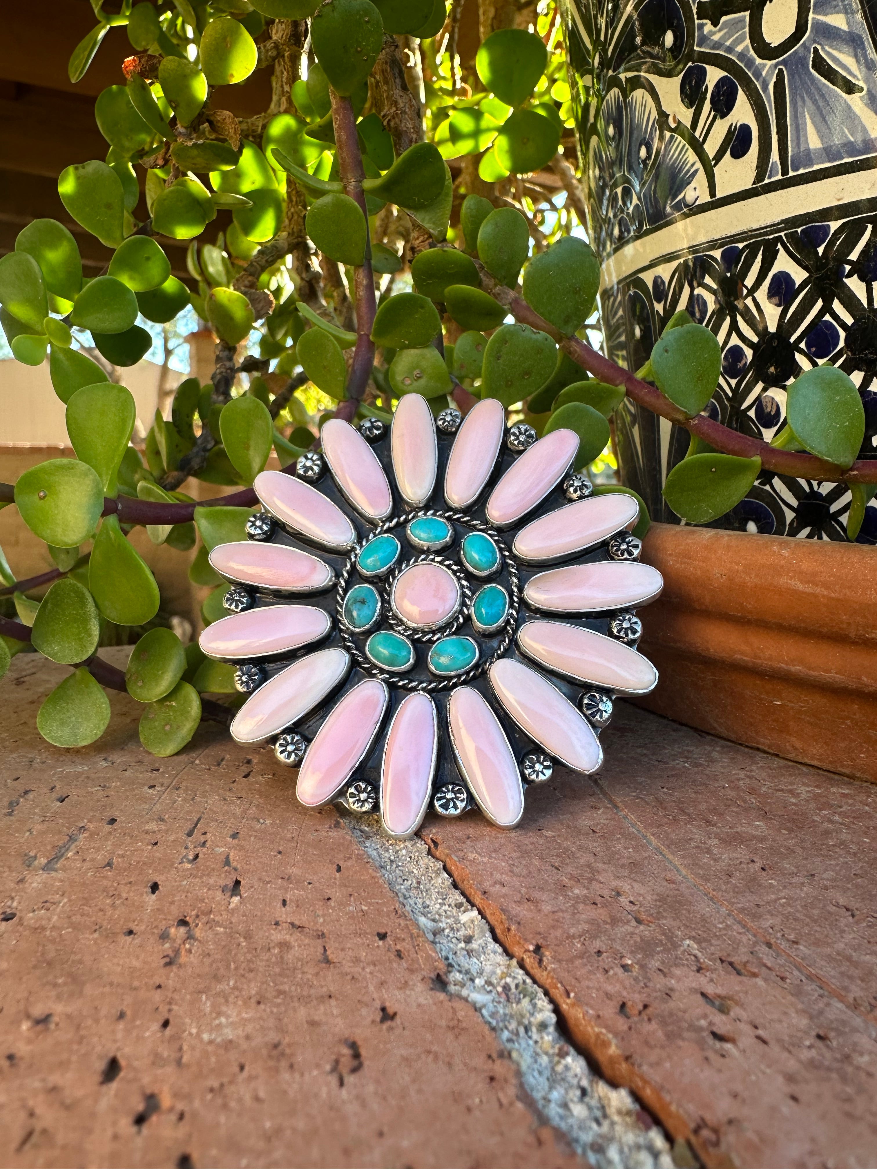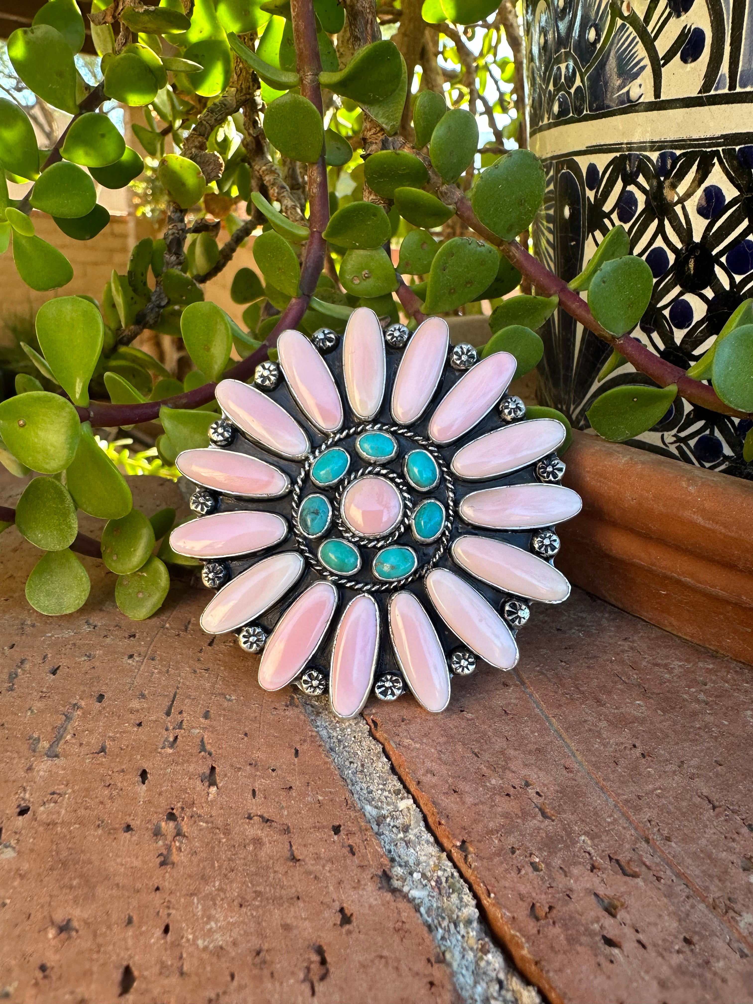 Beautiful Navajo Natural Turquoise, Queen Pink Conch Shell and Sterling Silver Adjustable Ring. Such amazing work in this piece, ring measures 2 1/2 inches in diameter. Signed by the artist and stamped Sterling.