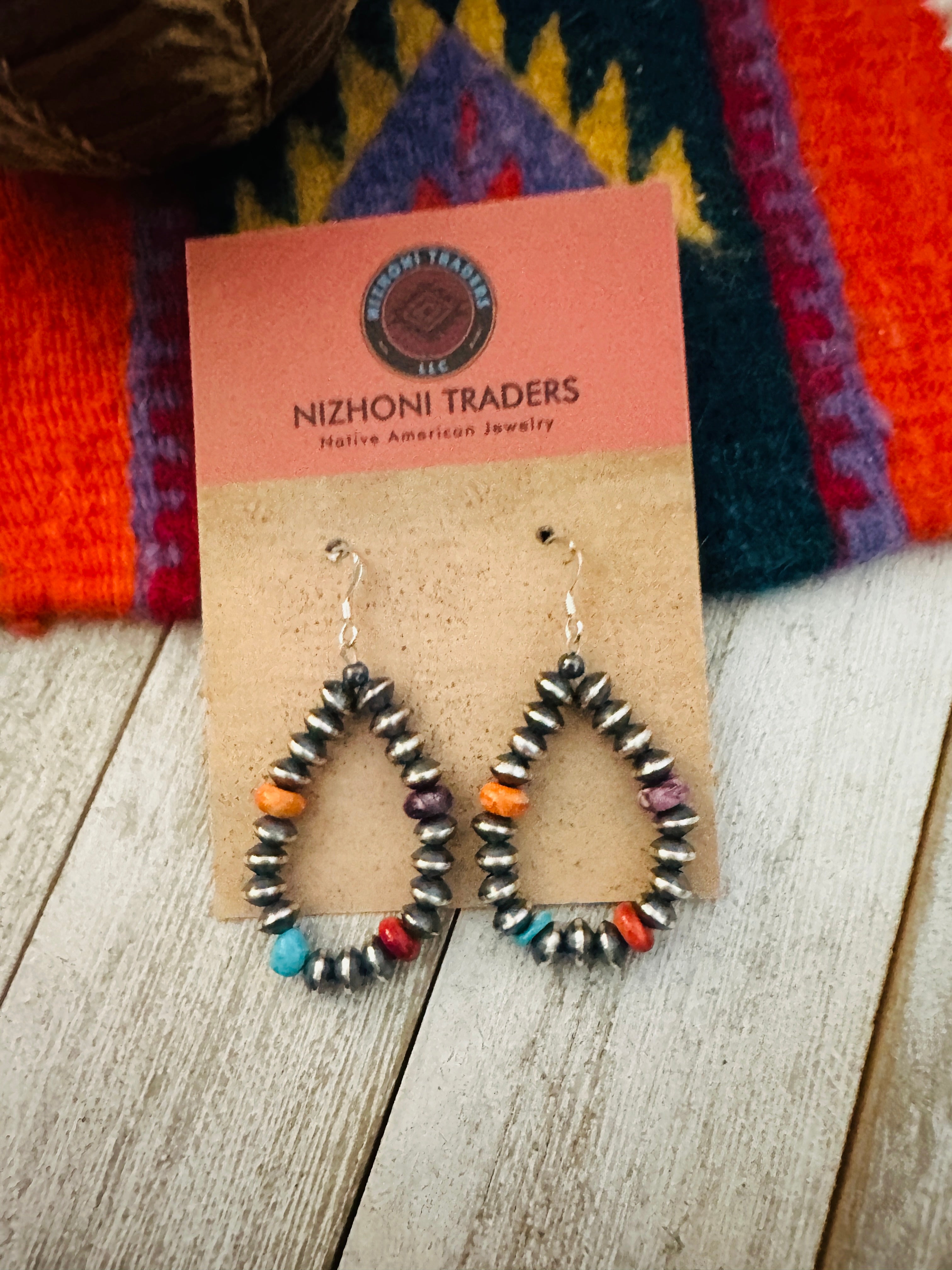 Handcrafted Multicolor Spiny Oyster Shell, Turquoise and Sterling Silver beaded dangle hoop earrings. Such a great pair for any collection! These beauties measure 2 1/8 inches long 7/8 of an inch wide.