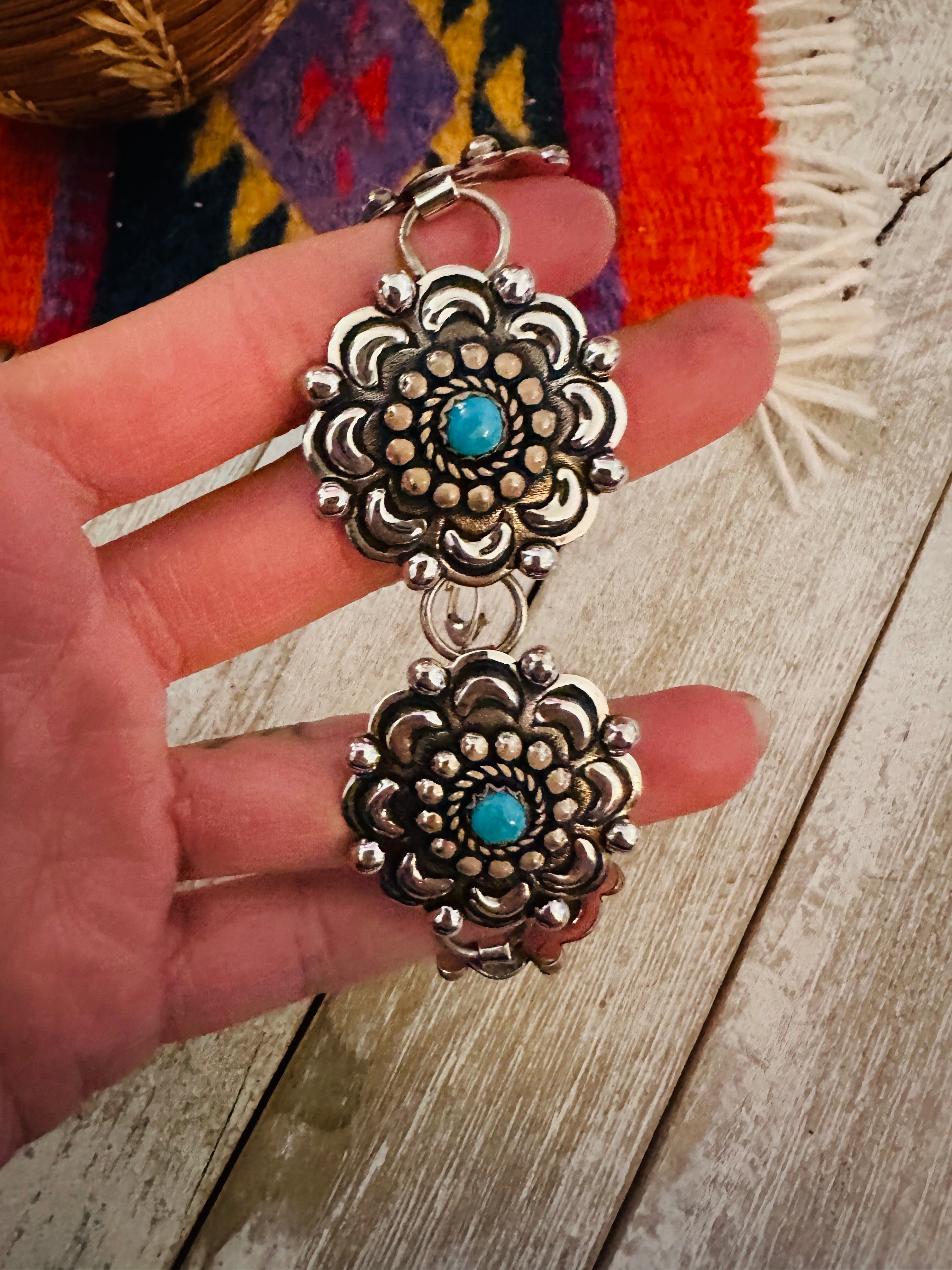 Beautiful Navajo Turquoise and Sterling Silver Concho Link Bracelet. Measuring 7 1/2 inches around and 1 5/8 inches wide. Such gorgeous craftsmanship! Signed by the artist and stamped Sterling. So stunning!