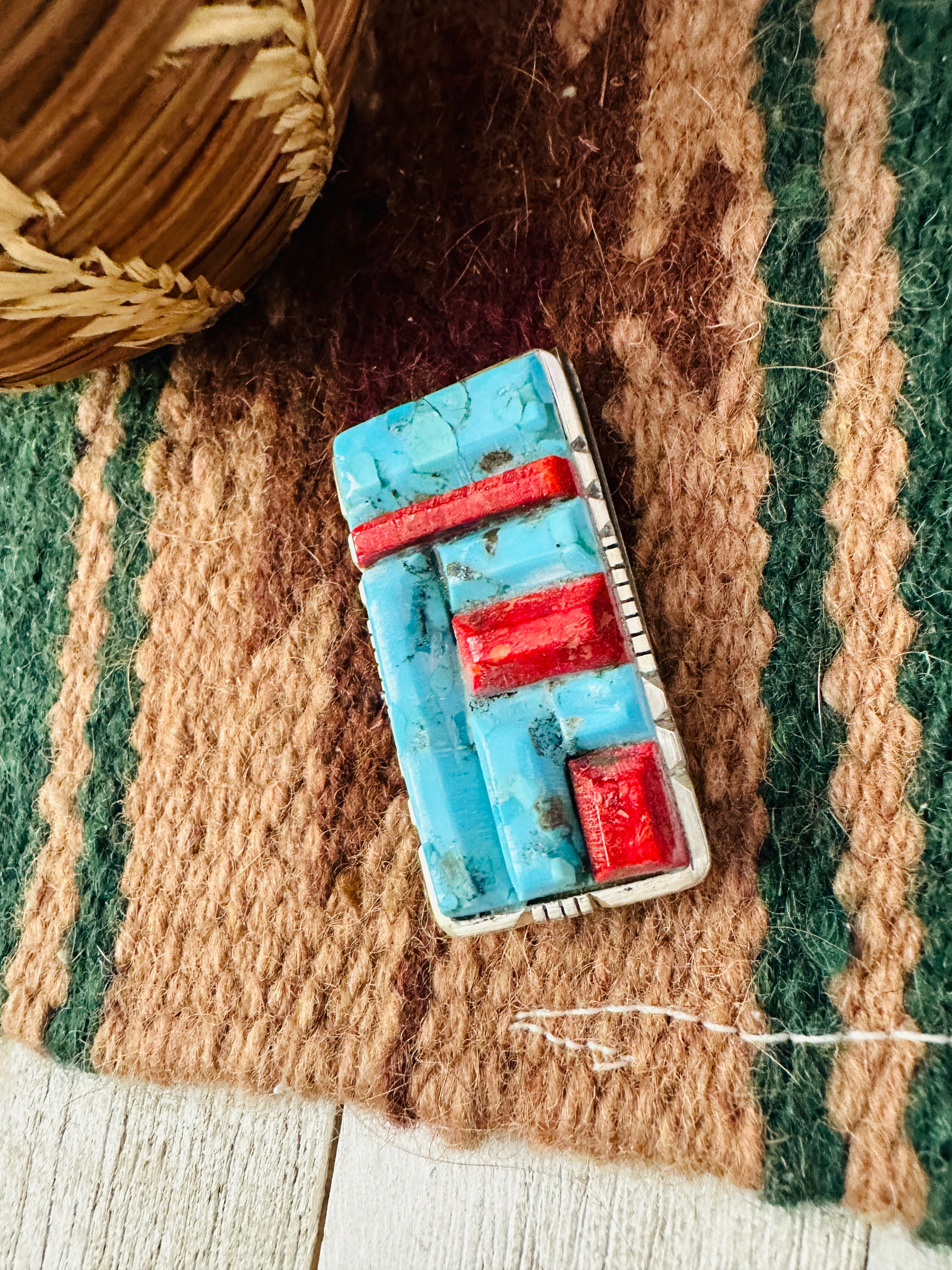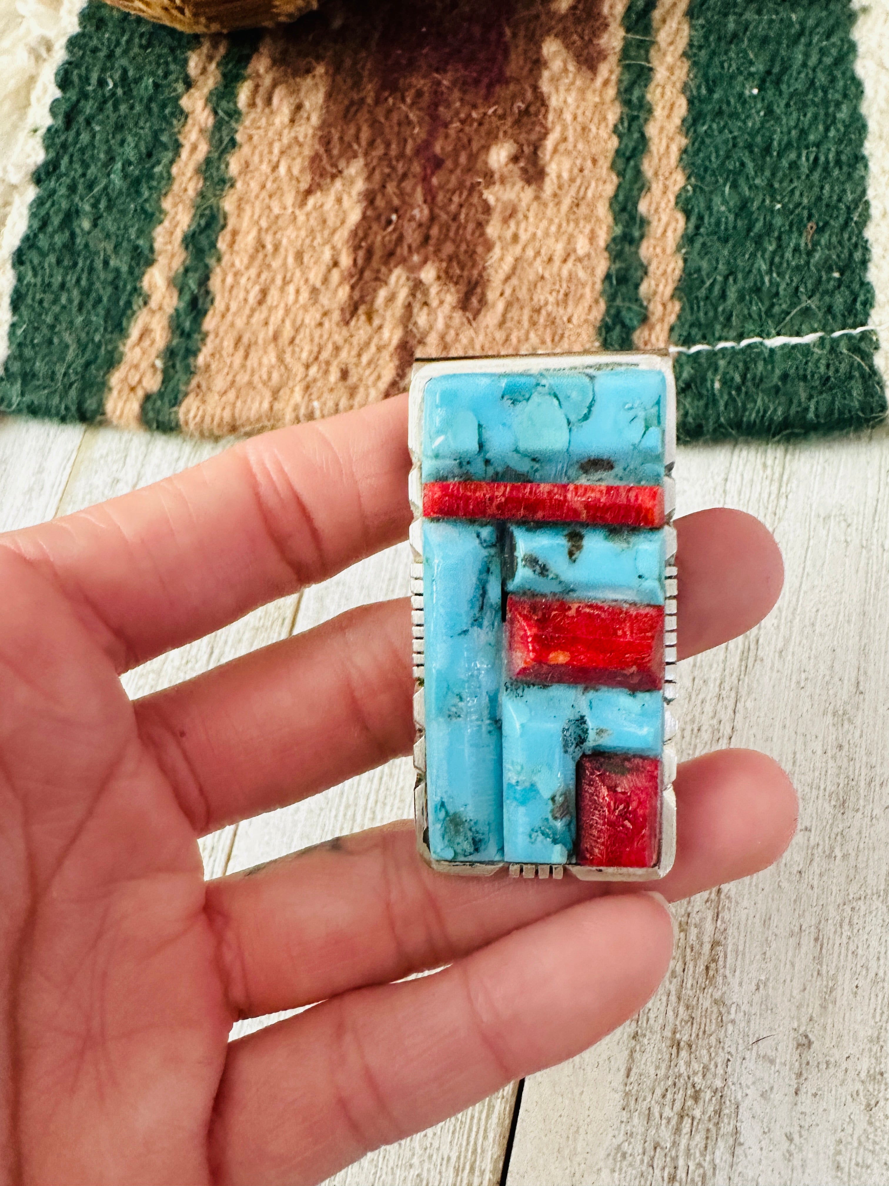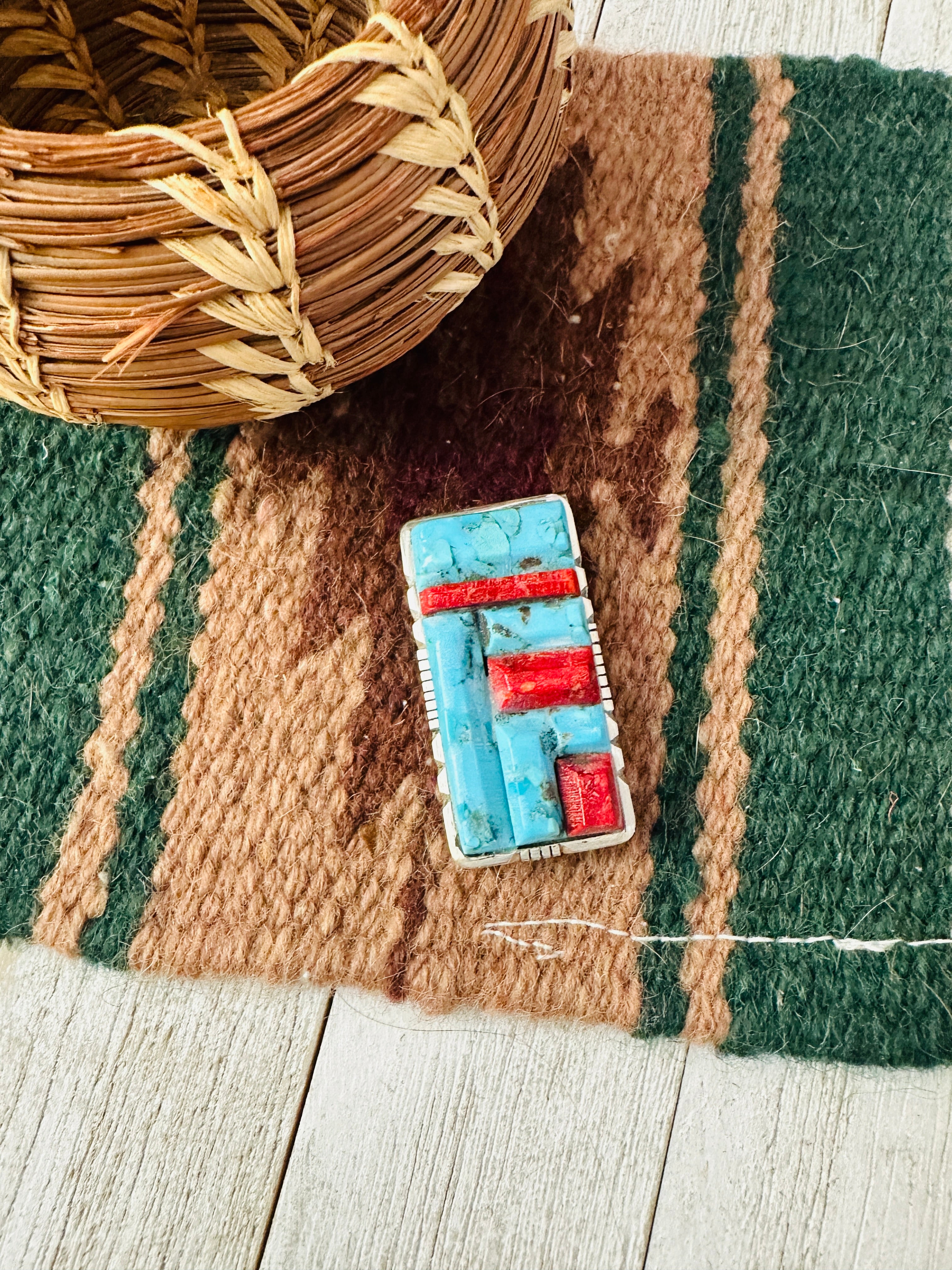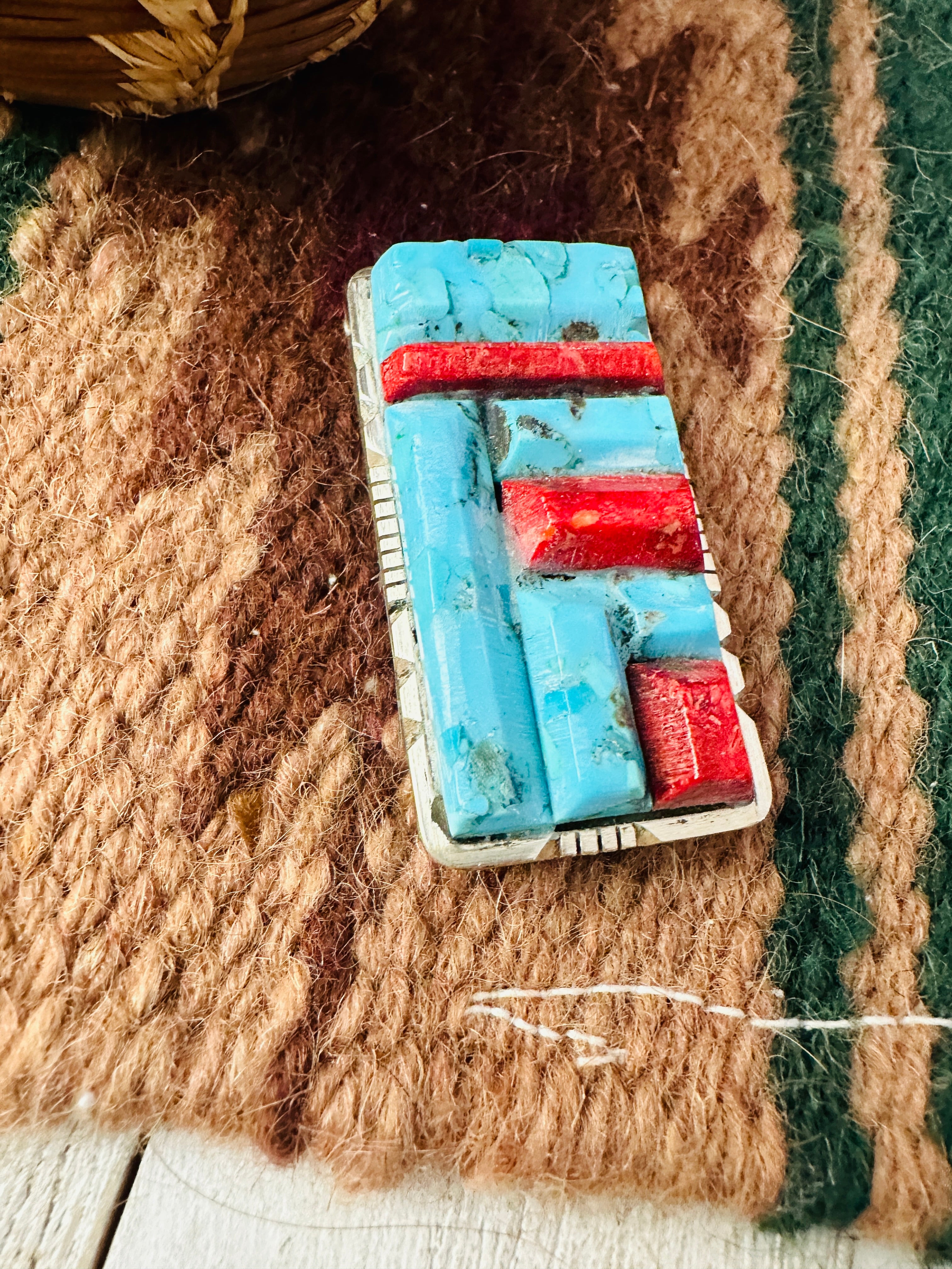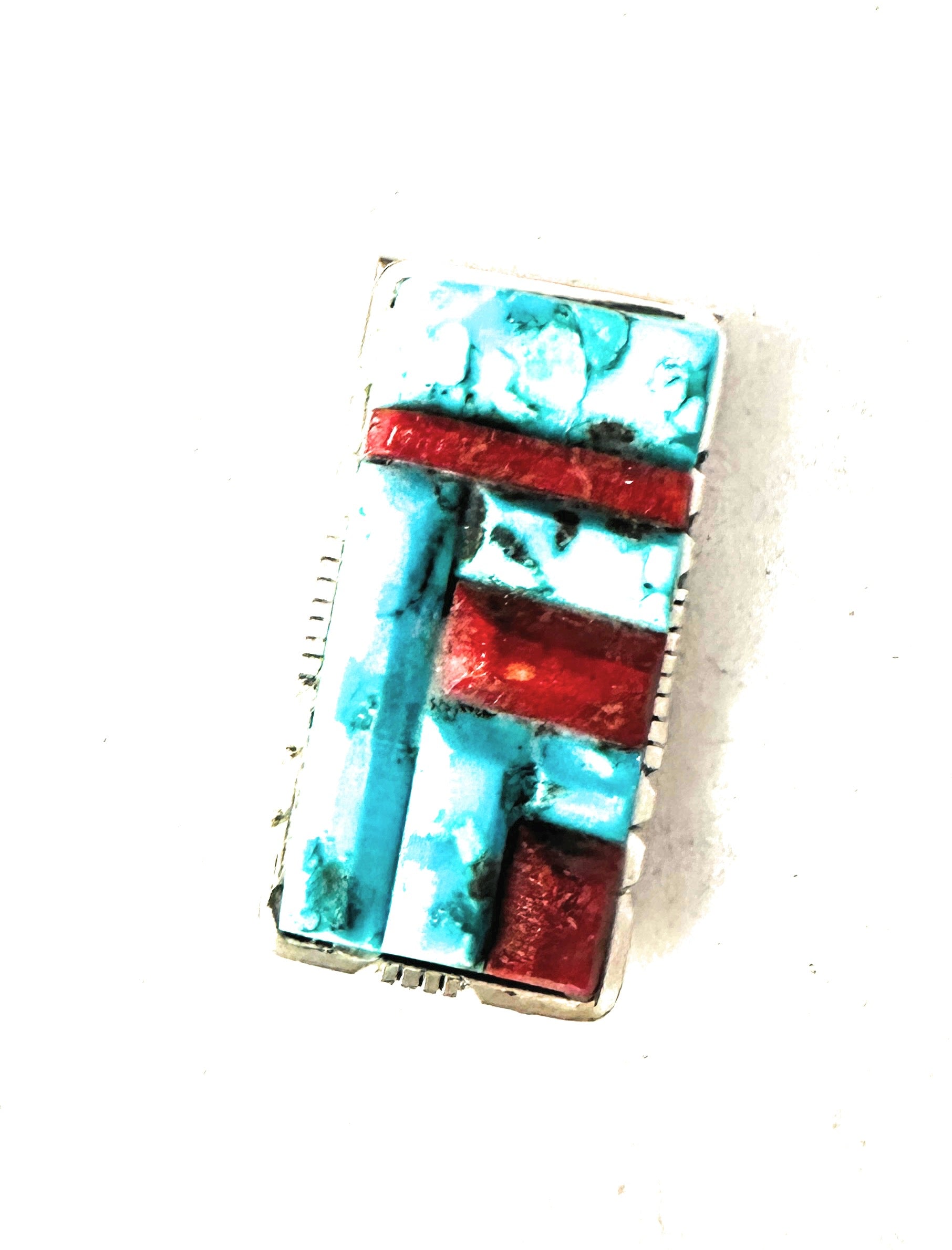 Gorgeous Turquoise, Coral and Sterling Silver Inlay Money Clip. Such a great accessory! Measures 2 1/4 inches long and 1 1/8 inches wide. Will vary in stones and design.
