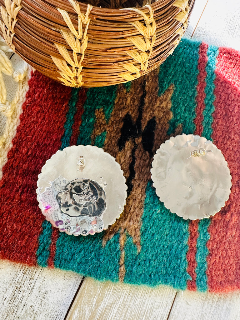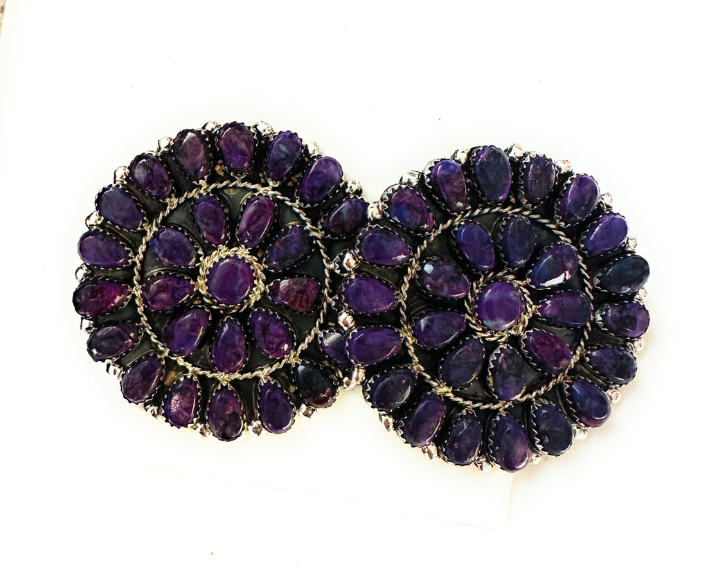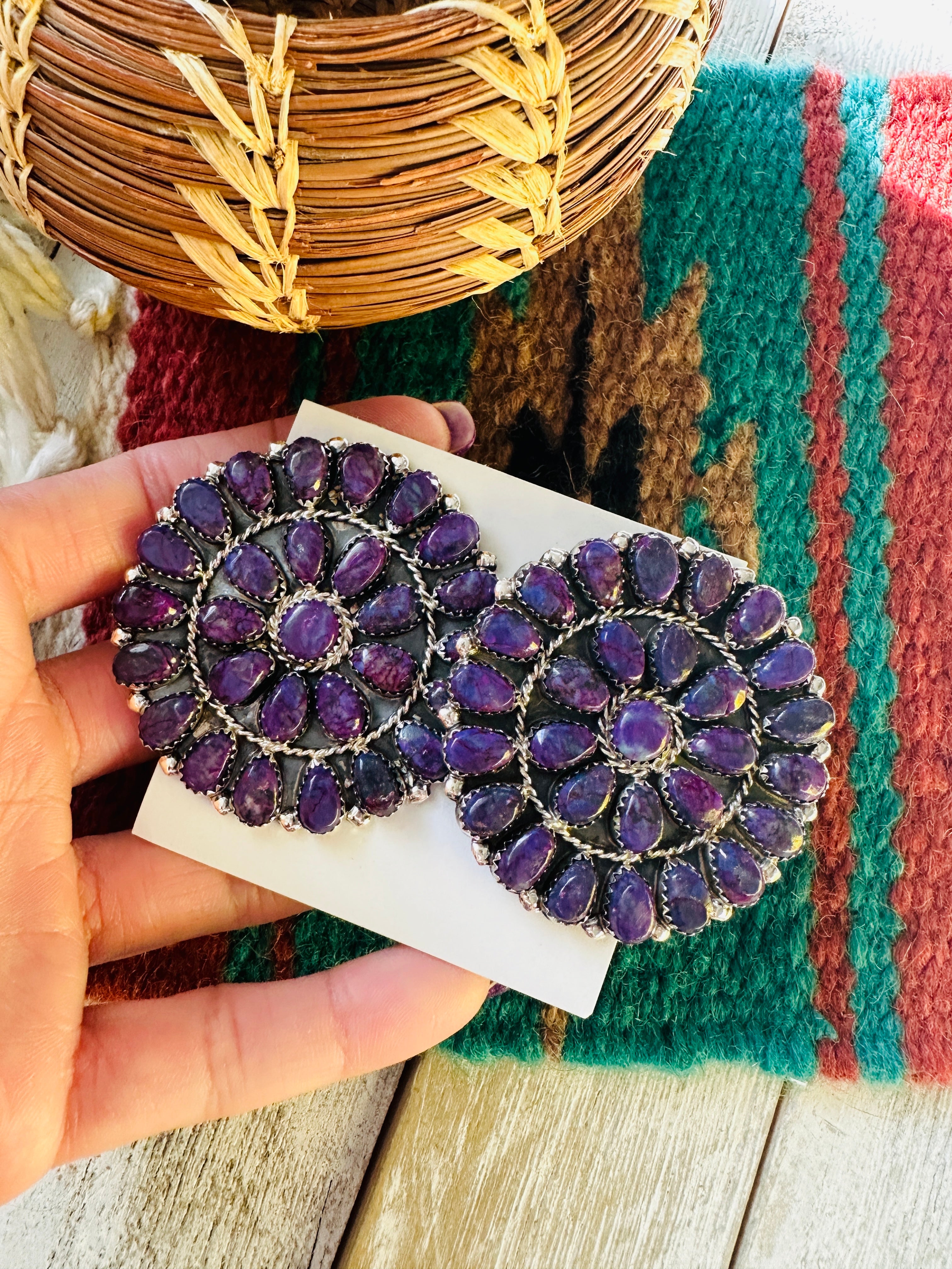 Gorgeous Navajo Purple Mojave and Sterling Silver Cluster Post Earrings. Such beautiful craftsmanship! These measure 1 7/8 inches wide. Stamped Sterling and signed by the artist.