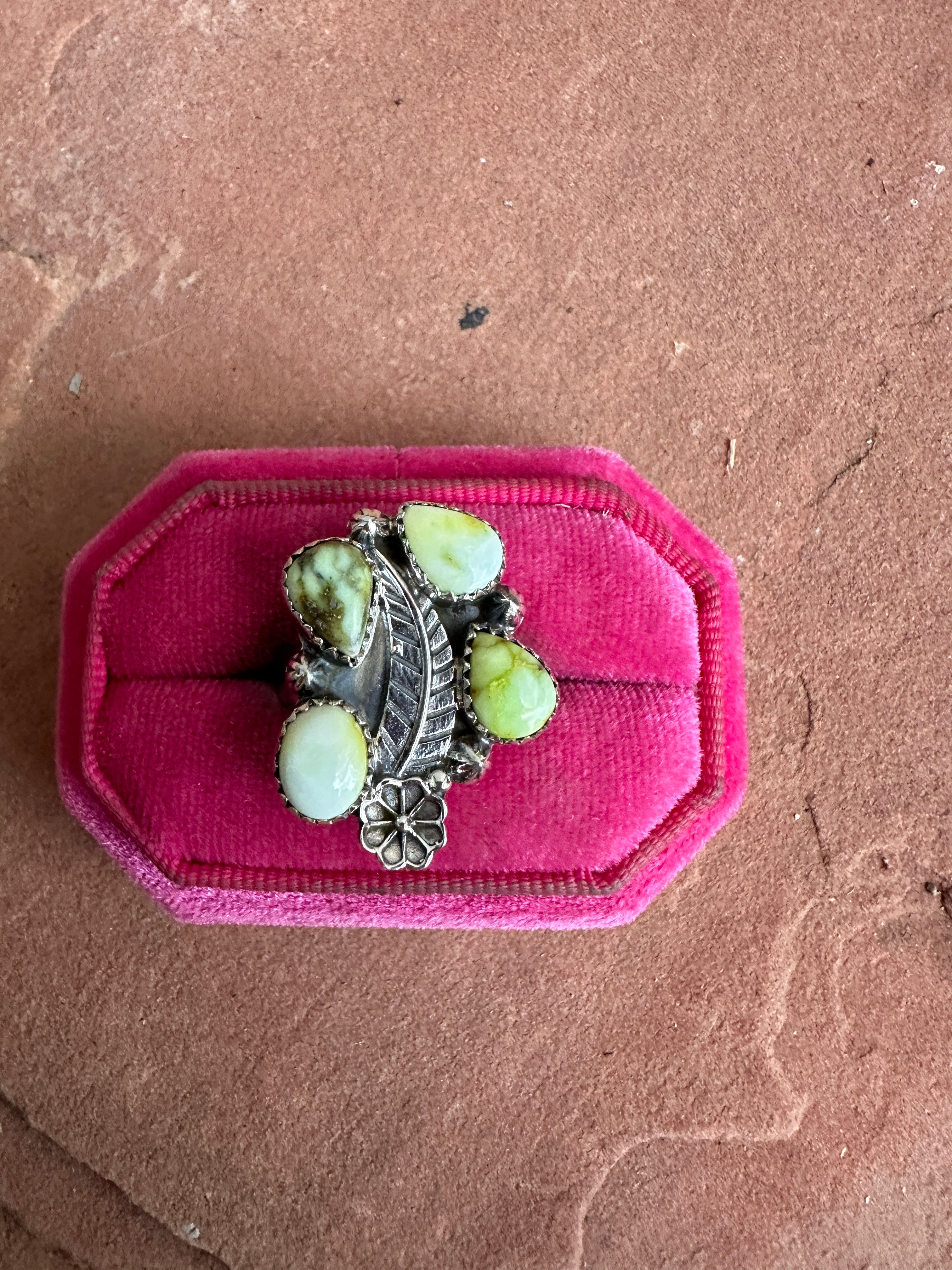 Gorgeous Navajo Sterling Silver Feather Turquoise Ring. Adjustable in size to wear on any finger. Beautiful blue Turquoise stones. Beautiful silversmith details. Really great Ring. Measuring right under 1/2 of an inch wide. Signed by Artist and stamped Sterling.