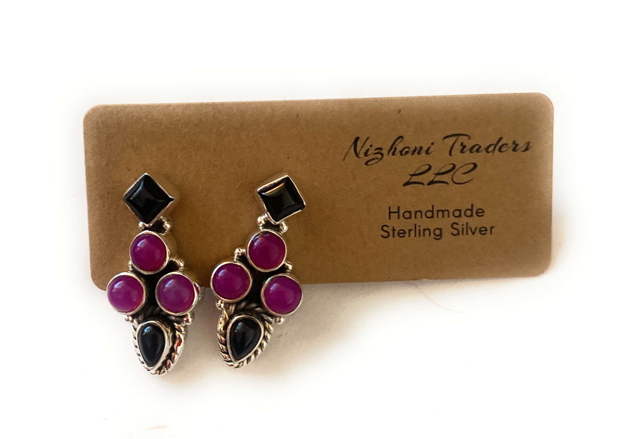 Handmade Pink and Black Onyx Sterling Silver Post Earrings Signed Nizhoni