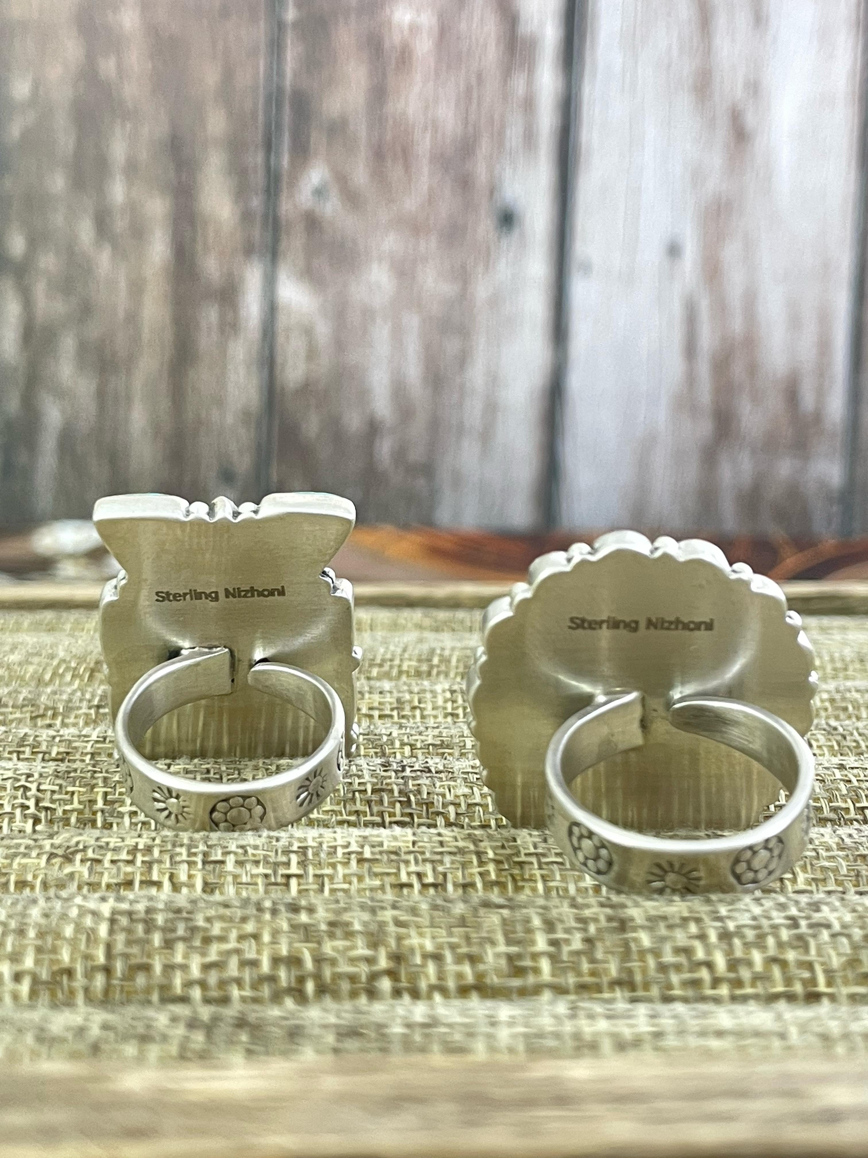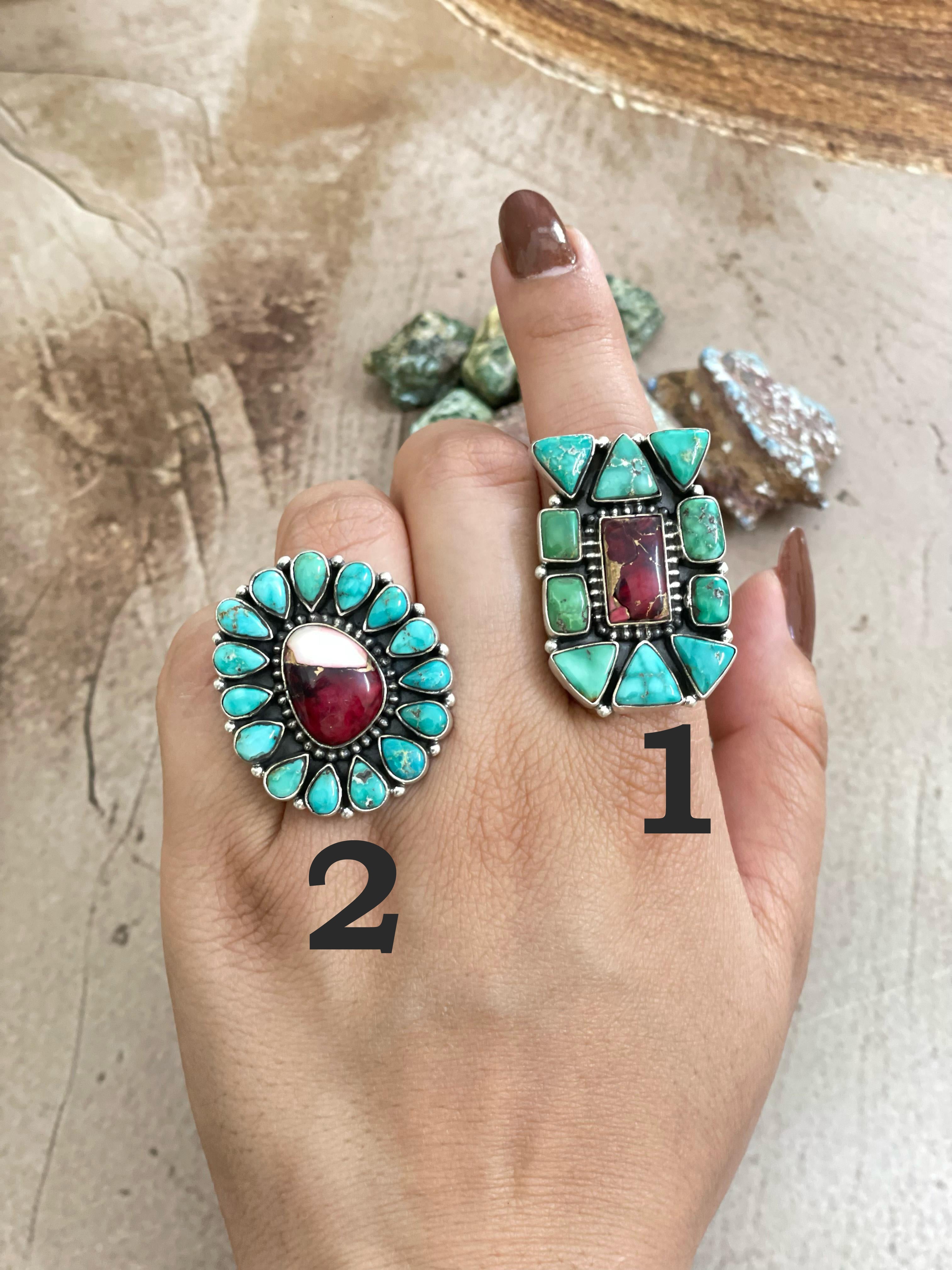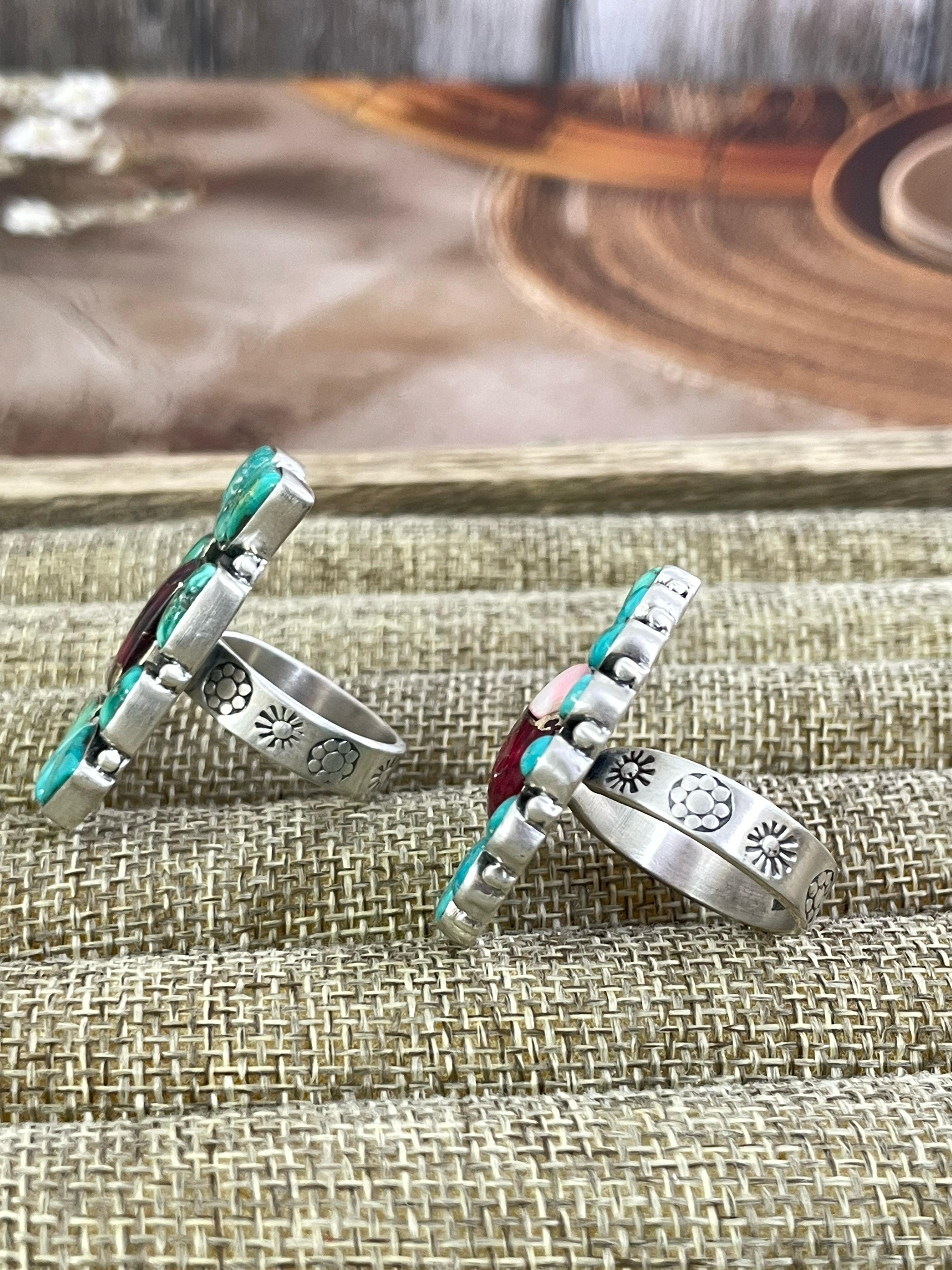 Handmade Silver Sterling Red Rose Dahlia with Emerald Valley Turquoise Adjustable Ring with Signed Nizhoni