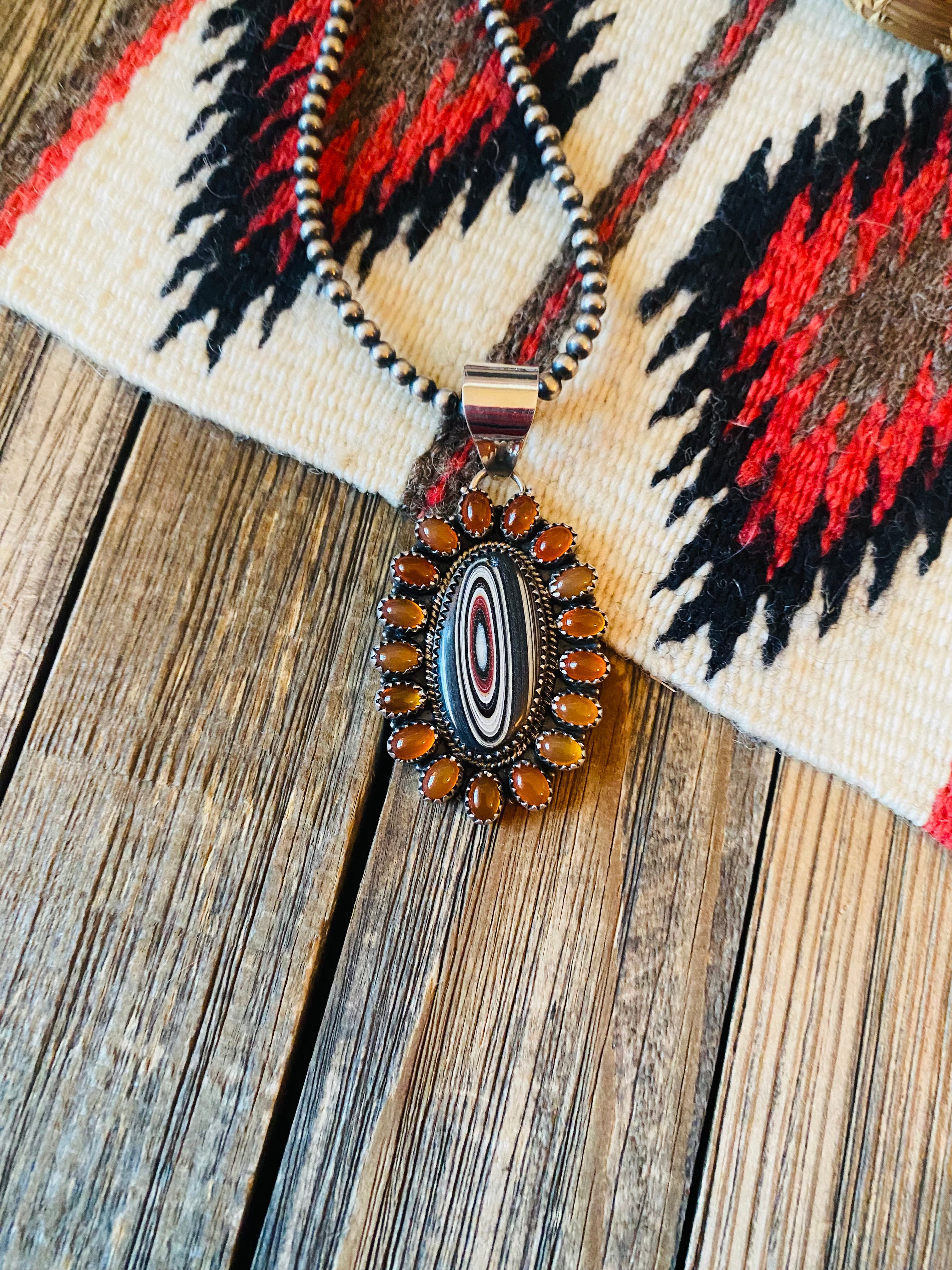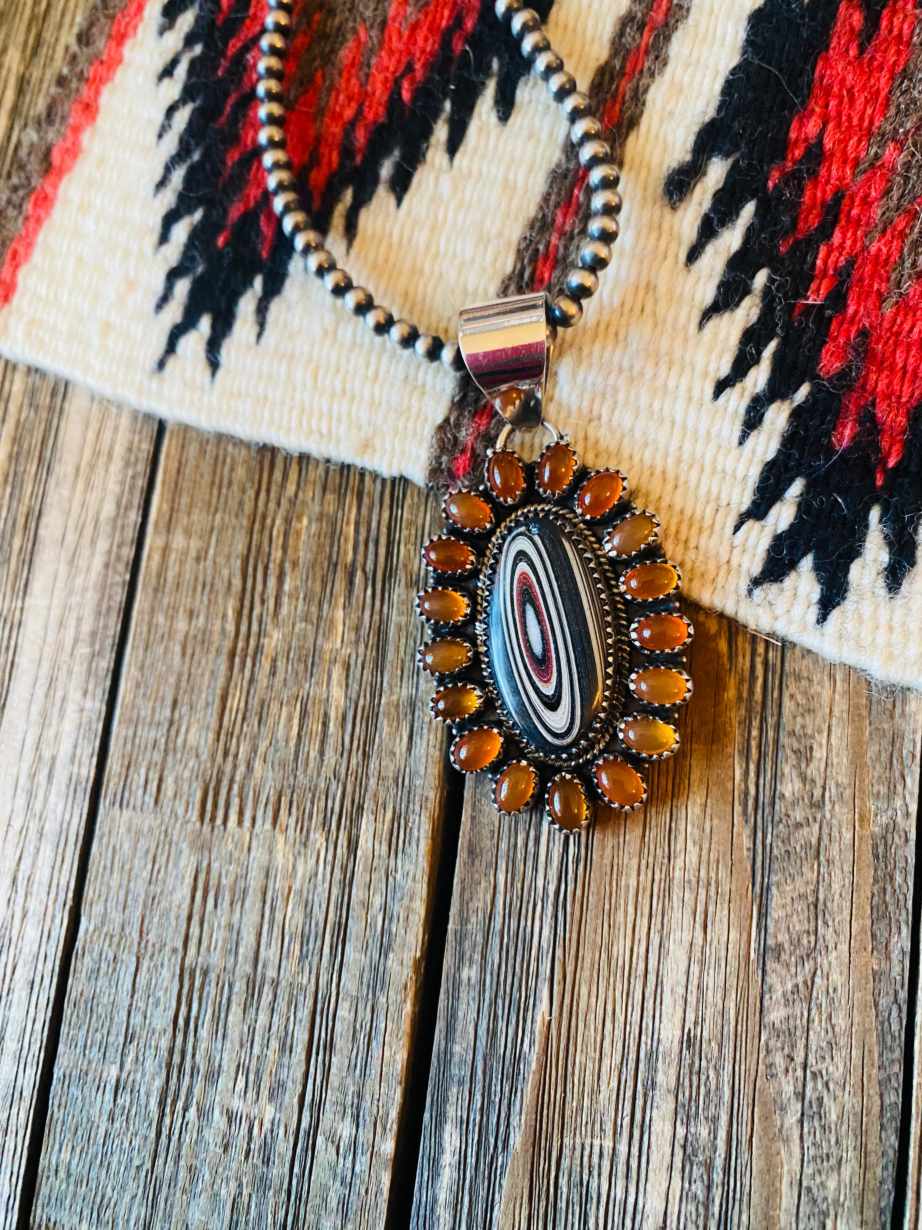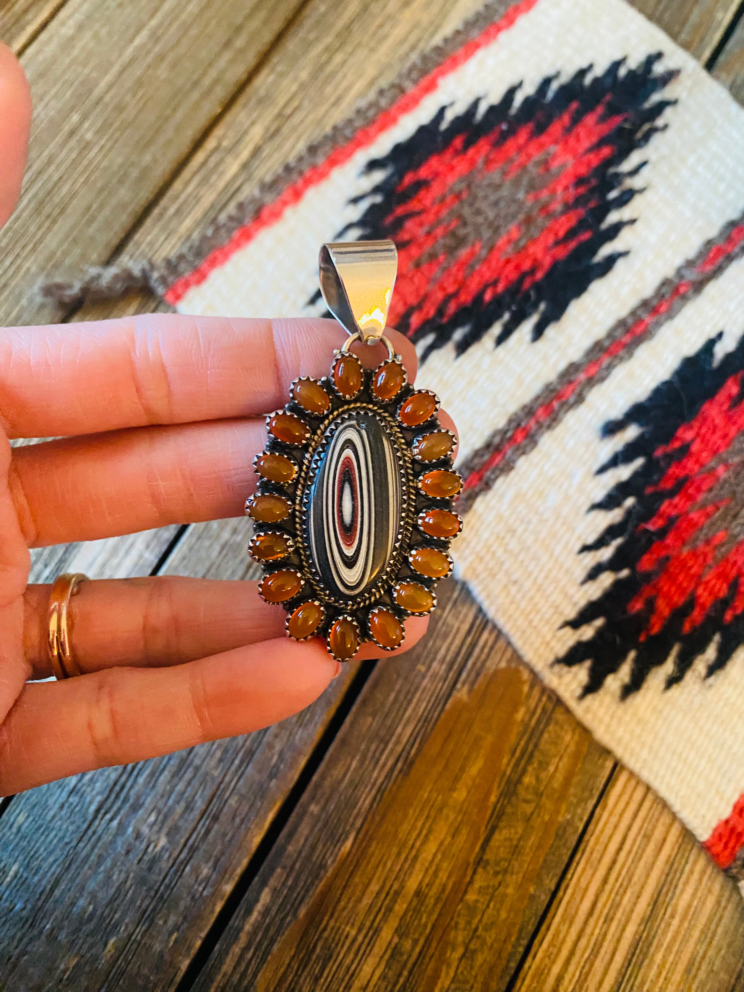 Beautiful Handmade Fordite, Garnet and Sterling Silver Cluster Pendant. Such amazing stones in this piece! Pendant measures 2 1/2 inches long and 1 1/4 inches wide. Bale measures just over 3/8 of an inch across. Stamped Sterling and Nizhoni. Pendant only!