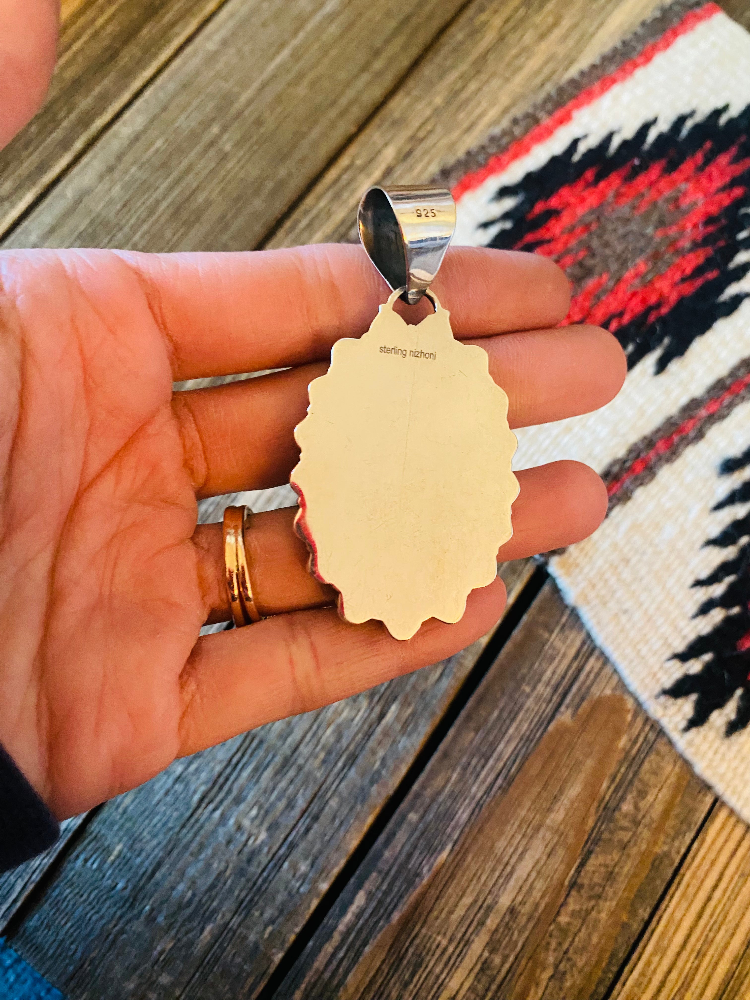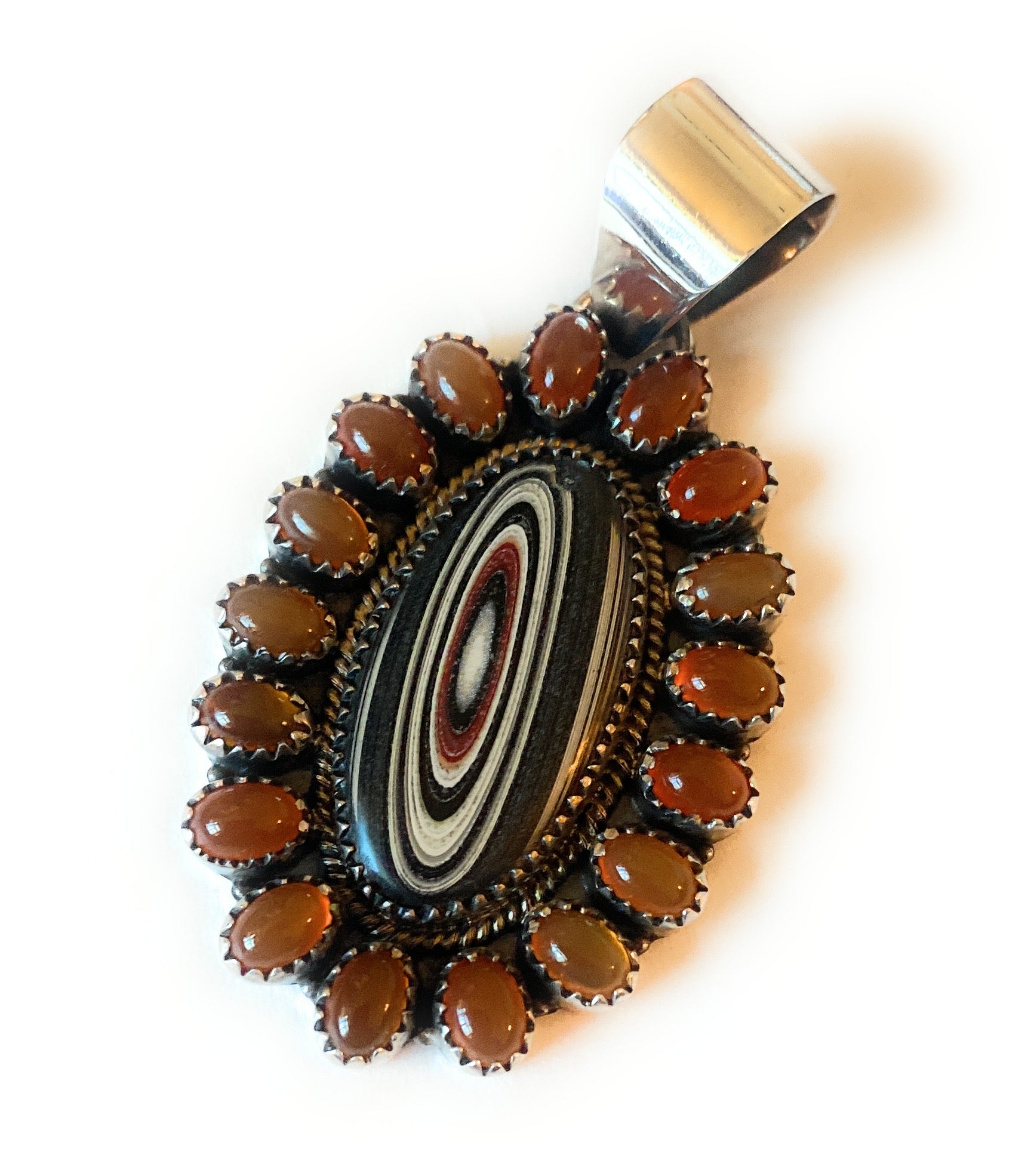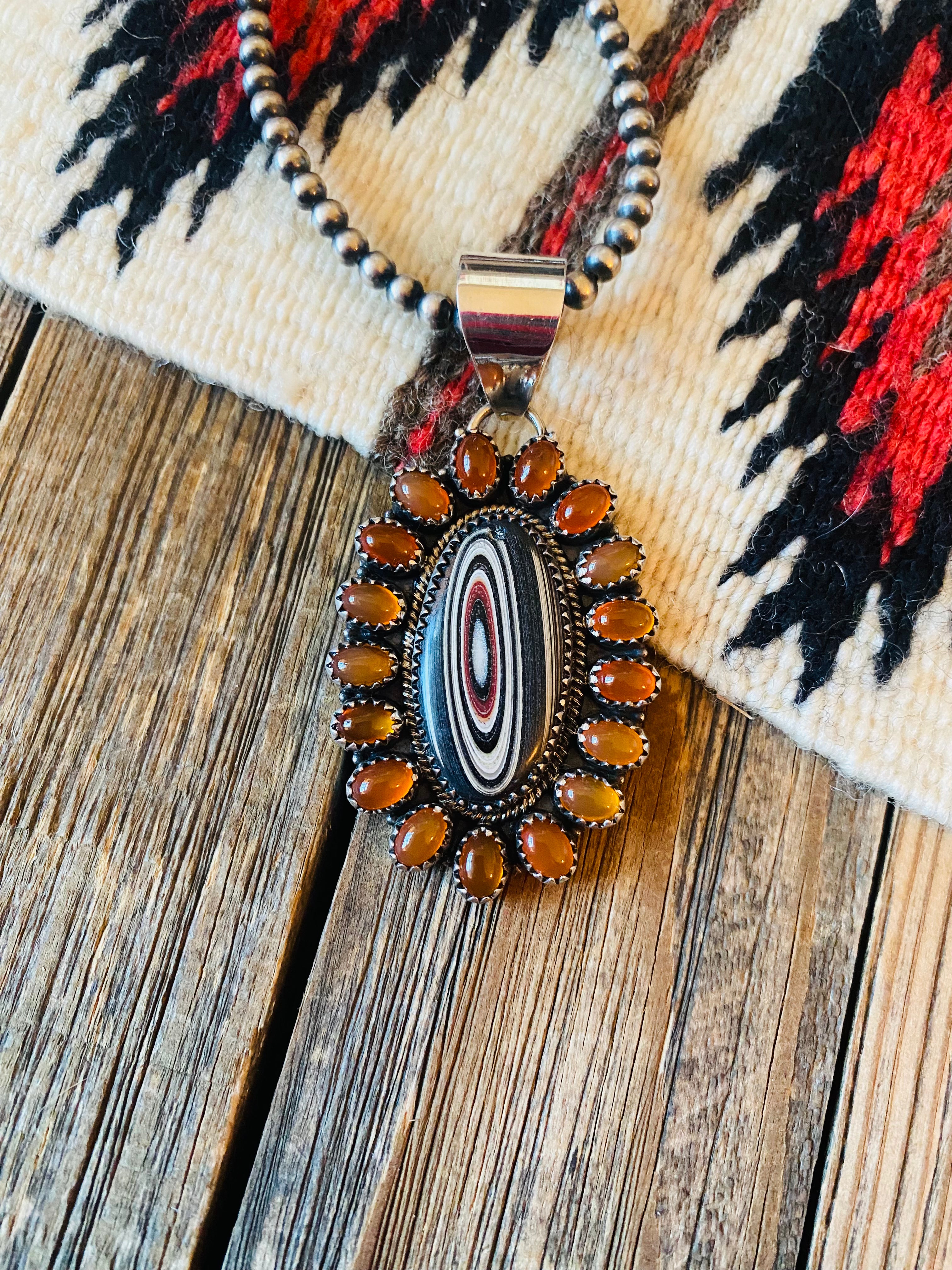 Beautiful Handmade Fordite, Garnet and Sterling Silver Cluster Pendant. Such amazing stones in this piece! Pendant measures 2 1/2 inches long and 1 1/4 inches wide. Bale measures just over 3/8 of an inch across. Stamped Sterling and Nizhoni. Pendant only!