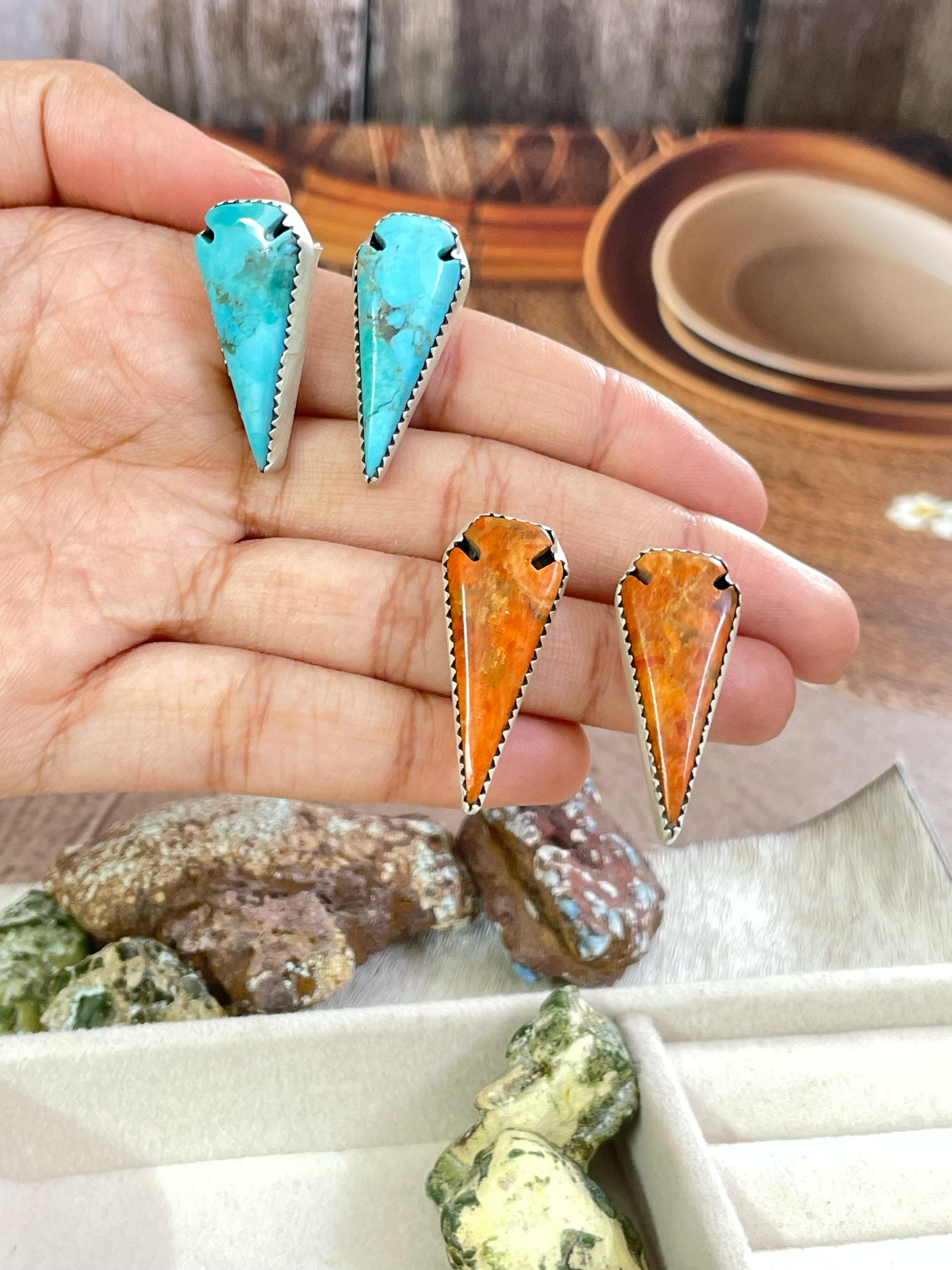 Handmade Sterling Silver Kingman and Orange Mojave Turquoise Post Earrings with Signed Nizhoni