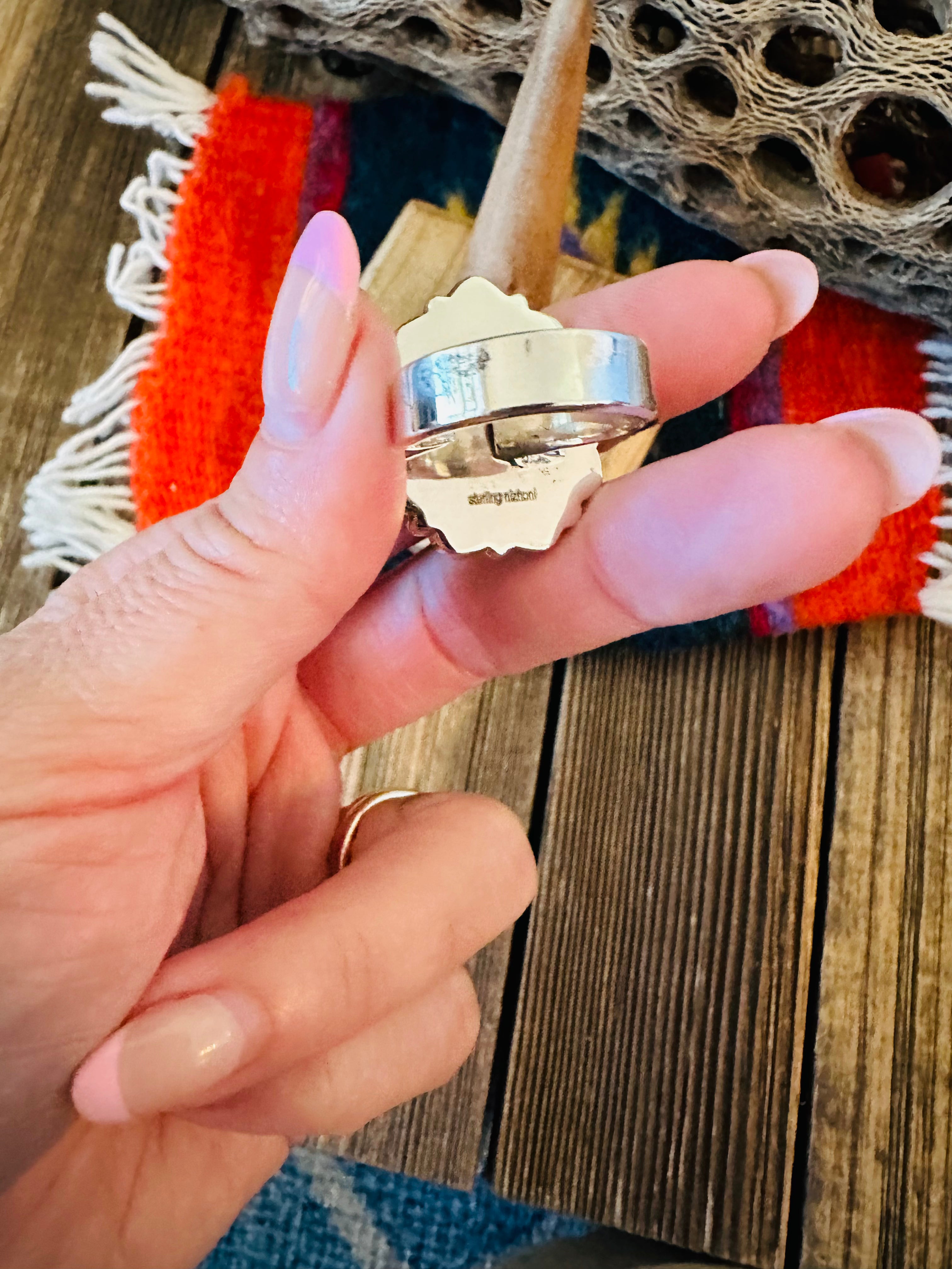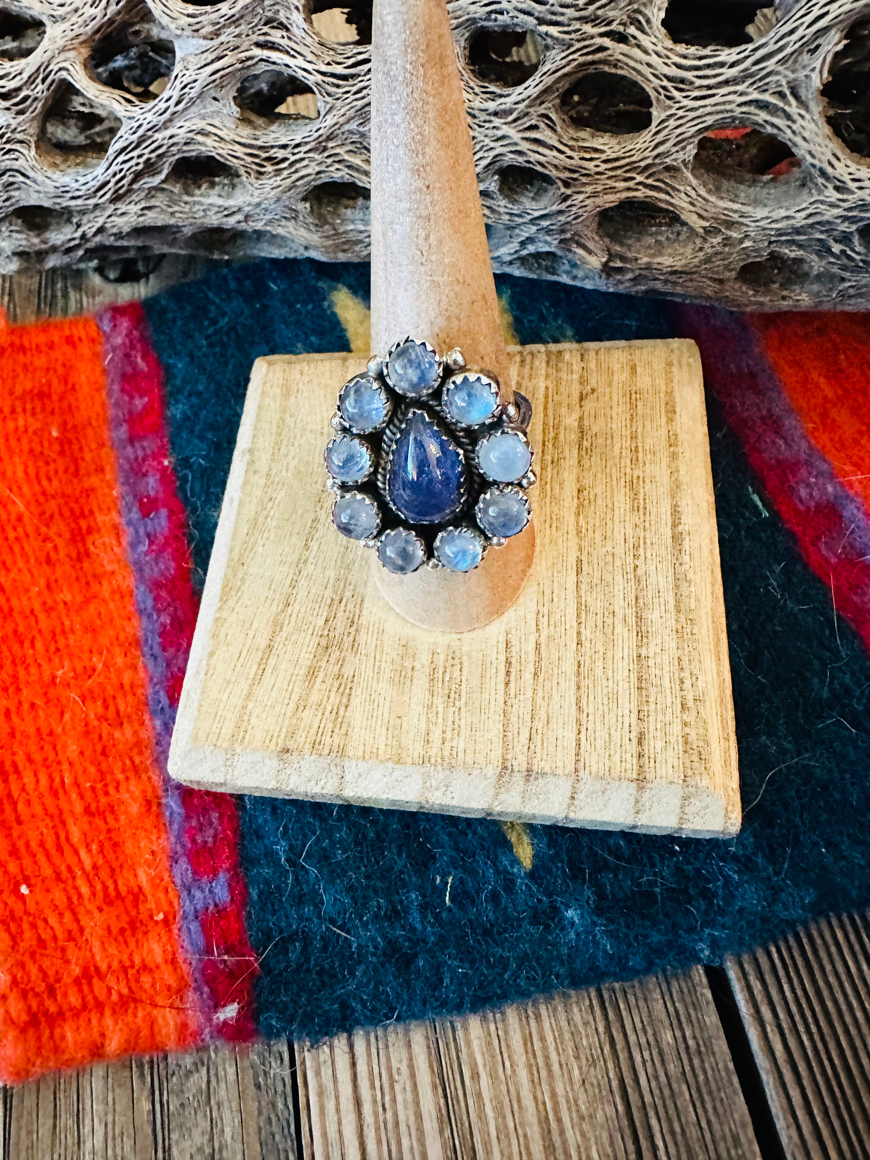 Gorgeous Handmade Sterling Silver and Moon Stone Cluster Ring. Size is adjustable. Measures 1 1/8 inches long and 1 inch wide. Stamped Sterling and Nizhoni.