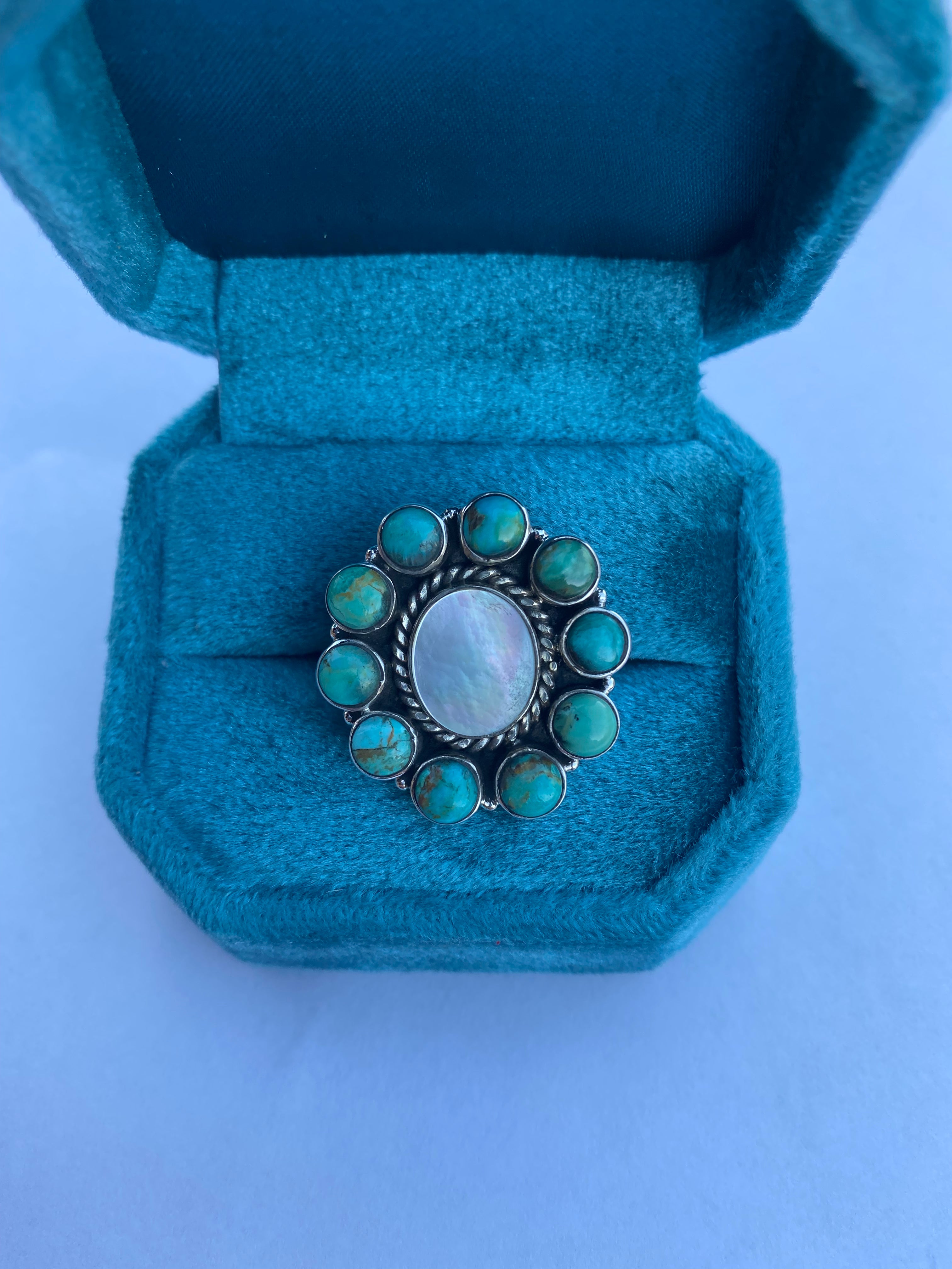 Handmade Sterling Silver Mother of Pearl & Kingman Turquoise Cluster Adjustable Ring