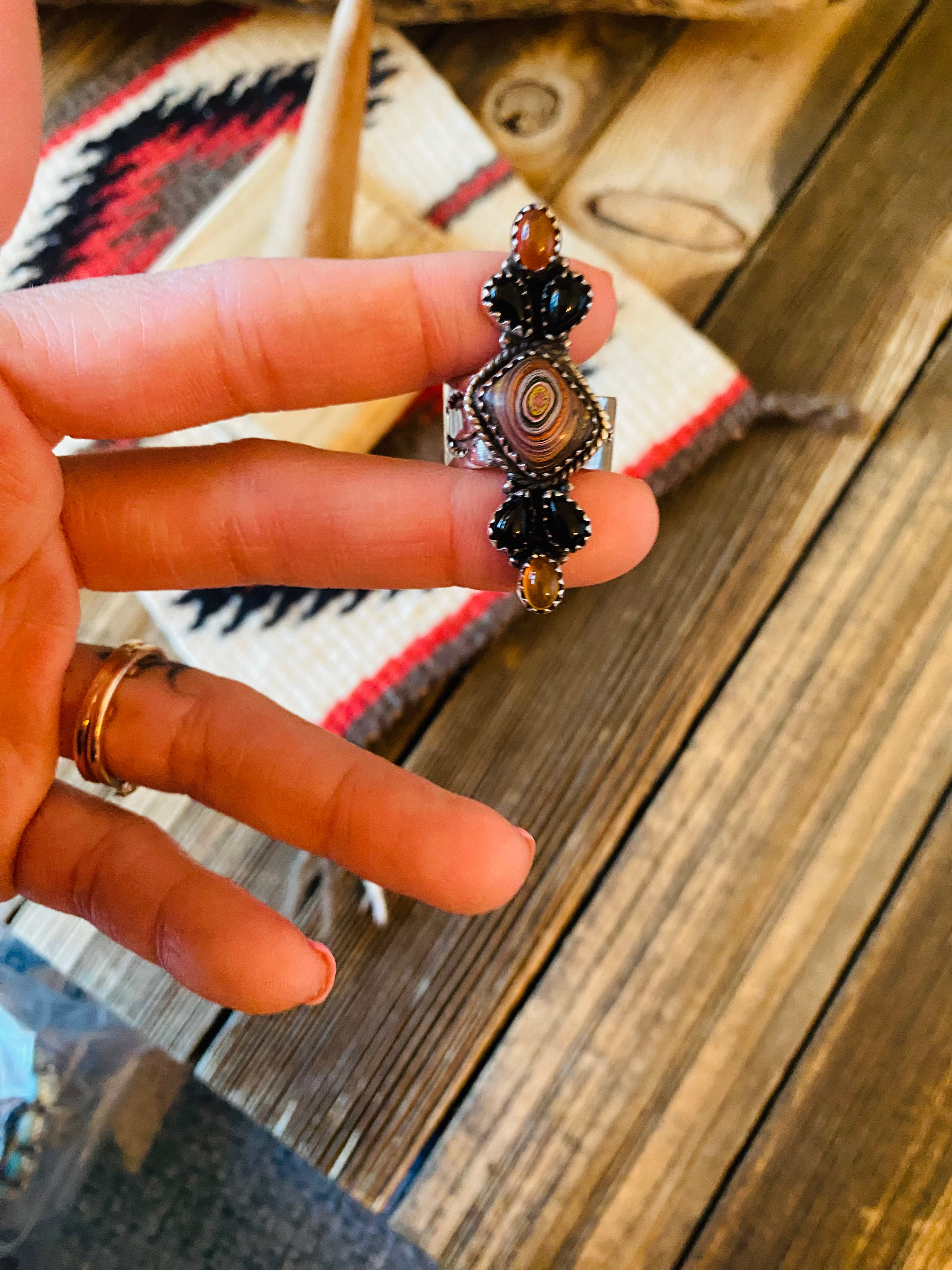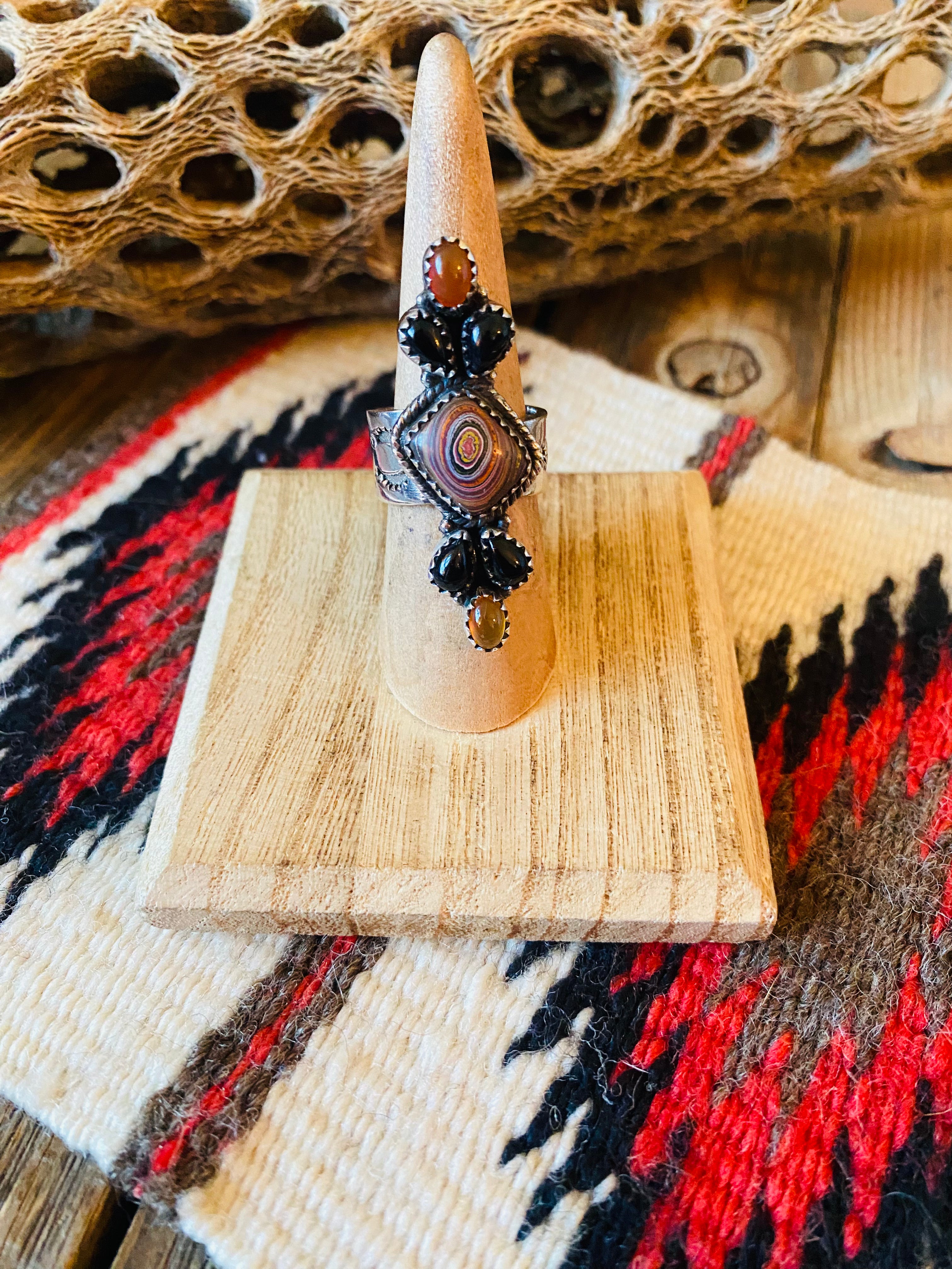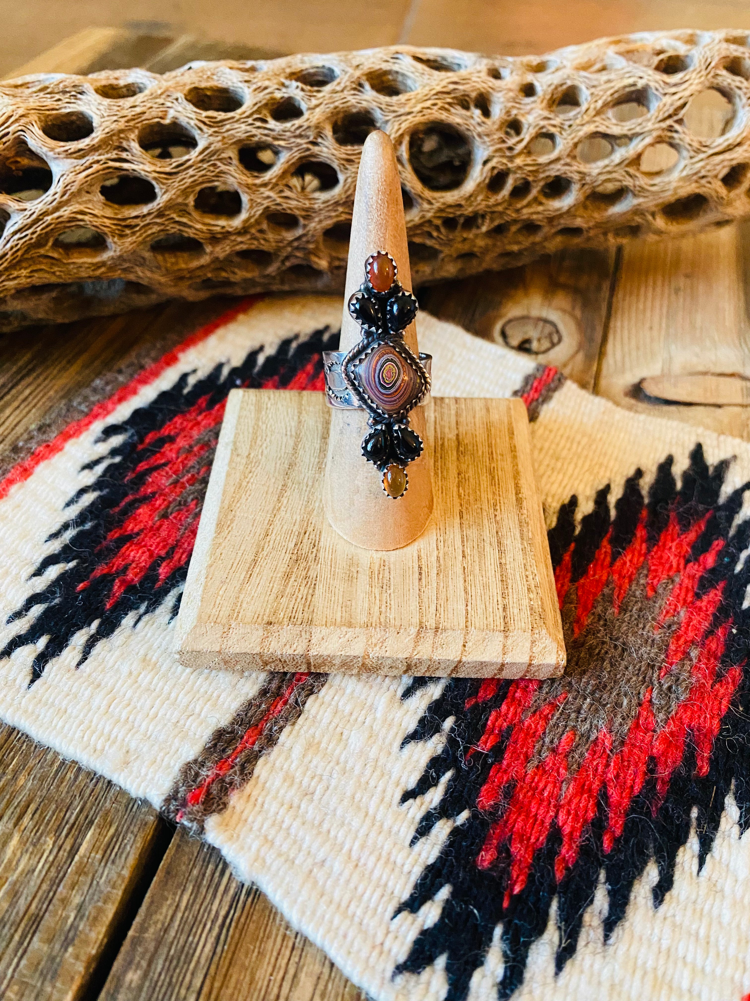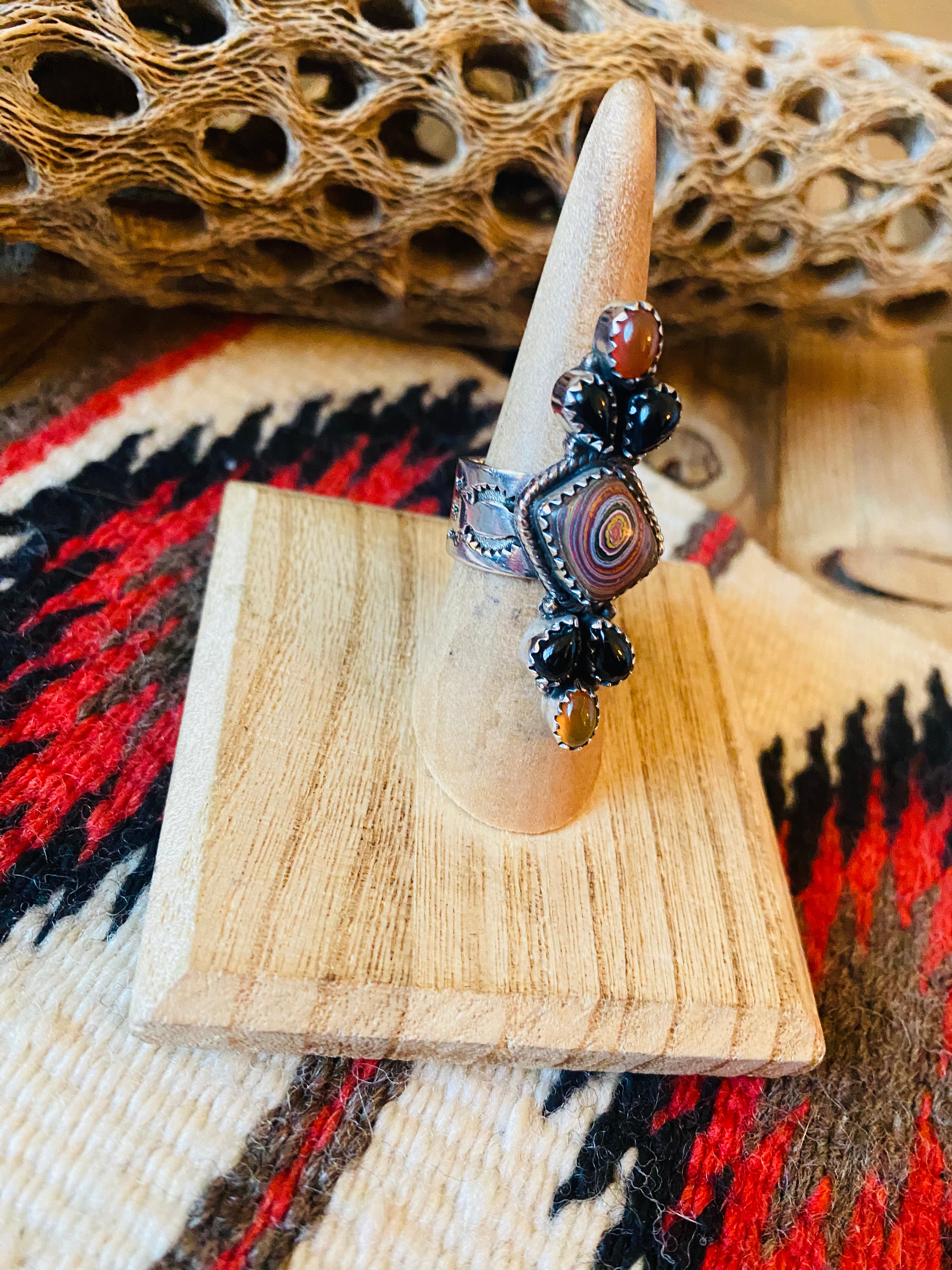 Beautiful Handmade Fordite, Garnet, Onyx and Sterling Silver Cluster Ring. Size is adjustable. Such amazing stones in this piece! Ring face measures 1 5/8 inches long and 3/4 of an inch wide. Stamped Sterling and Nizhoni.