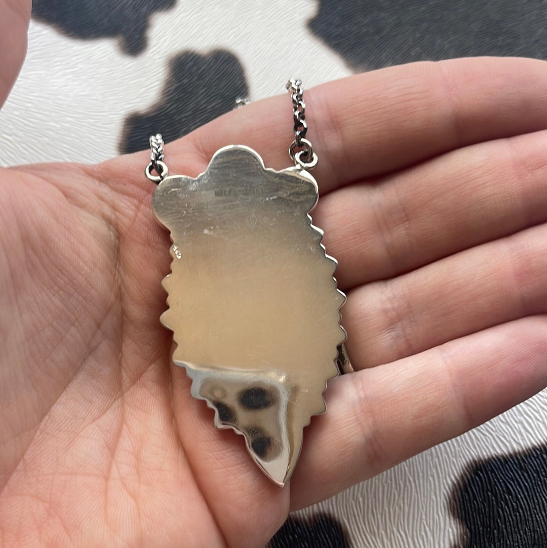 Pendant measures 2.5 inches long and 1 1/4 inch wide. Signed Nizhoni and stamped Sterling.