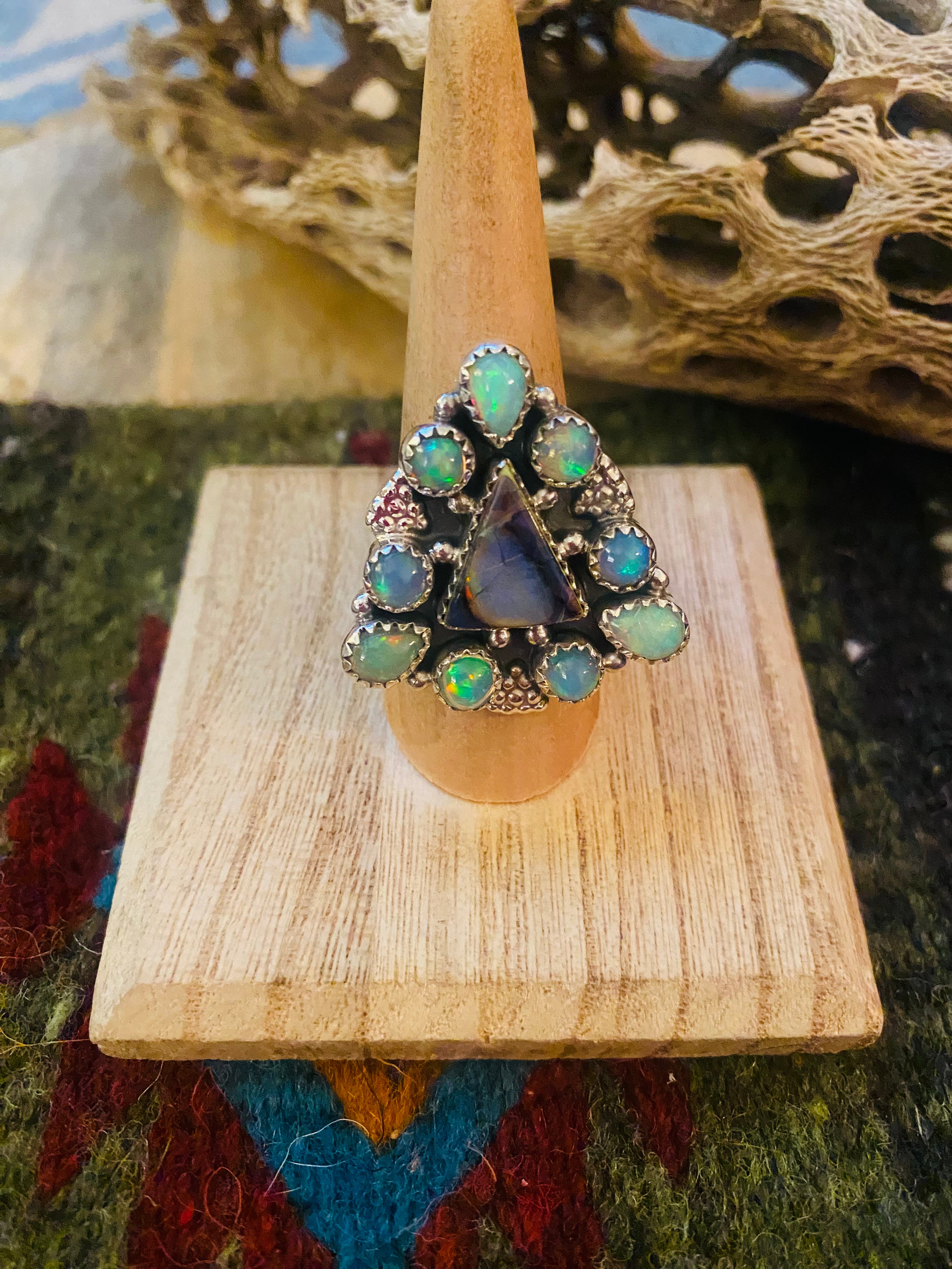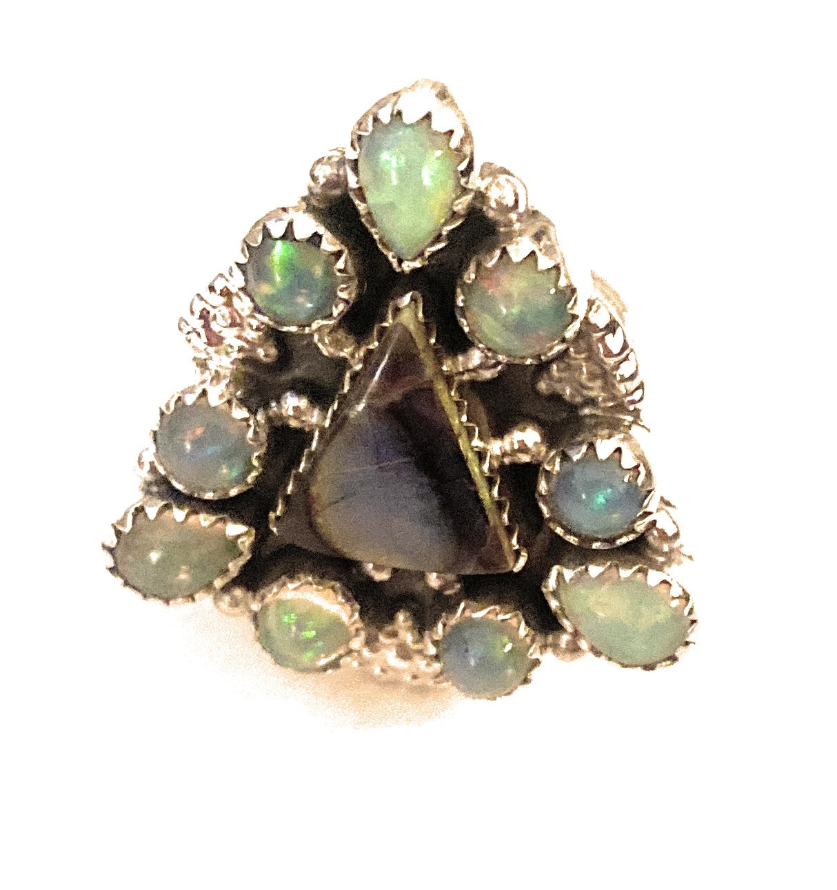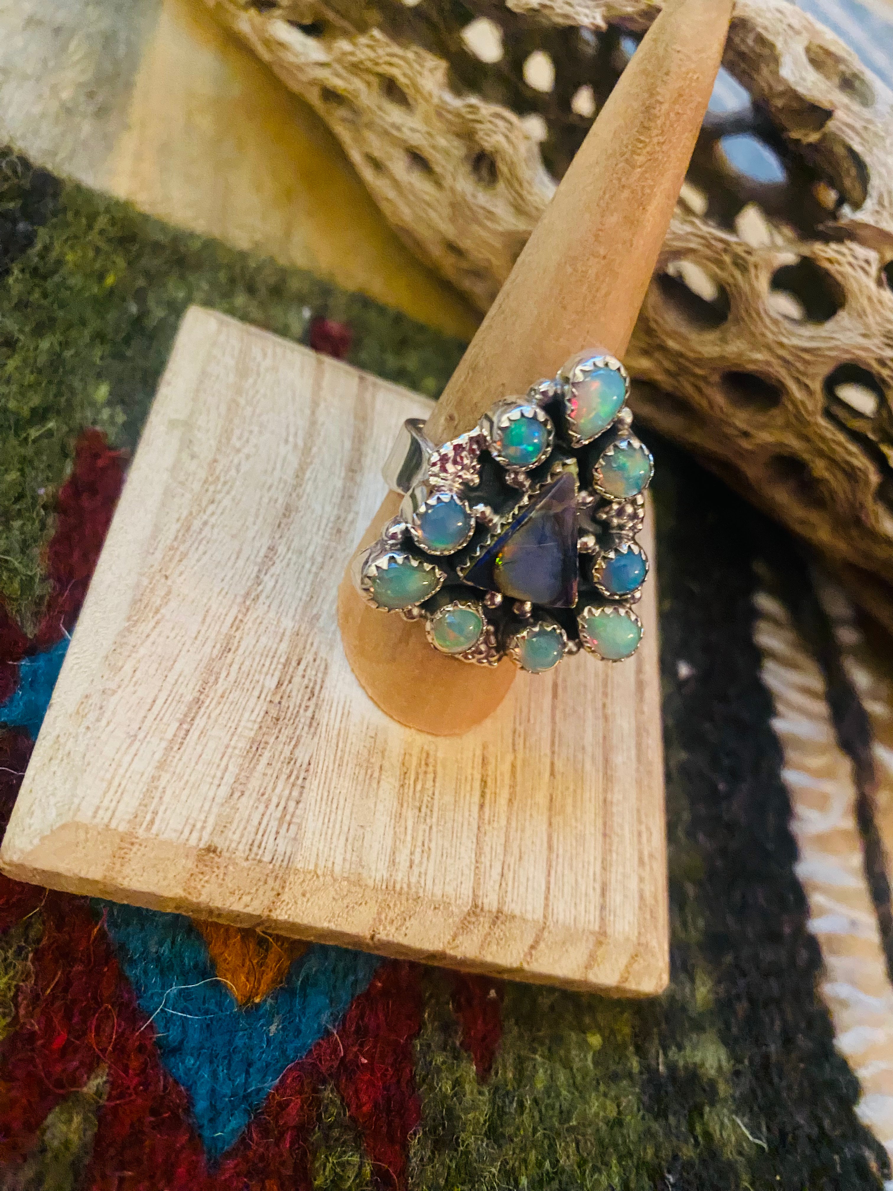 This is a beautiful handmade Opal and Sterling Silver Adjustable Cluster Ring. Ring measures 1 1/4 inches long and wide. Stamped sterling. So beautiful!