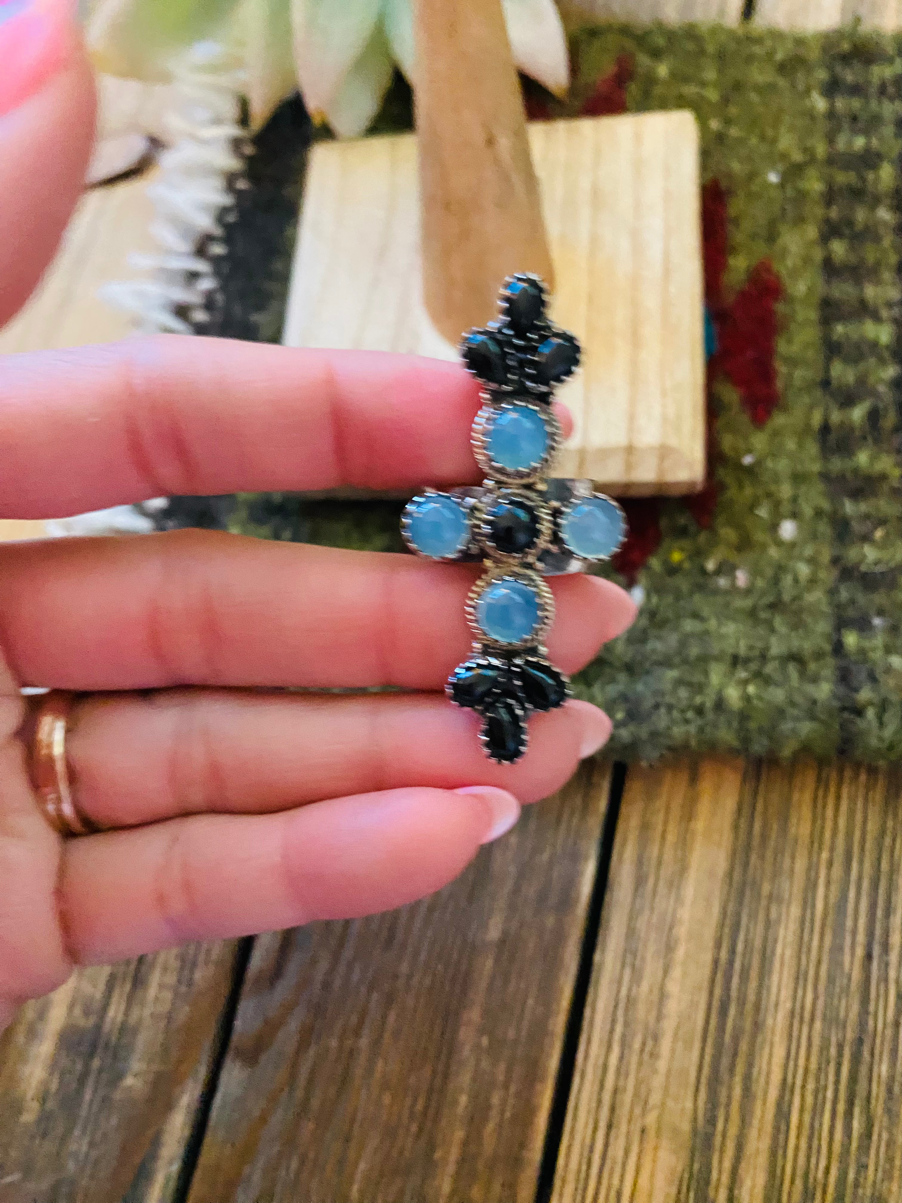 This is a beautiful handmade Opalite, Onyx and Sterling Silver Adjustable Ring. Ring measures 2 inches long and 7/8 of an inch wide. Stamped sterling and Nizhoni. Such a pretty ring!