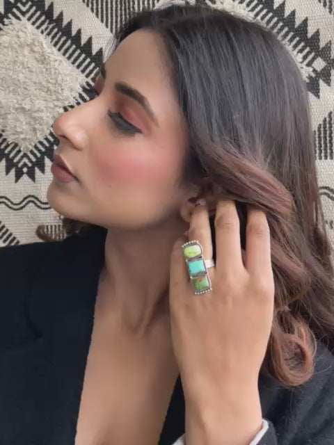Introducing our latest masterpiece! This stunning Sterling Silver Palomino with White Water, Sonoran adjustable ring is a true showstopper. With dimensions of 1 1/8" in length and 6/8" in width, it’s designed to make a bold statement.
