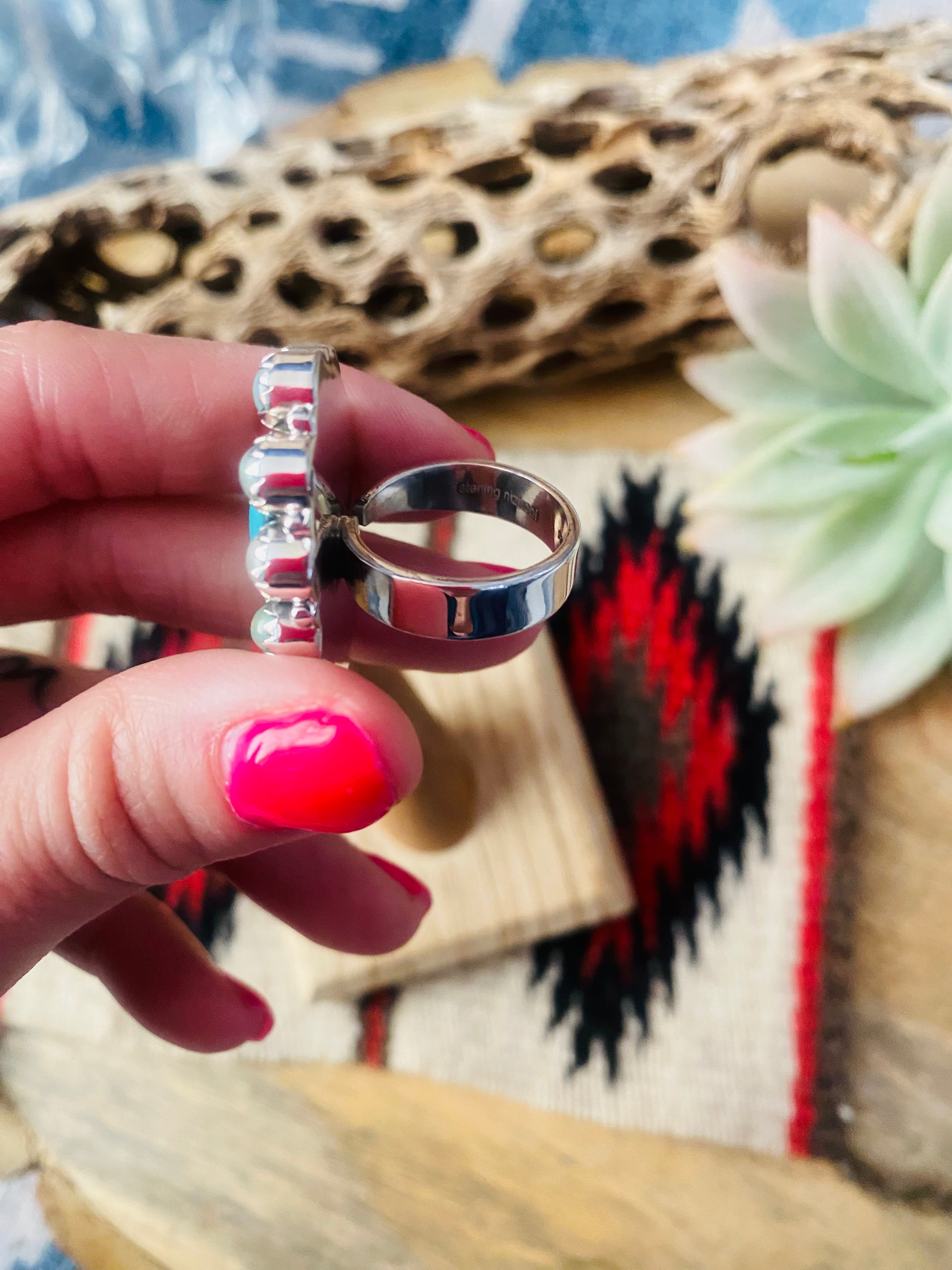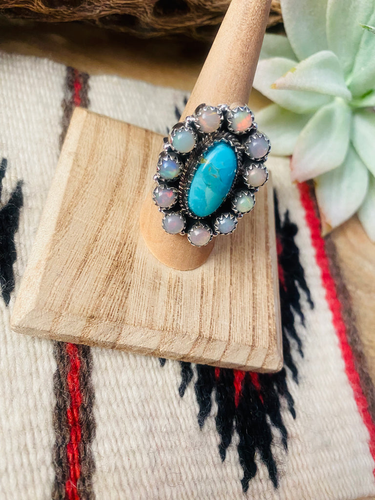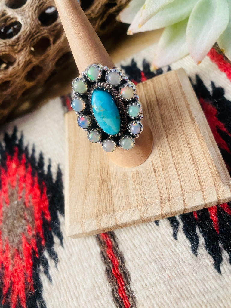 This is a beautiful handmade Turquoise, Opal and Sterling Silver Adjustable Cluster Ring. Ring measures 1 3/8 inches long and 1 inch wide. Stamped sterling and Nizhoni. So beautiful!