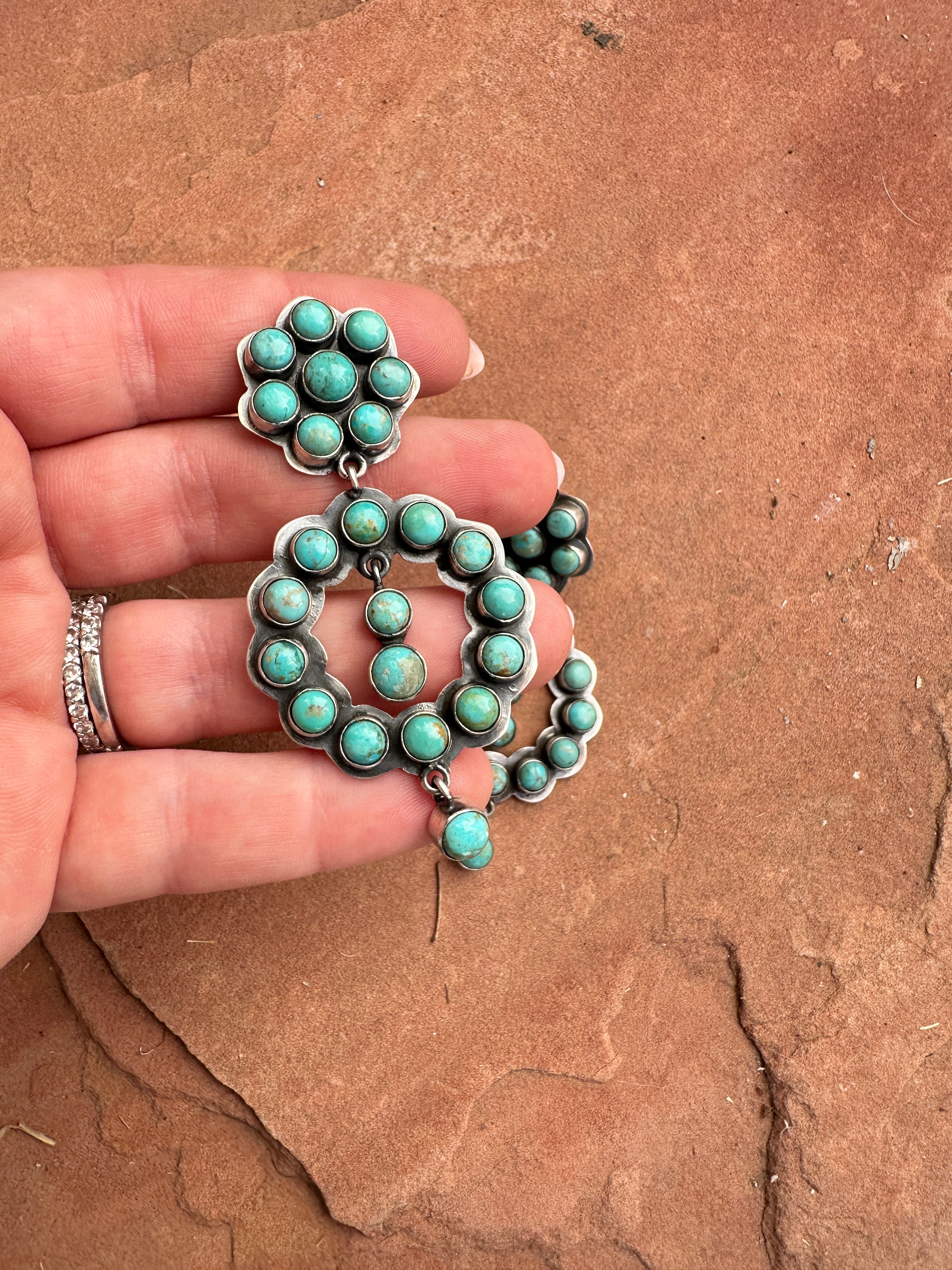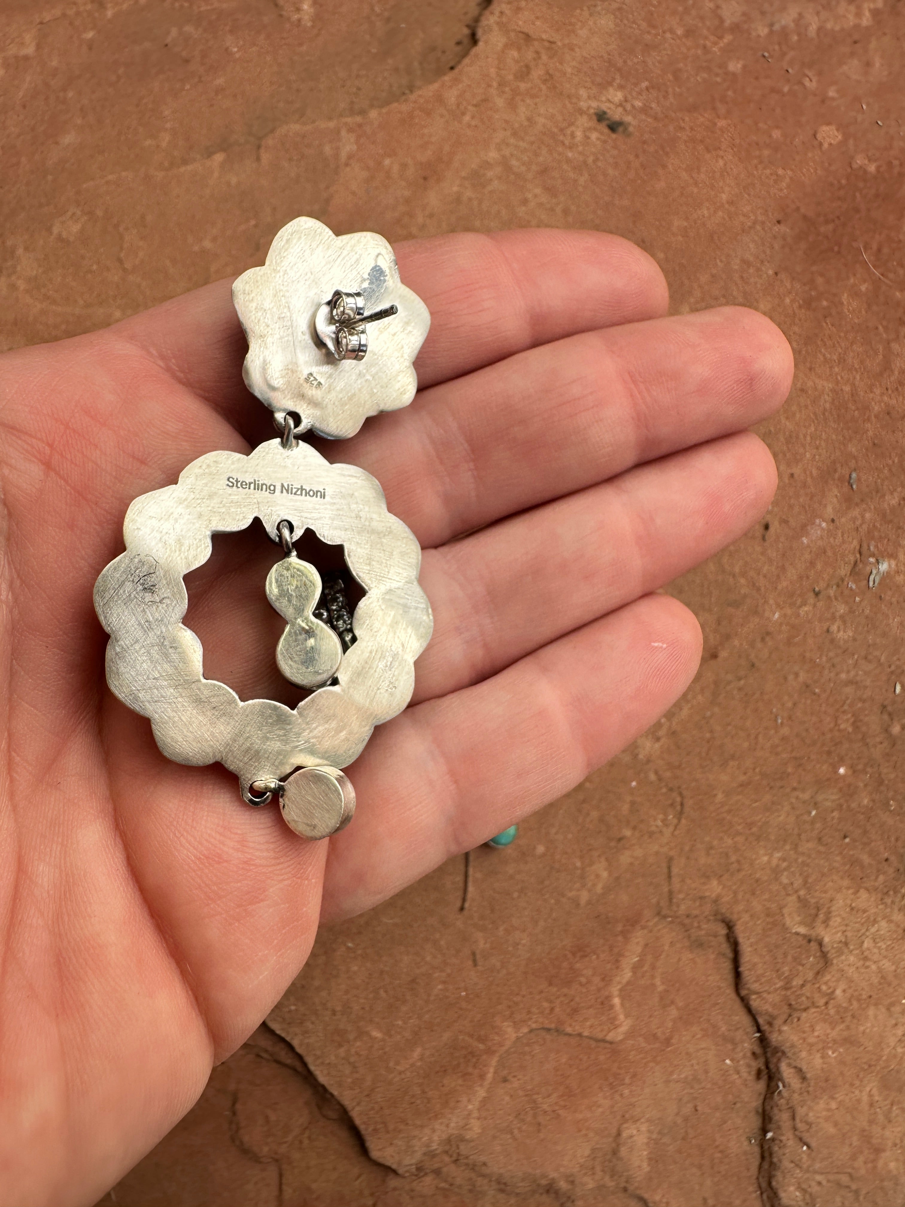 Beautiful Natural Turquoise and Sterling Silver Dangle Earrings. Such amazing craftsmanship! Measuring 2 3/4 inches long and 1.5 inch wide. Stamped Sterling and Nizhoni. Absolutely gorgeous!