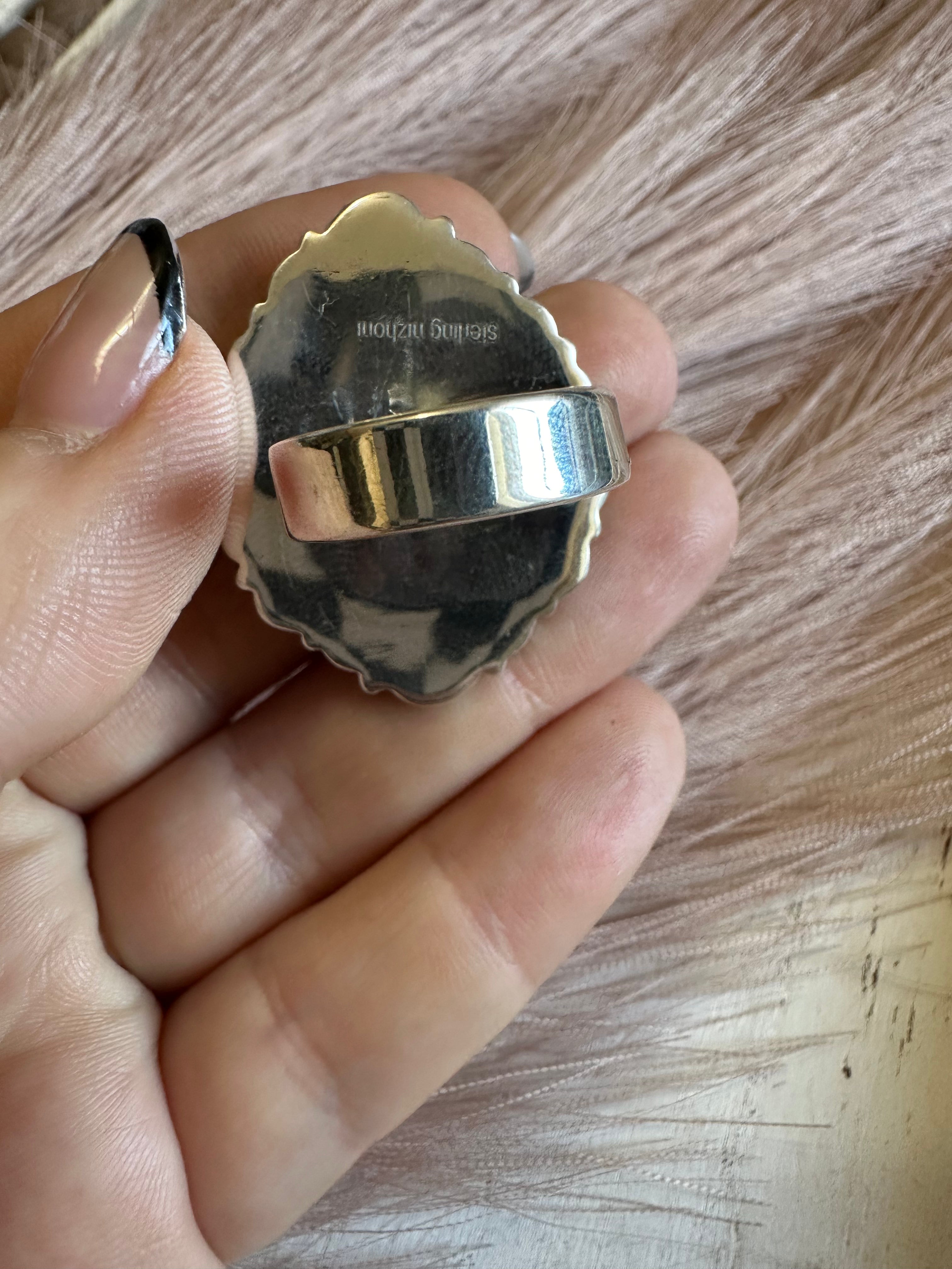 Gorgeous Handmade White Buffalo Mojave, Turquoise And Sterling Silver ring. Adjustable in size to wear on any finger. Beautiful stones. Beautiful details. Really great Ring. Measuring 1 3/8 inches long and 1 1/8 inches wide . Signed Nizhoni and stamped Sterling.