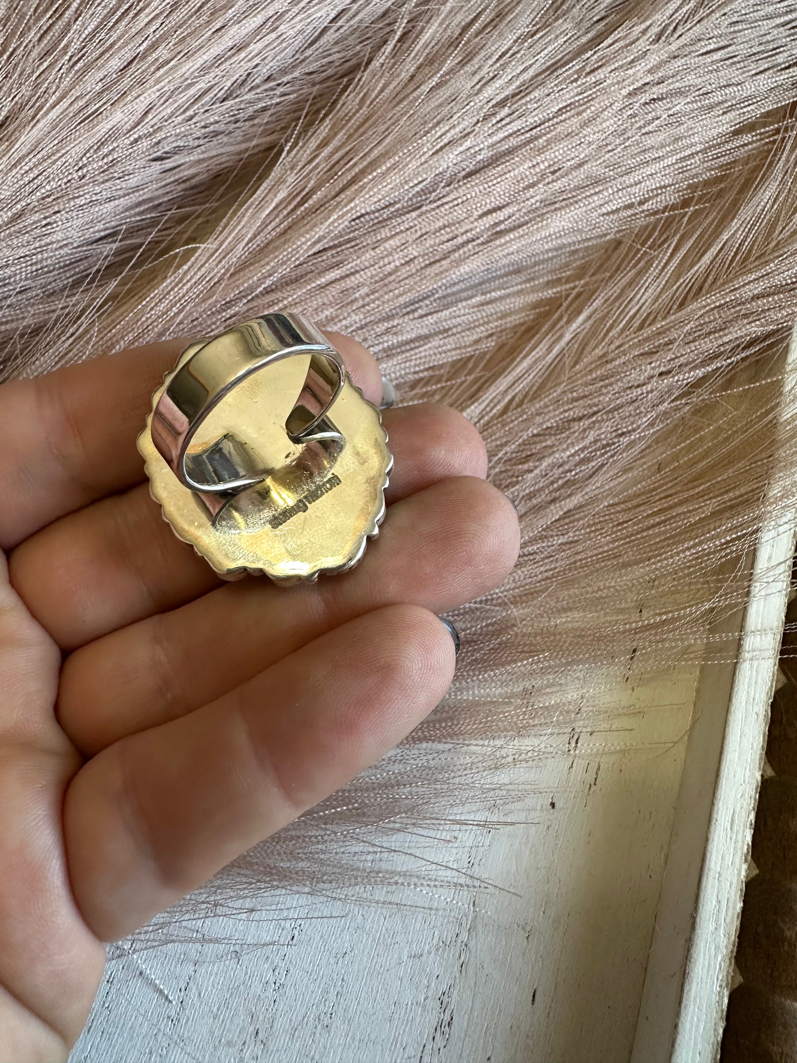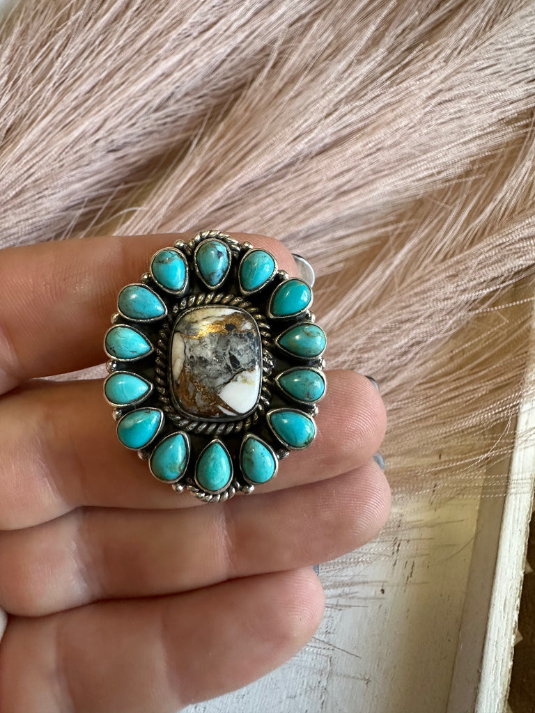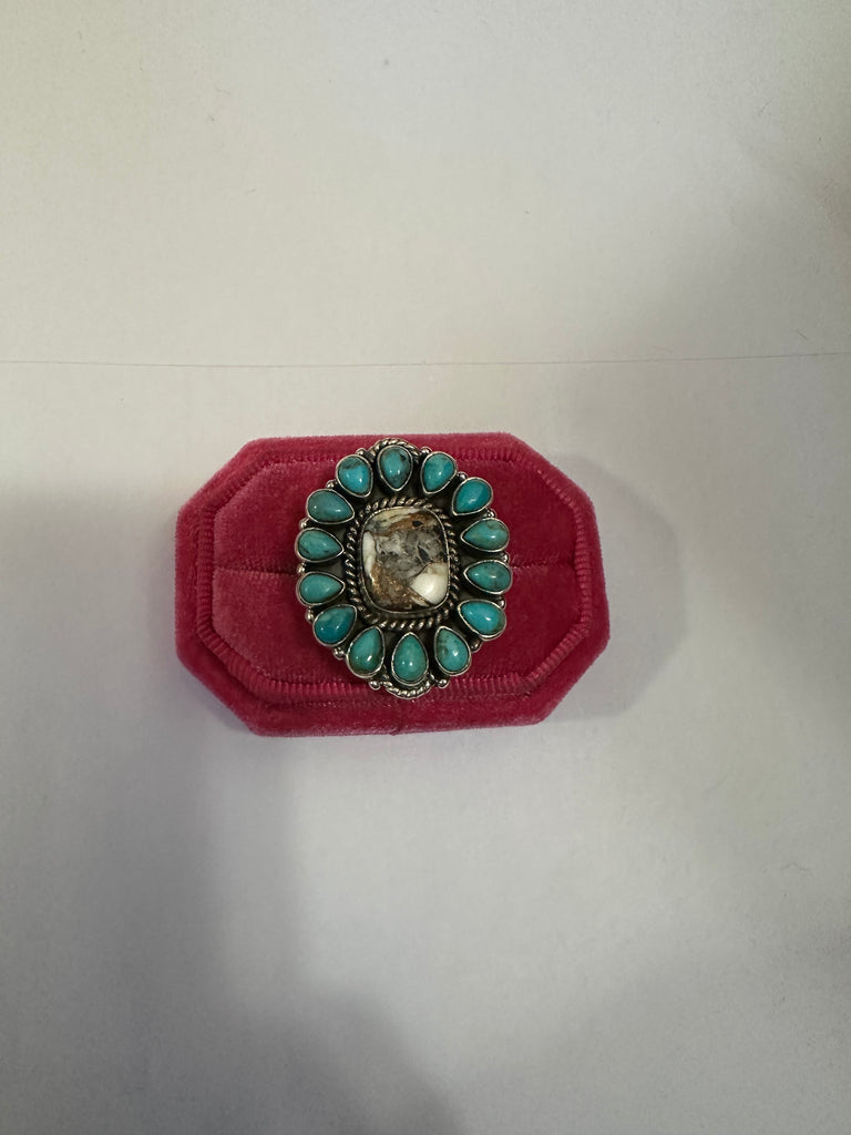 Gorgeous Handmade White Buffalo Mojave, Turquoise And Sterling Silver ring. Adjustable in size to wear on any finger. Beautiful stones. Beautiful details. Really great Ring. Measuring 1.5 inches long and 1 1/4 inches wide . Signed Nizhoni and stamped Sterling.