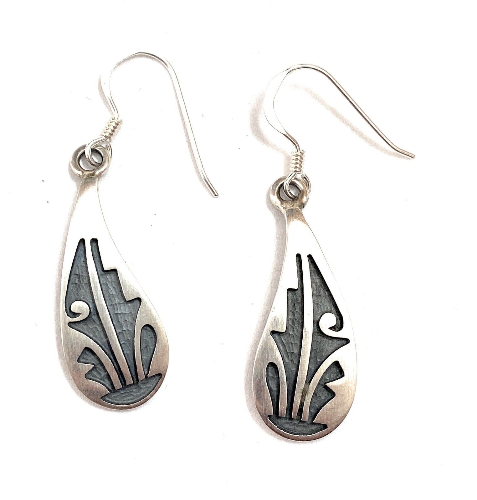 Beautiful Hopi Overlaid Sterling Silver Dangle Earrings. These earrings measure just over 1 1/2 inches long and 3/8 of an inch wide. Signed by the artist and stamped Sterling. Such a pretty pair!