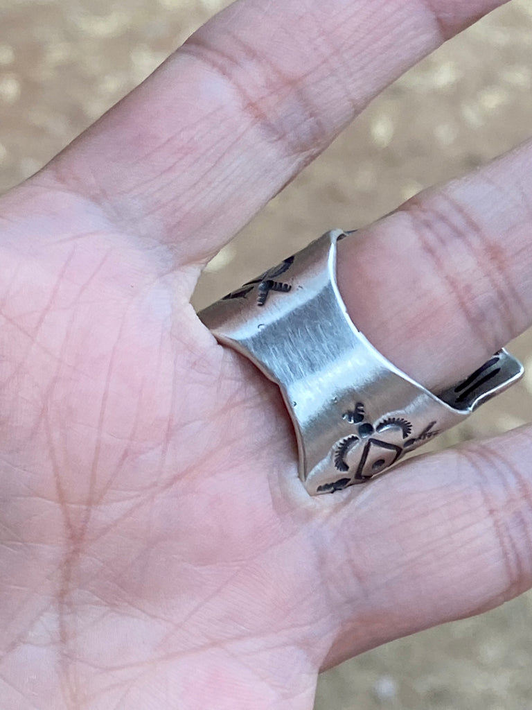 Every Southwest Collection needs a Sterling Silver Concho piece. This ring definitely fits the bill. Measuring at 1 1/2 inches and 1 inch wide. Curved Hand Stamped Conch design.