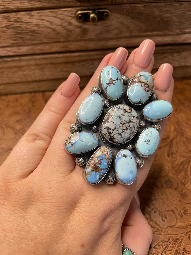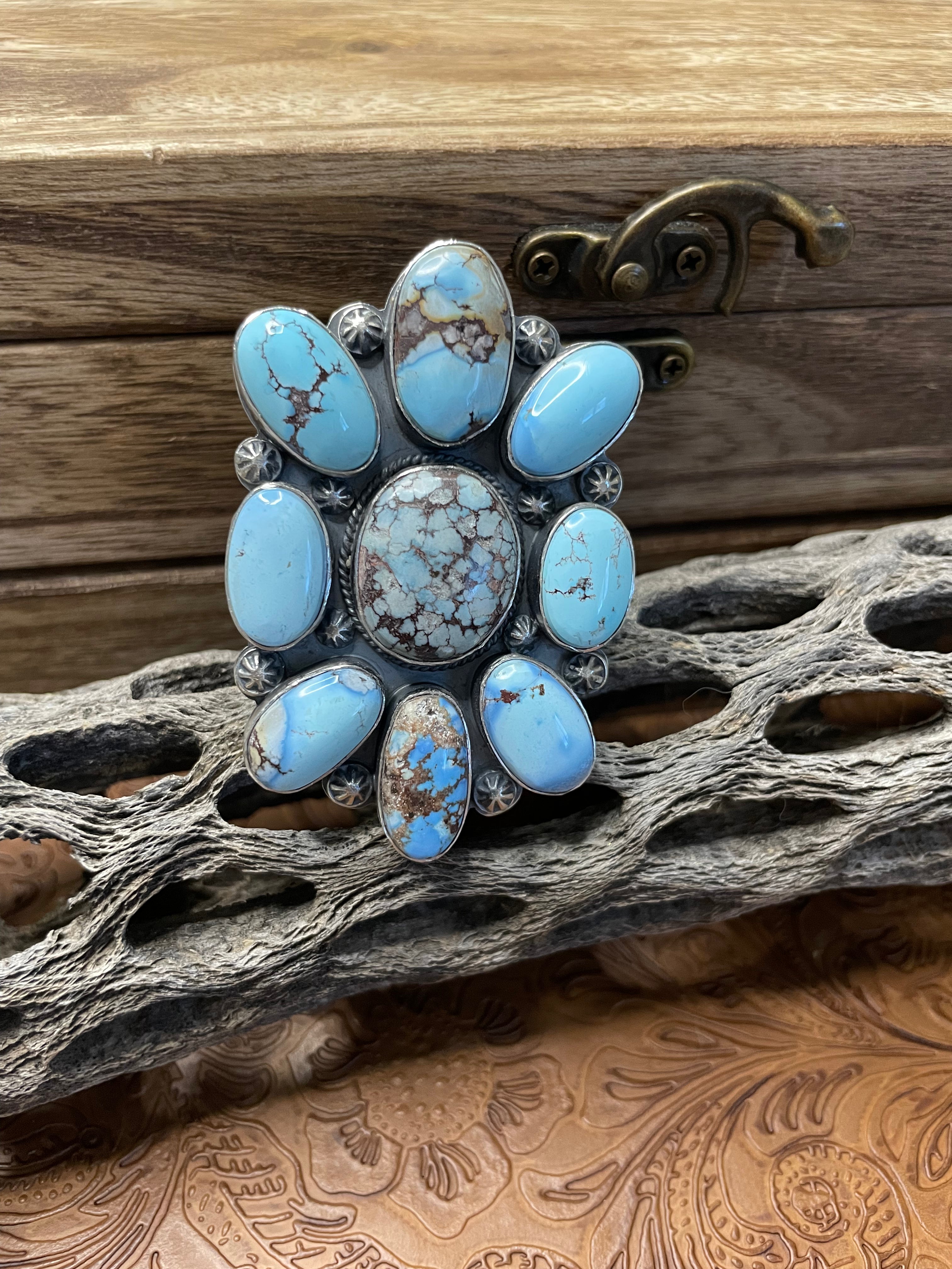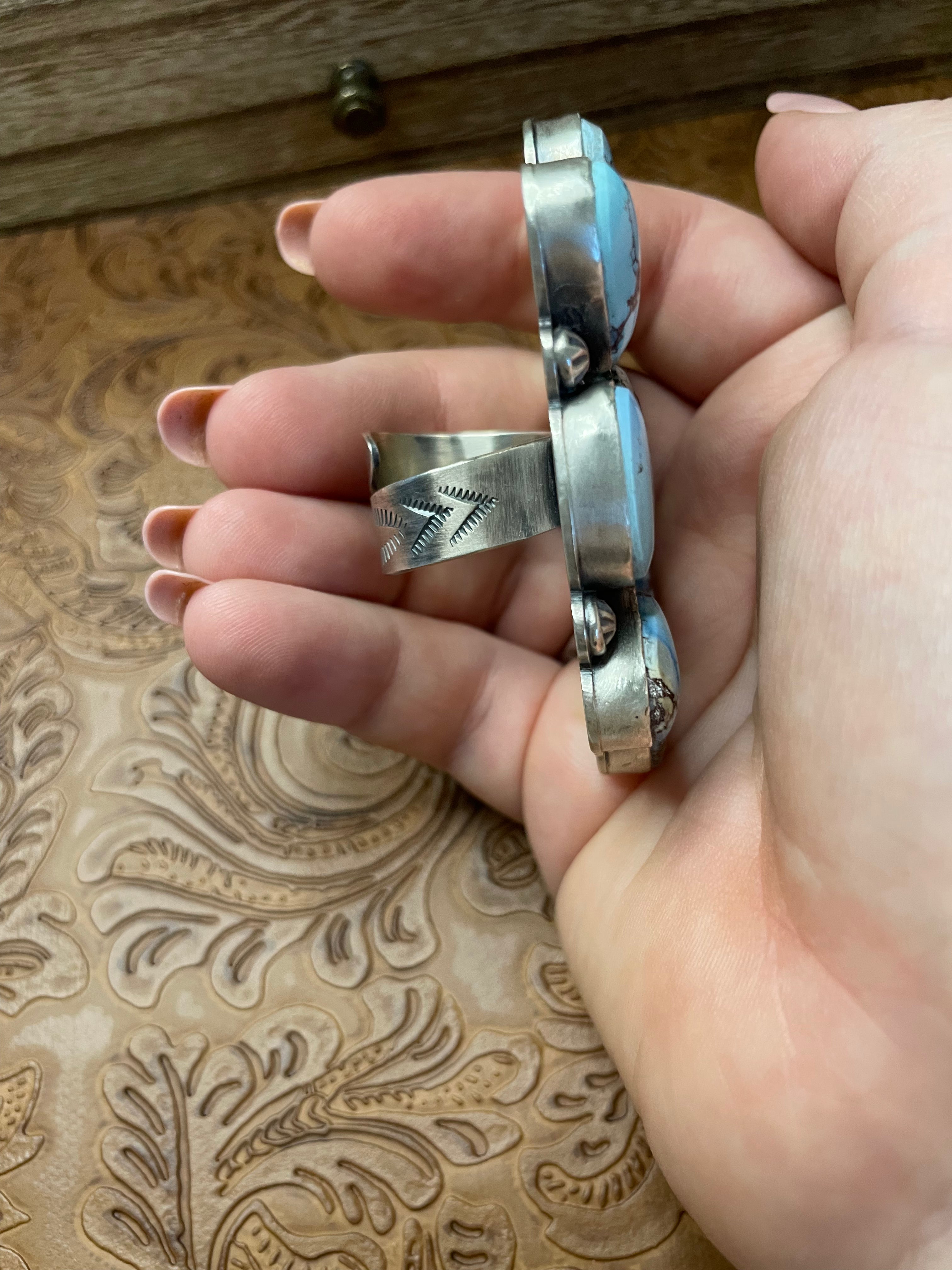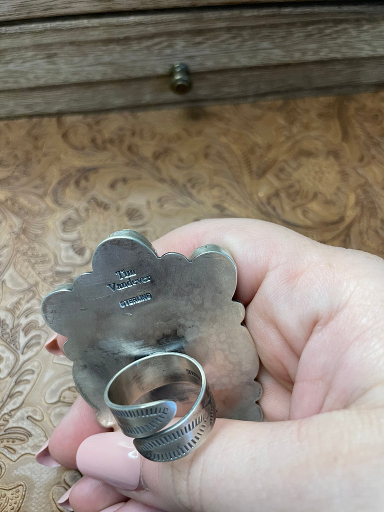 Absolutely Gorgeous Silversmith Detail. Golden Hills Turquoise and Sterling Silver. Signed by the artist Tim Vandever and Stamped Sterling . Measuring 3 inches long and 1 3/4 inches wide. Really beautiful ring. Size is adjustable.