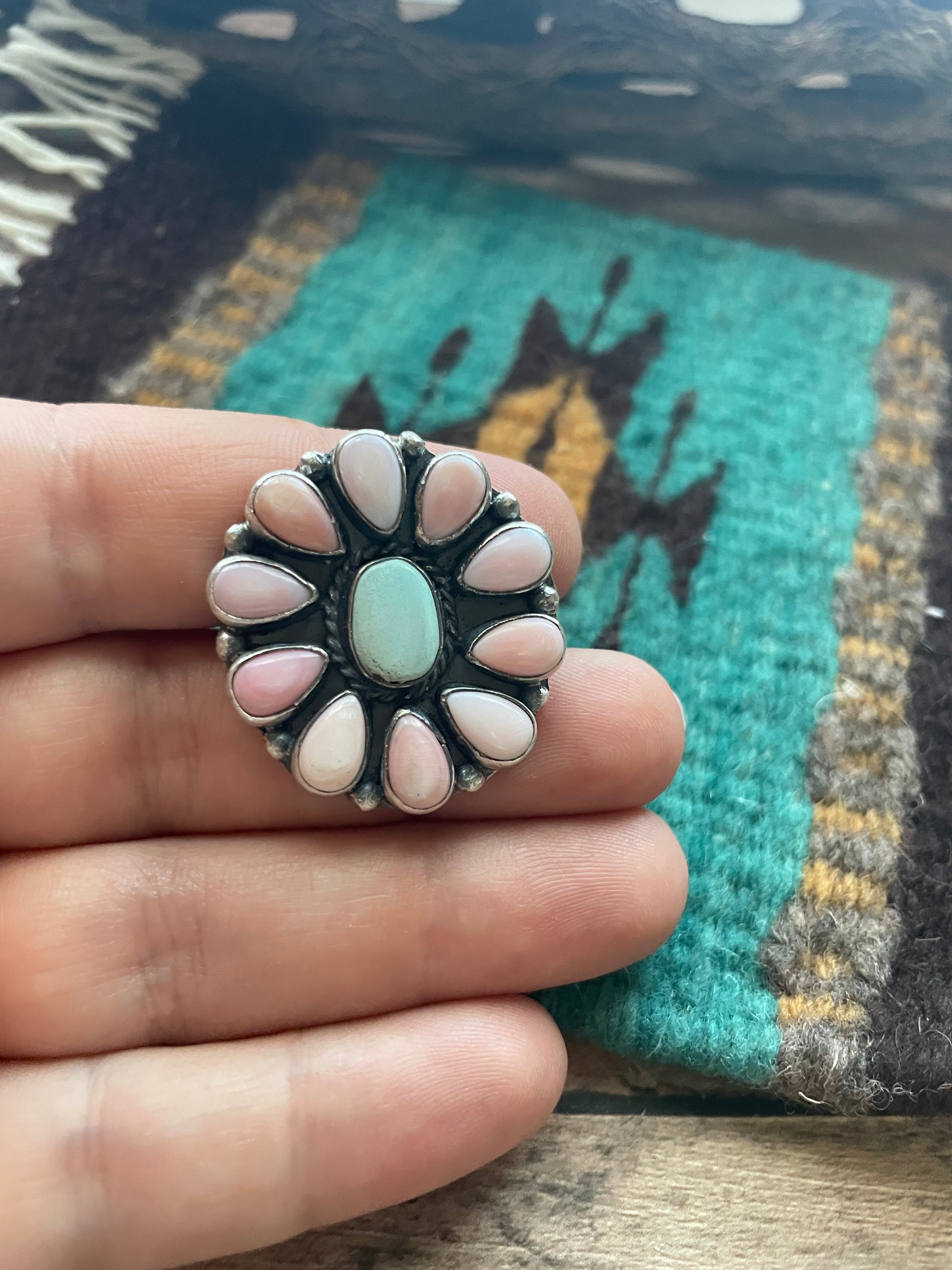 Navajo Golden Hills Turquoise, Pink Conch, and Sterling Silver Adjustable Ring Signed C. Yazzie. These 2 stones look just beautiful together. They are signed by the artist and stamped sterling. They are adjustable in size. This beautiful ring measures 1 1/4” x 1 1/4”.