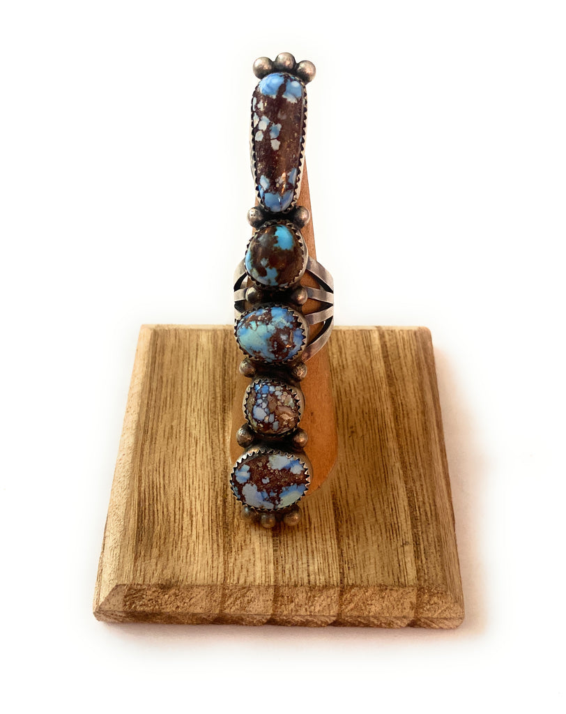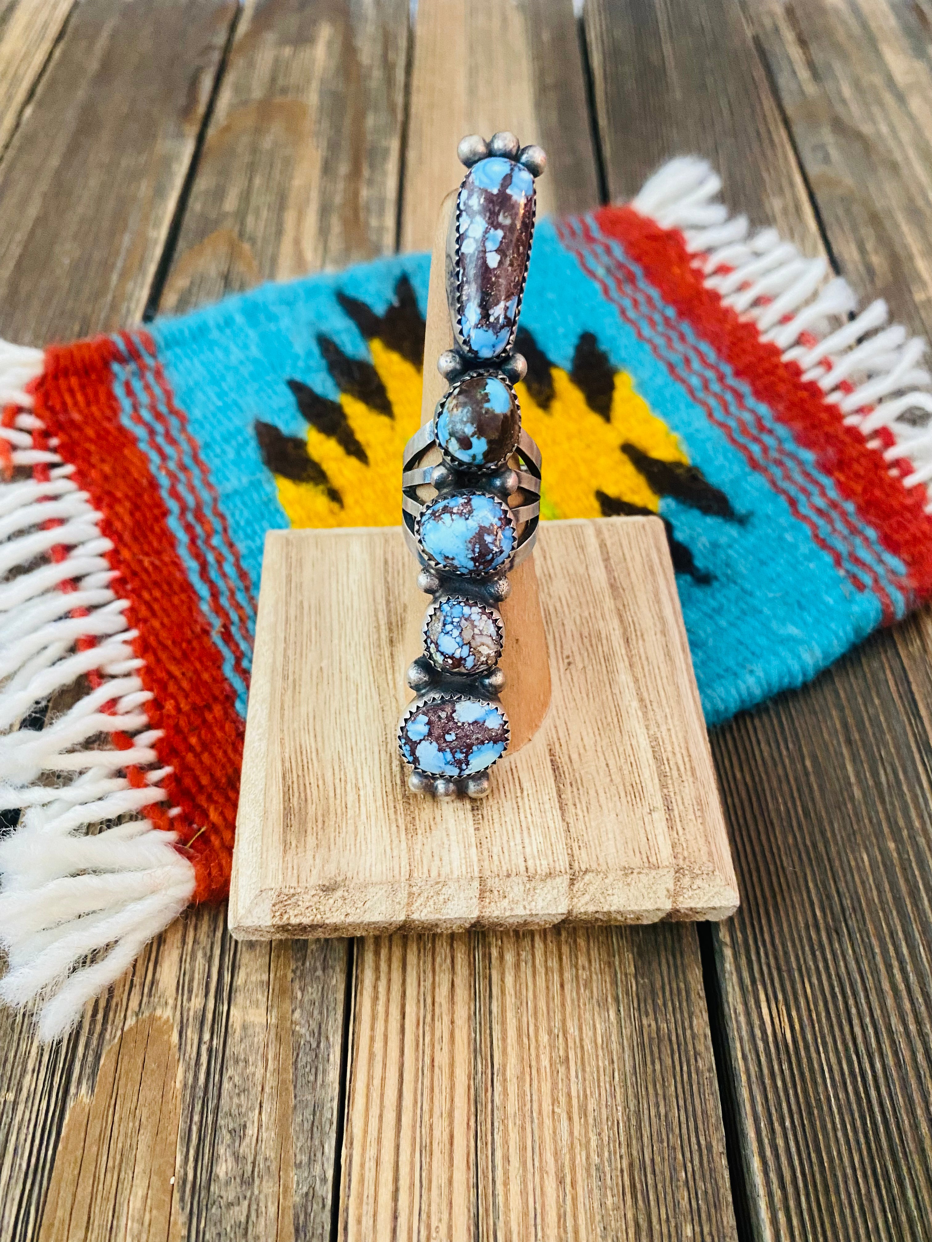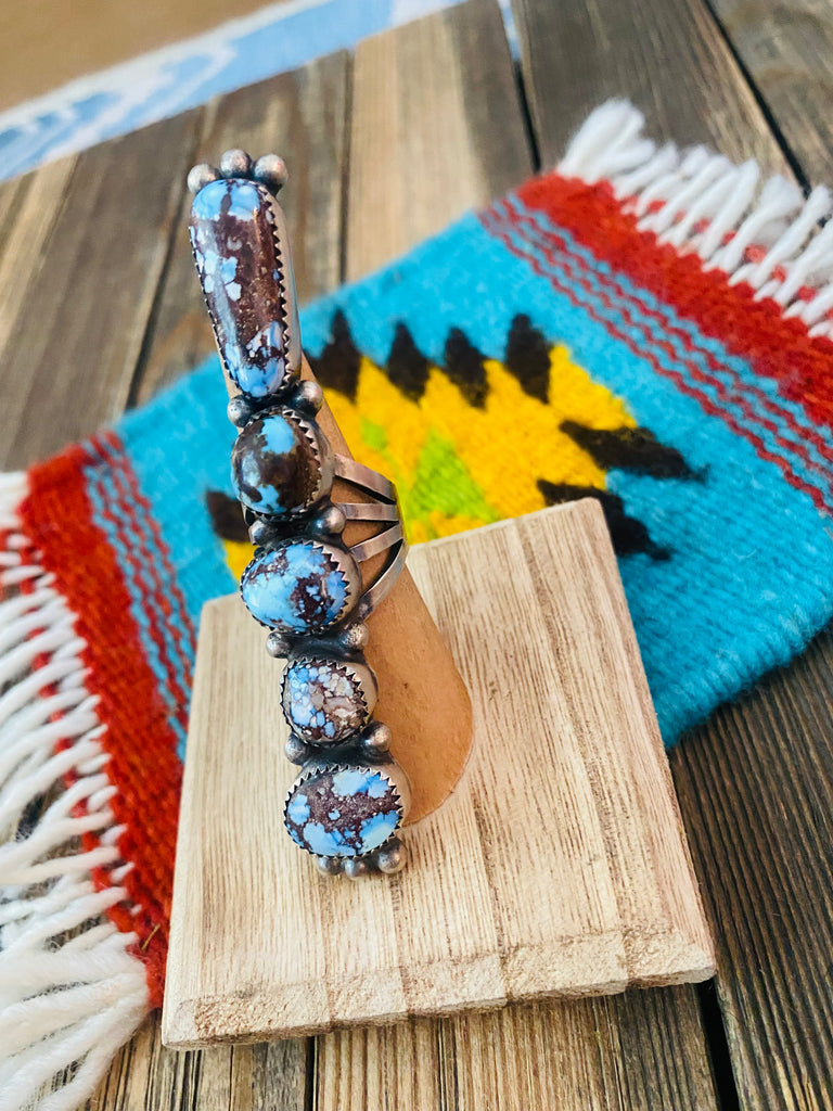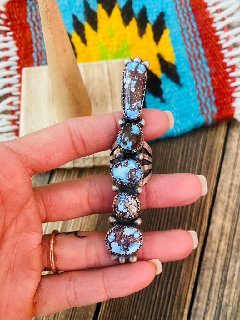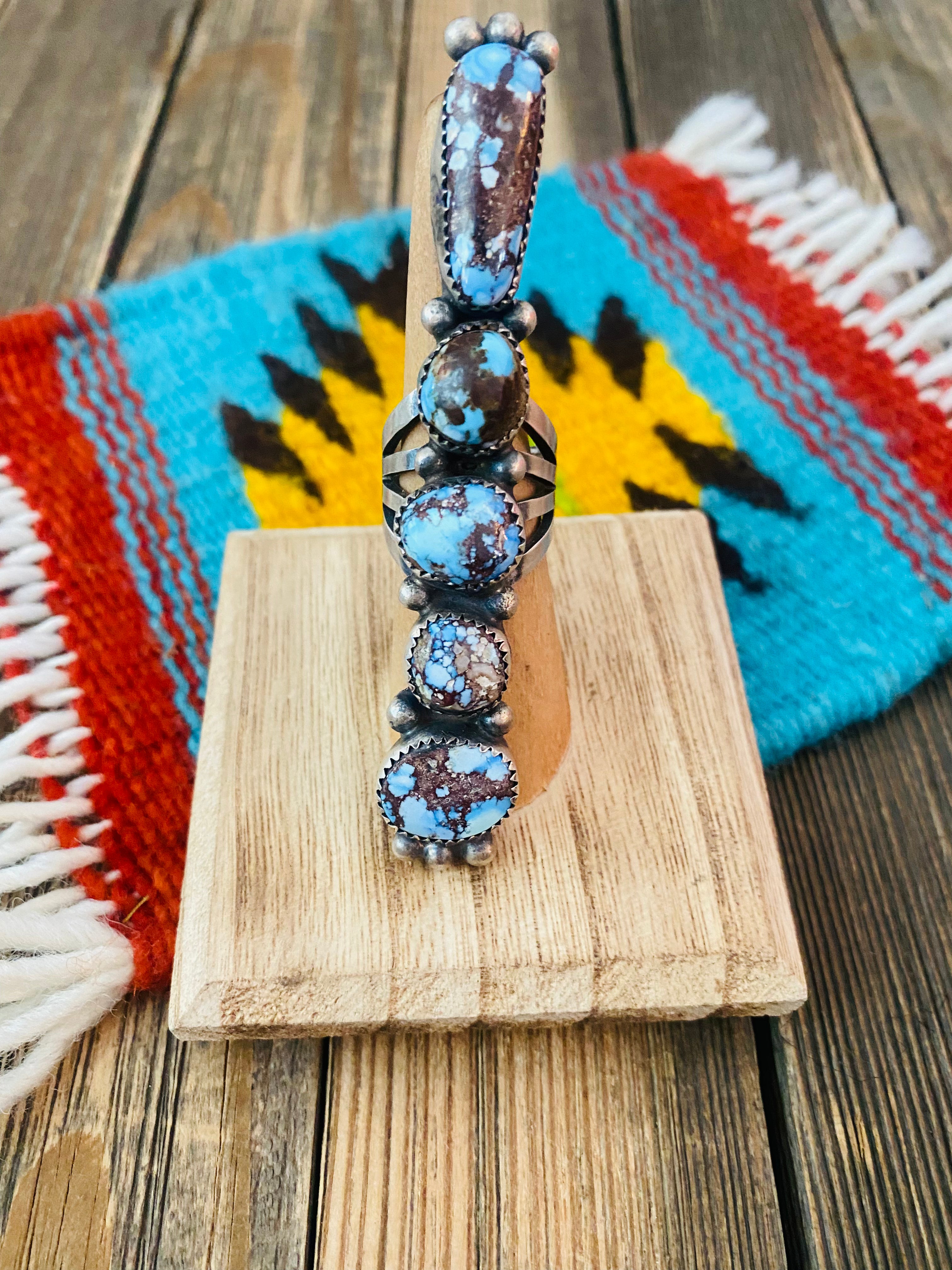 Gorgeous Navajo Golden Hills Turquoise and Sterling Silver Climber Ring. Size 6. Such an amazing stones in this ring! Ring measures 3 1/2 inches long and 5/8 of an inch wide. Signed by the artist Bobby Johnson and stamped Sterling.