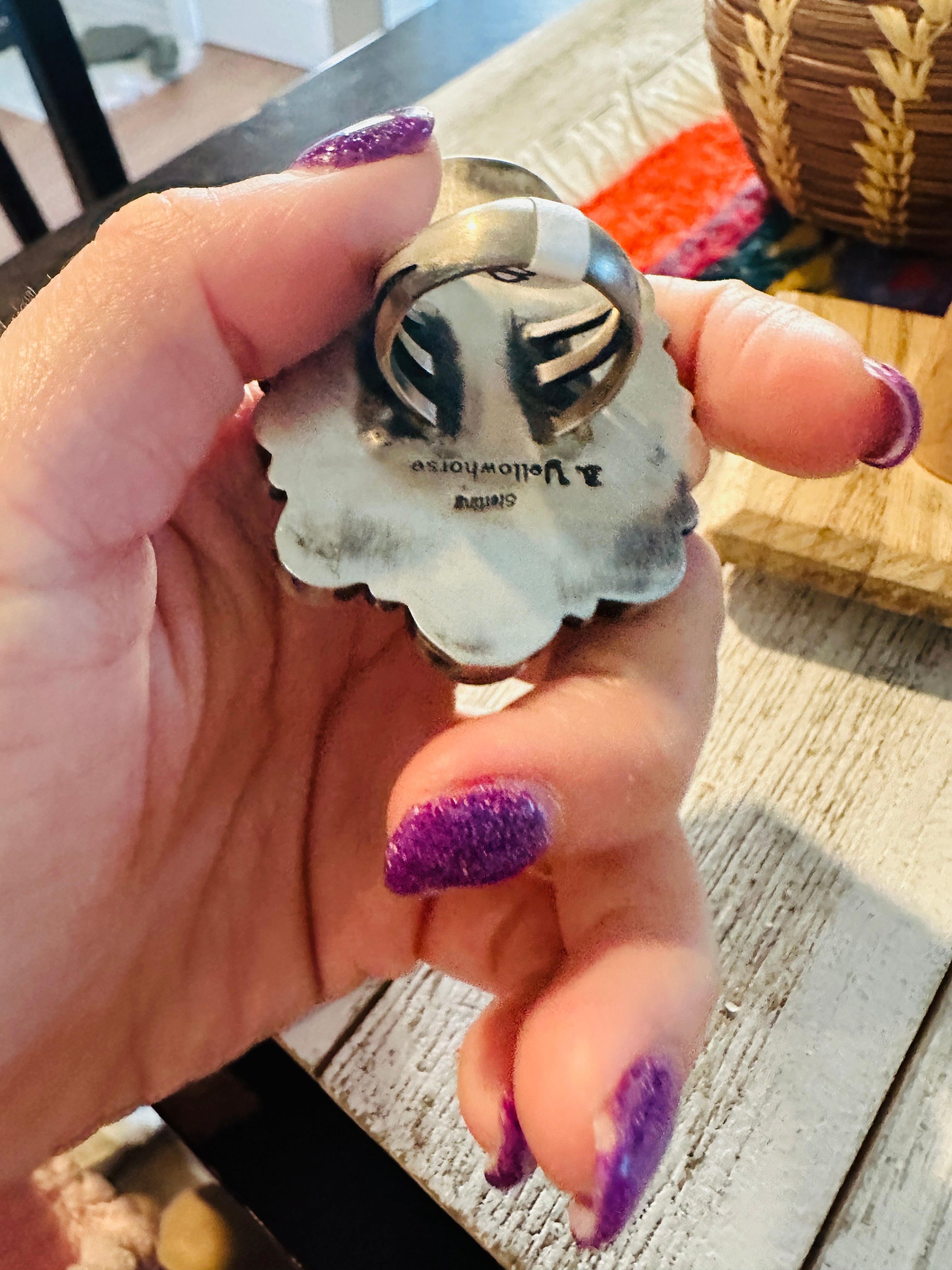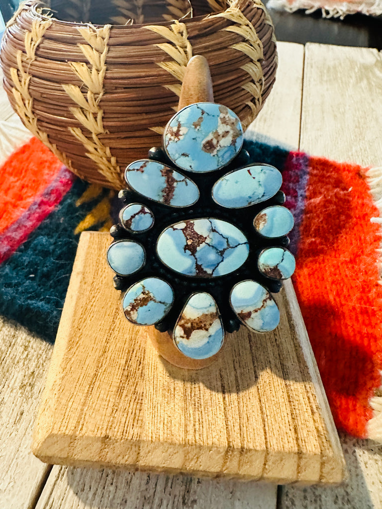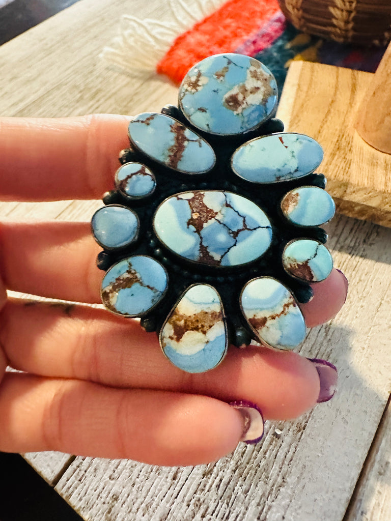 Gorgeous Navajo Golden Hills Turquoise and Sterling Silver Cluster Ring. Size 7. Such amazing stones in this ring! Ring measures 2 1/4 inches long and 1 5/8 inches wide. Signed by the artist B. Yellowhorse and stamped Sterling.