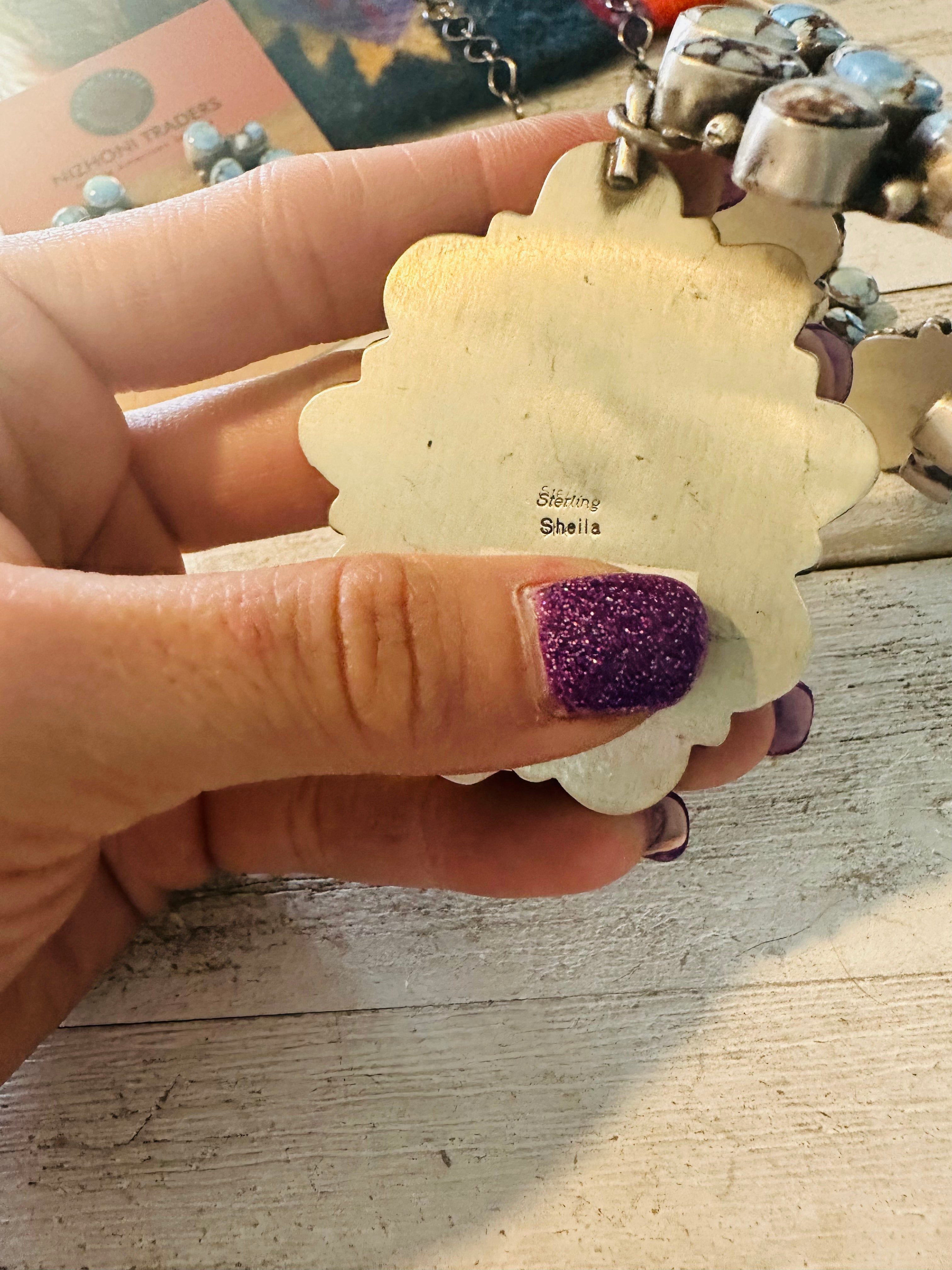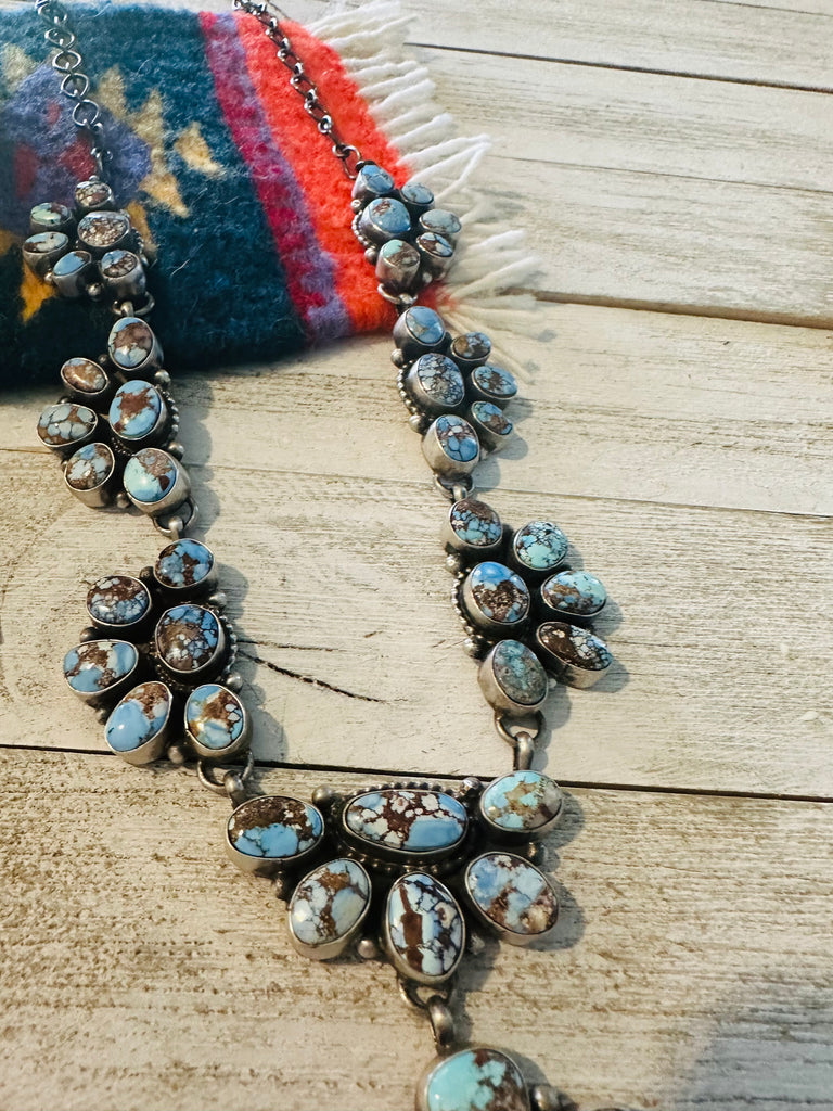 Absolutely gorgeous! Navajo Golden Hills Turquoise & Sterling Silver Cluster Necklace Set. This set is incredibly gorgeous! Necklace measures 24 inches long. Center pendant measures 3 3/8 inches long. Matching earrings measure 1 1/4 inches long and 3/4 of an inch wide. Signed by the artist Sheila Becenti and stamped Sterling. So stunning!