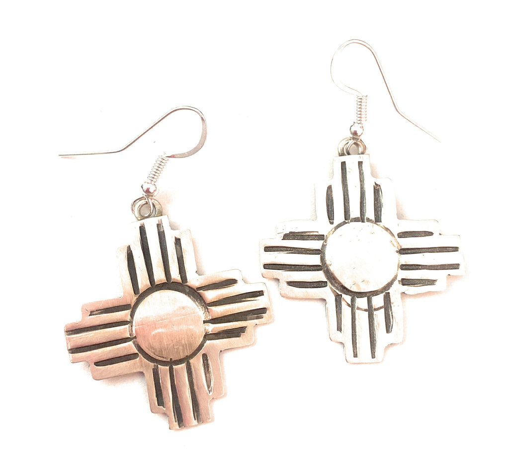 Navajo Sterling Silver Hand Stamped Zia Cross Dangle Earrings. These beauties measure just under 2 inches long and 1 1/8 inches wide. Signed by the artist and stamped Sterling.