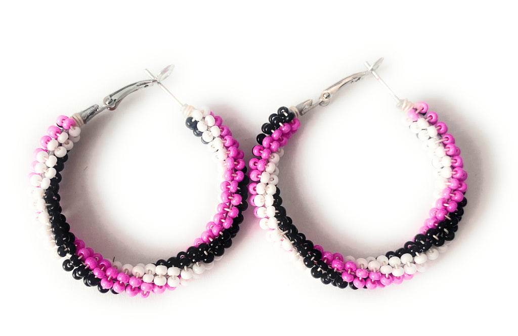 Navajo Handmade Beaded Hoop Earrings- pink, black