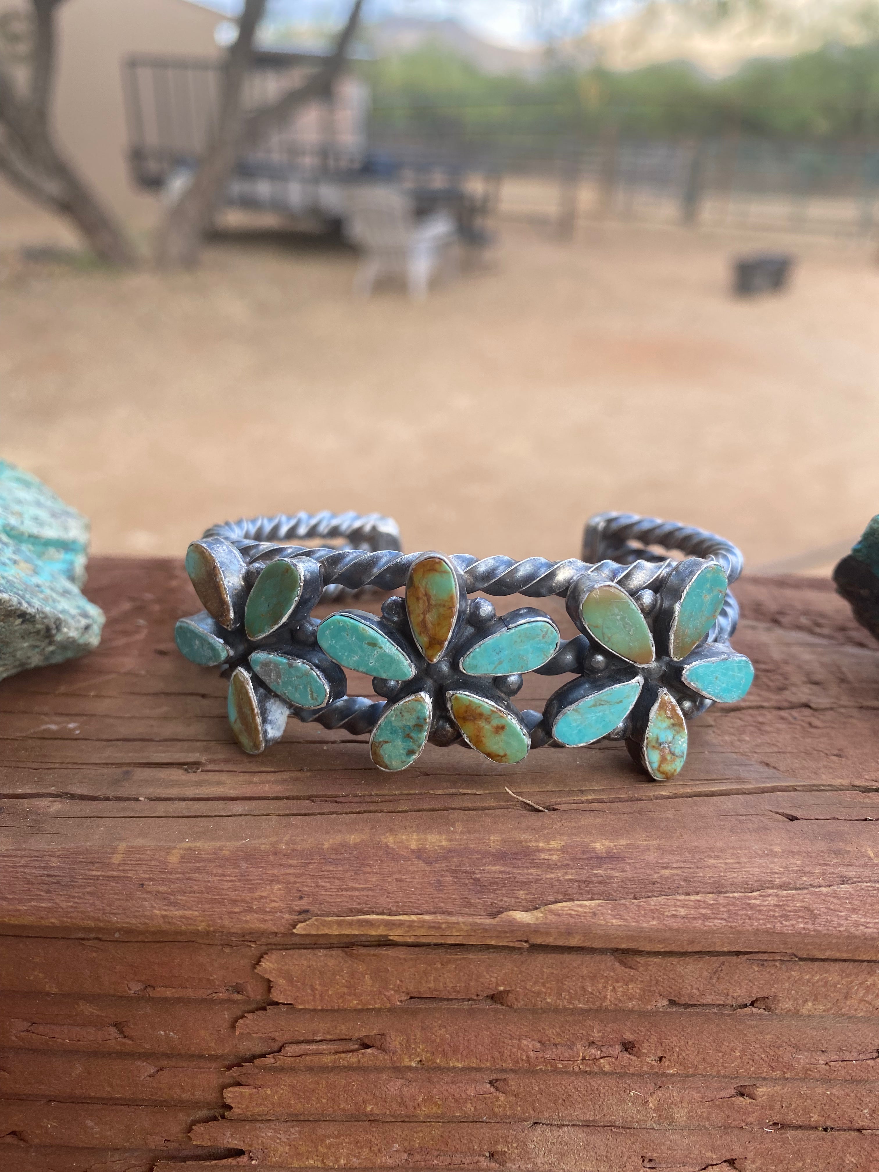 Handcrafted Royston Turquoise And Sterling Silver Cluster cuff Measuring 5 1/2 inches in circumference and 1 inch gap. Width is 1 inches wide. Signed by the artist Jacqueline Silver and stamped Sterling. Absolutely gorgeous!