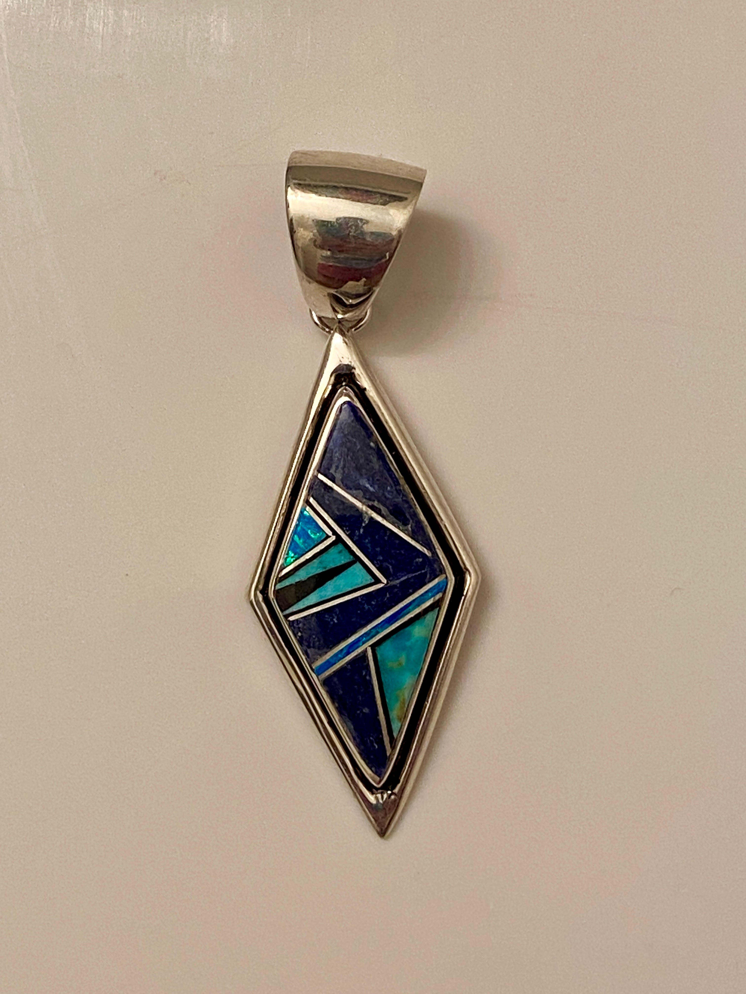 This beautifully well crafted Diamond shape Pendant has been handmade by an American Artisan. The Colors of the Pendant come from Lapis Lazuli, Turquoise and Blue Opal.