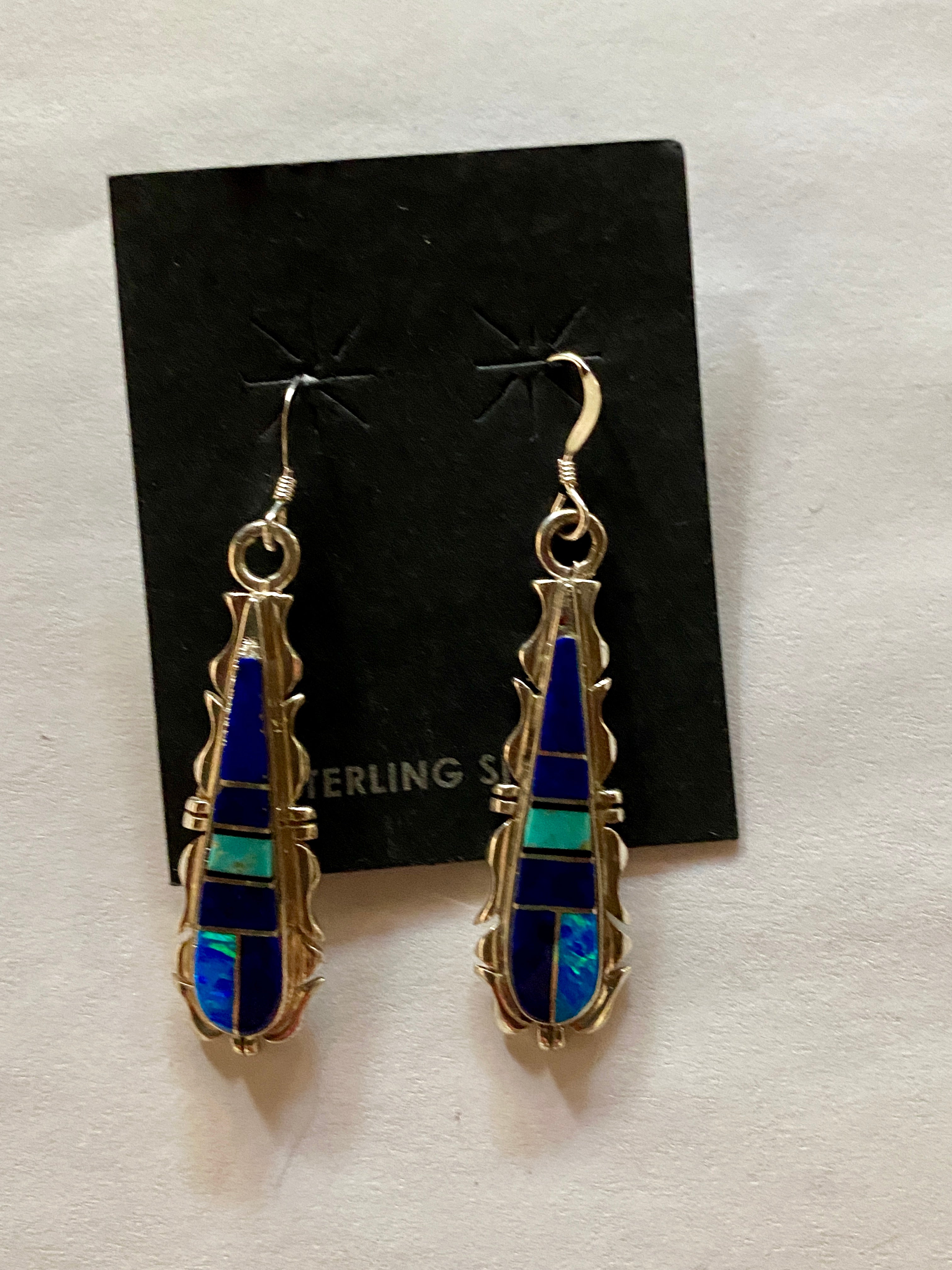 This beautifully well crafted Jagged Dangle earrings are handmade by an Artisan. The Colors of the Earrings come from Lapis Lazuli, Turquoise and Blue Opal. They are stamped Sterling and signed by the Artist.