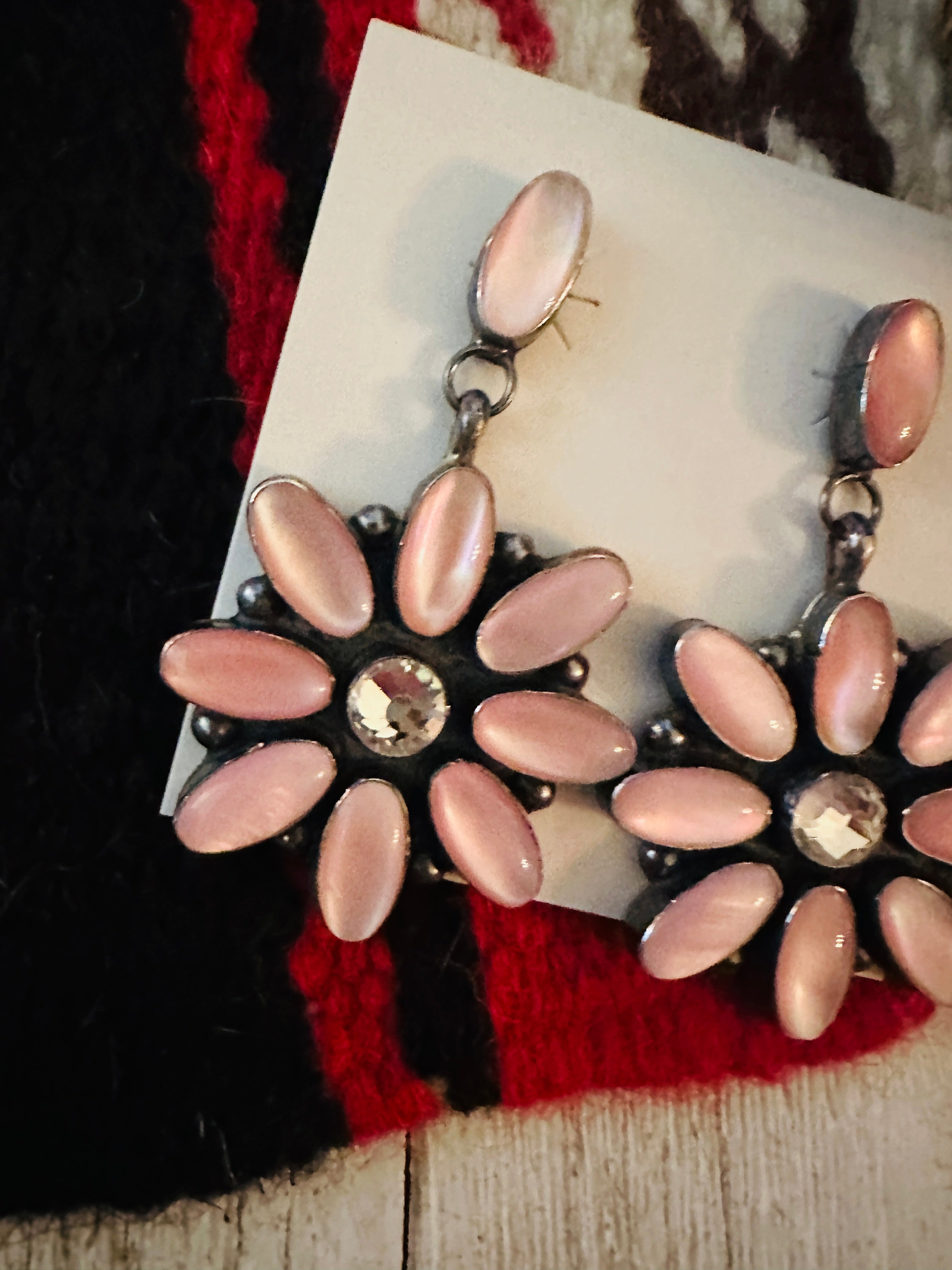 Beautiful Navajo Mother of Pearl, Cubic Zirconium, & Sterling Silver cluster dangle earrings. Stamped Sterling and signed by the artist Jacqueline Silver. The beauties measure 2 3/8 inches long and 1 3/8 inches wide.