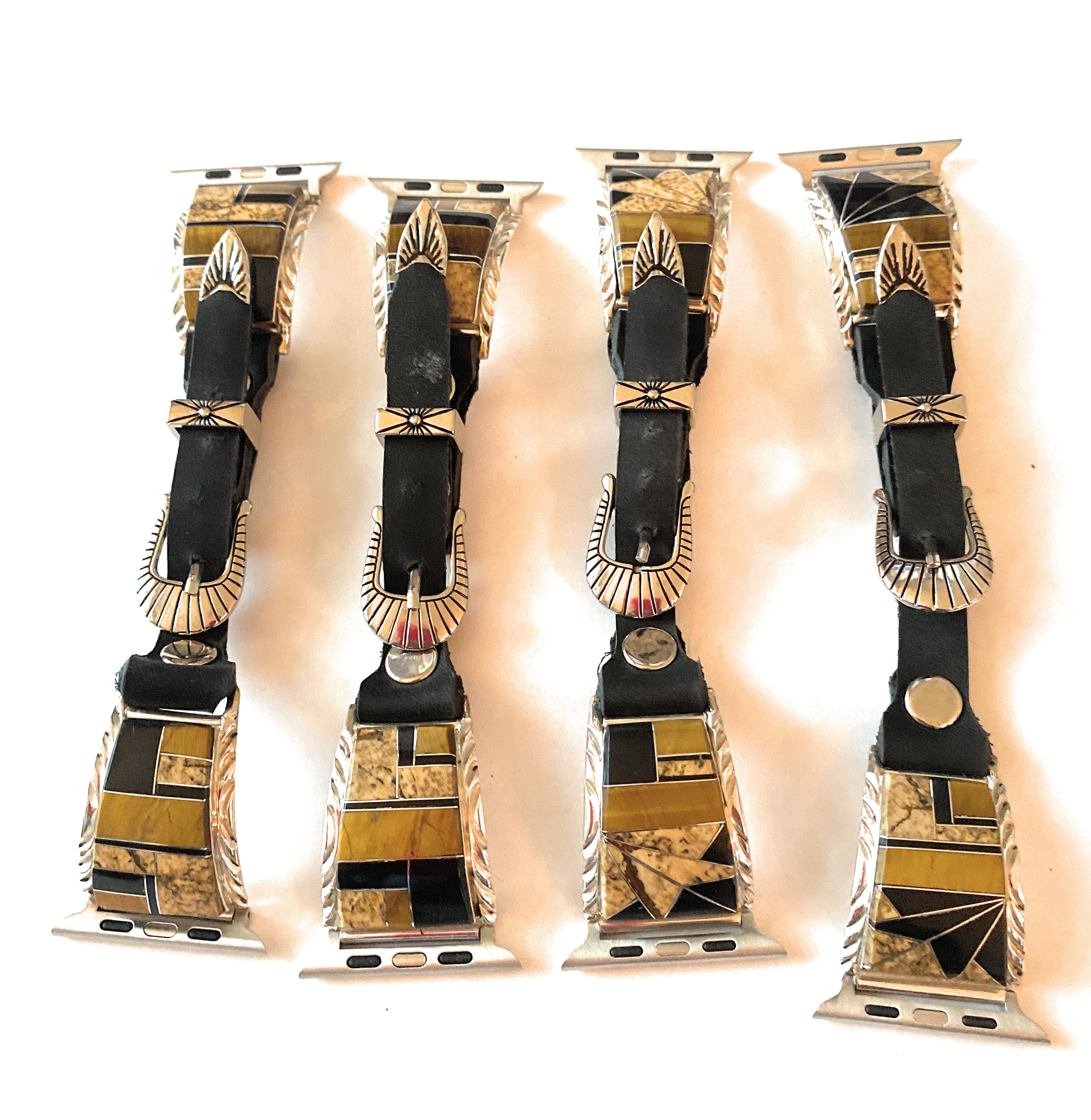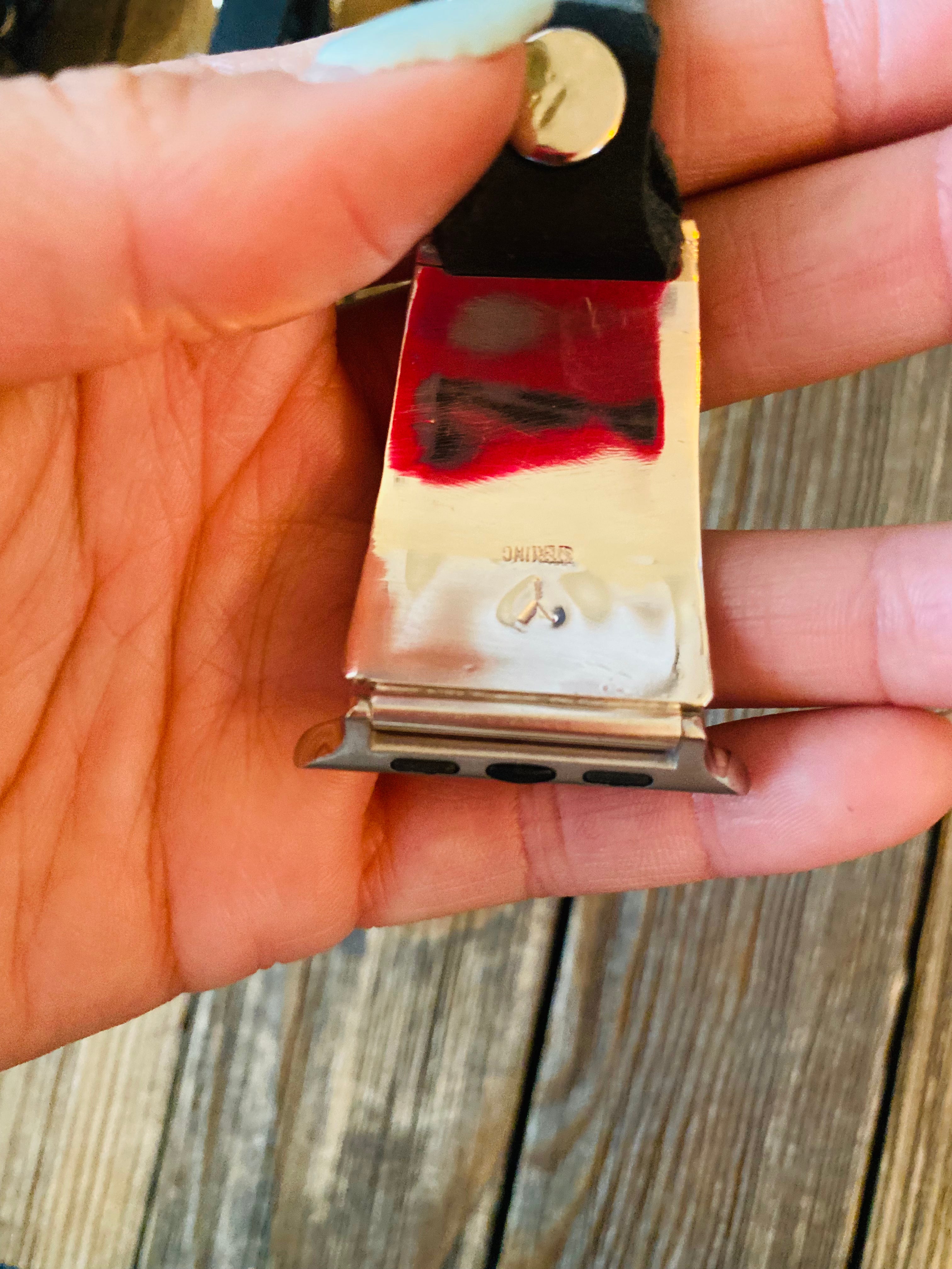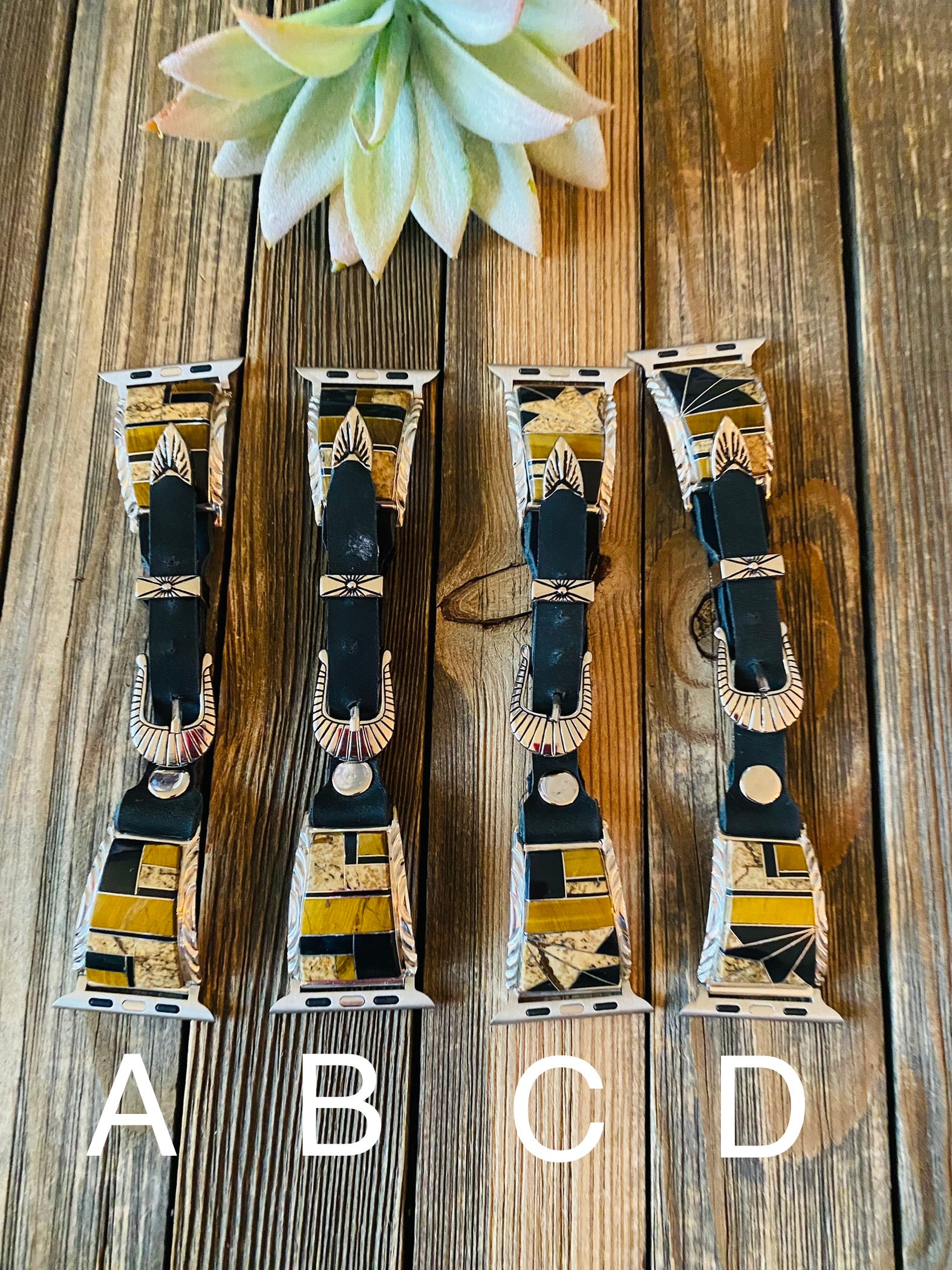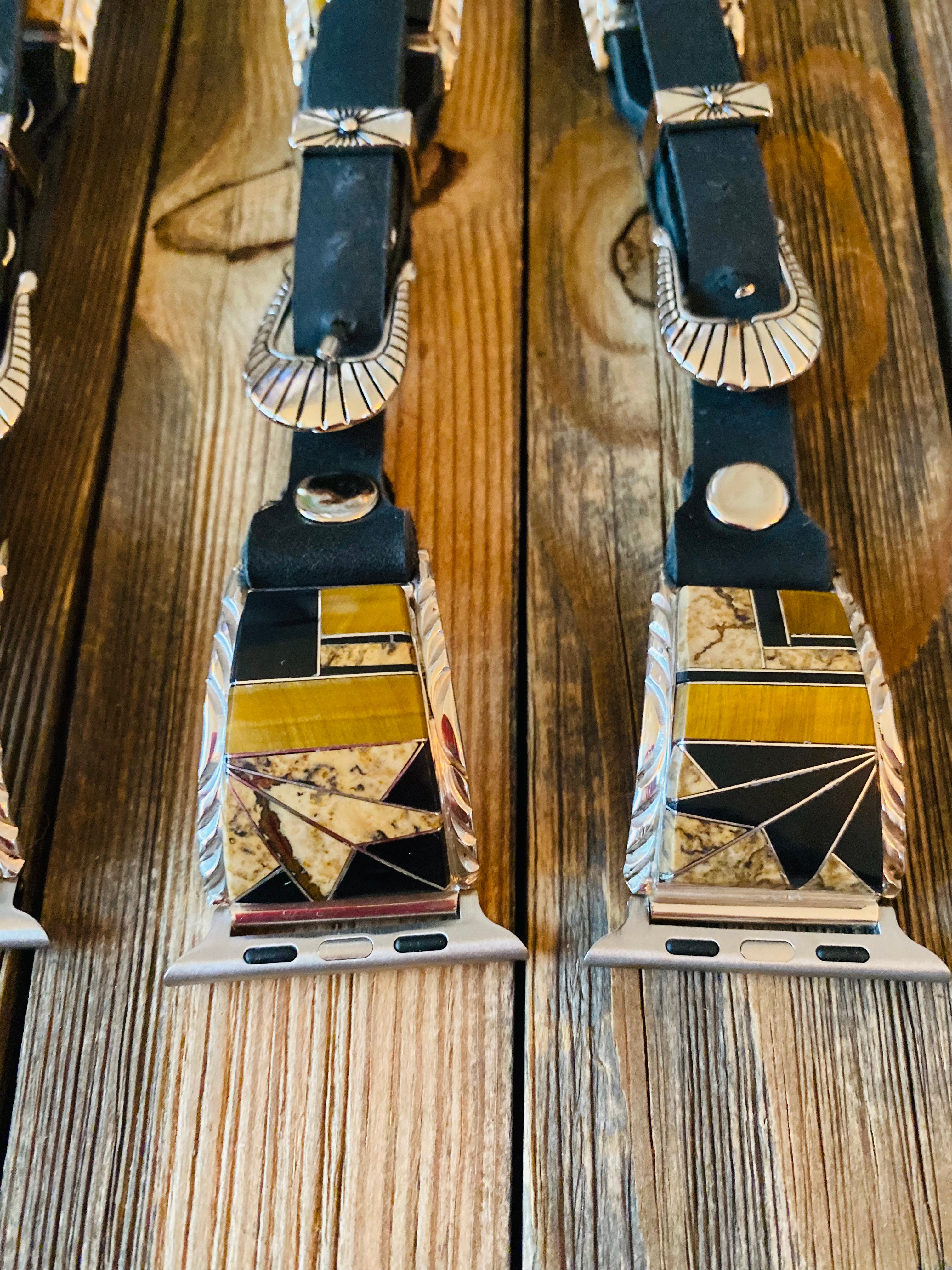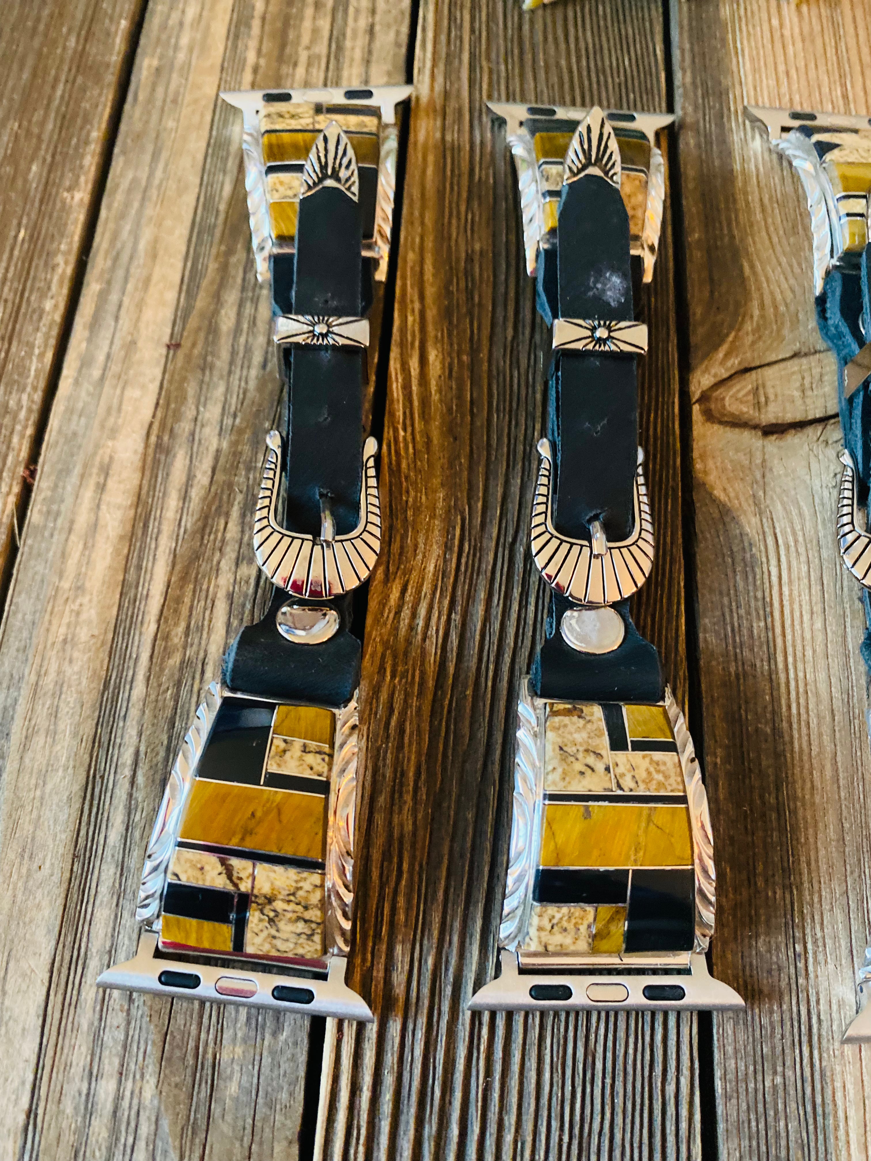 Gorgeous Handcrafted Jasper, Onyx, Sterling Silver and Black Leather Inlay Smartphone Watch Band. Band measures 6 1/4 - 7 1/4 inches long. Width is just over 1 inch. Such amazing craftsmanship! Signed by the artist and stamped Sterling. Please see picture 2 to choose specific watch band.