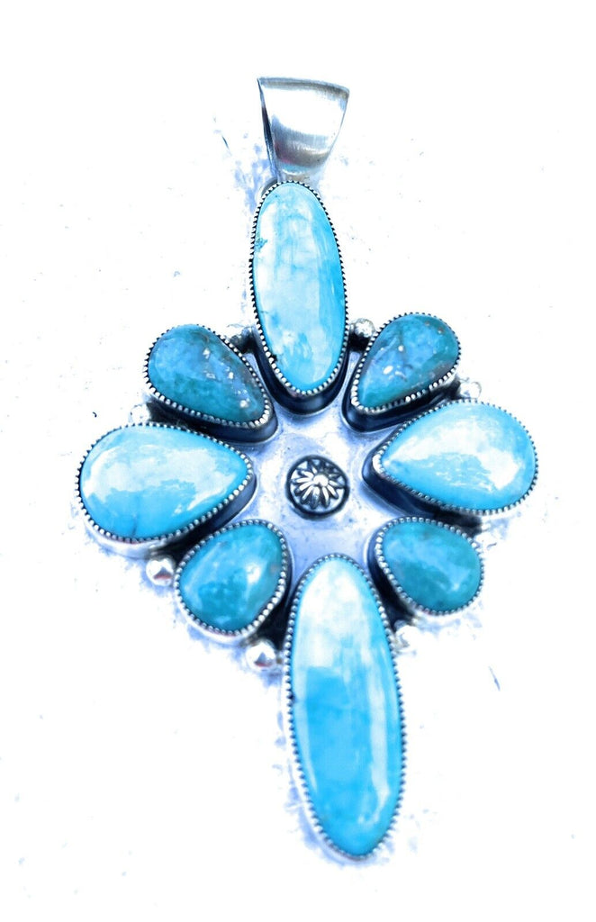 When your looking for that amazing piece and there it is ! Check out this amazing Multi Turquoise Cluster Pendant. Beautiful Colors in these stones set in Sterling Silver. Measuring 3 1/2 inches long and 2 inches wide. Weight 34 grams. Signed by the Artist R. B and stamped Sterling. Pendant only.
