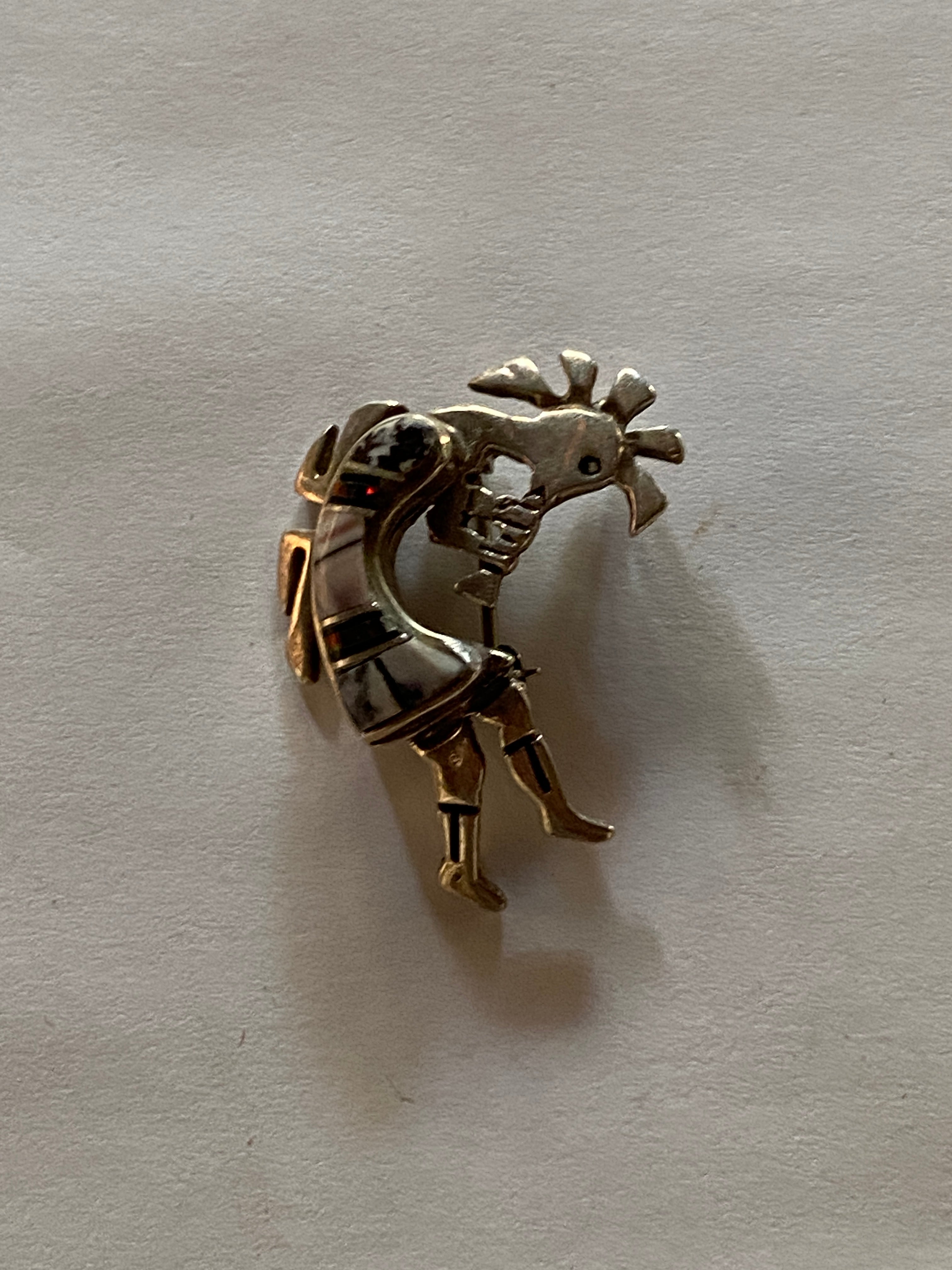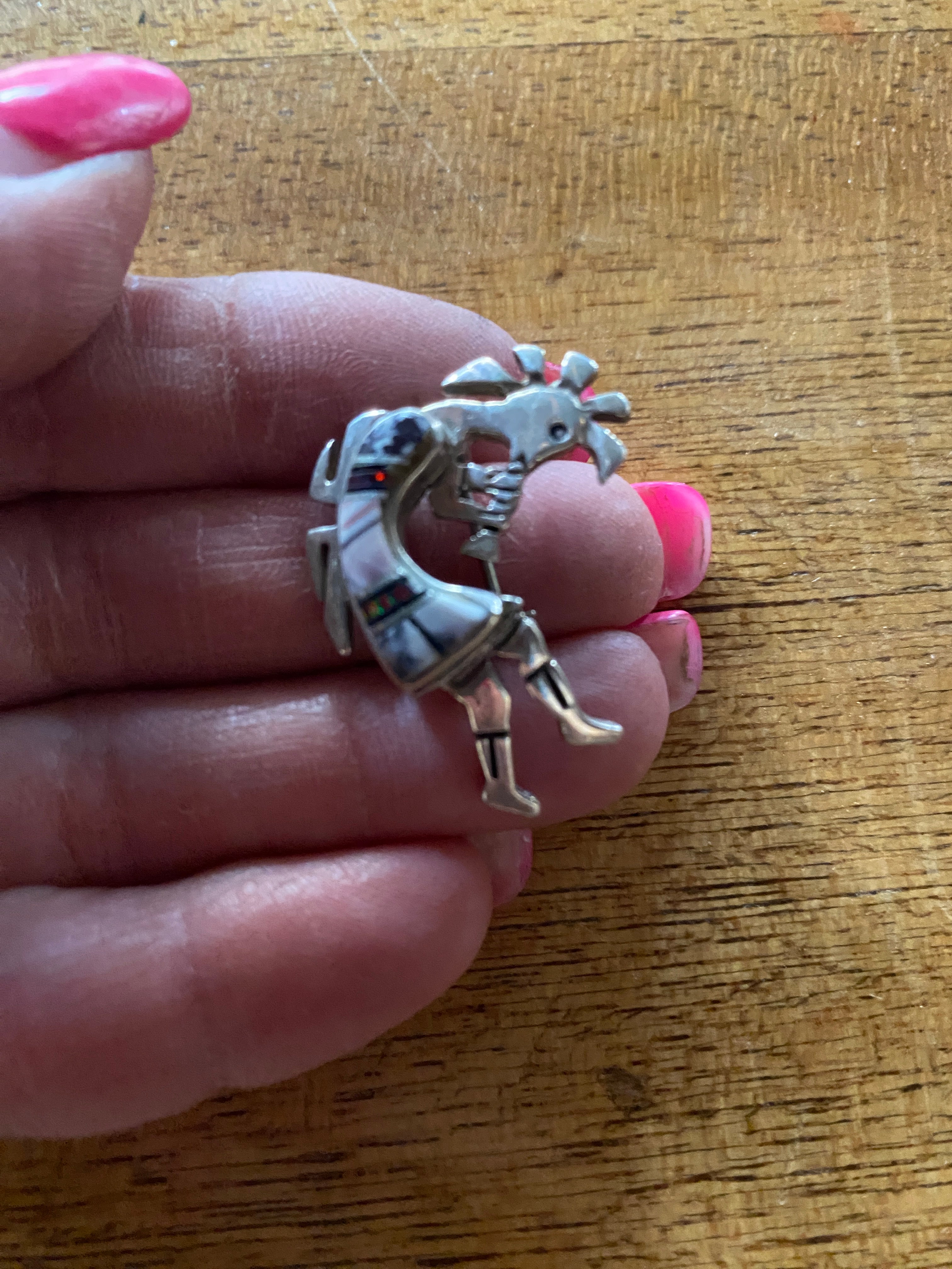 This Handmade Kokopelli Pendant & Pin is made with Onyx, Purple Spiny, Fire Opal & Sterling Silver. It measures 1.25” long and 1” wide. It is stamped Sterling and signed by the Artist. This piece is Earring so cool and well made.