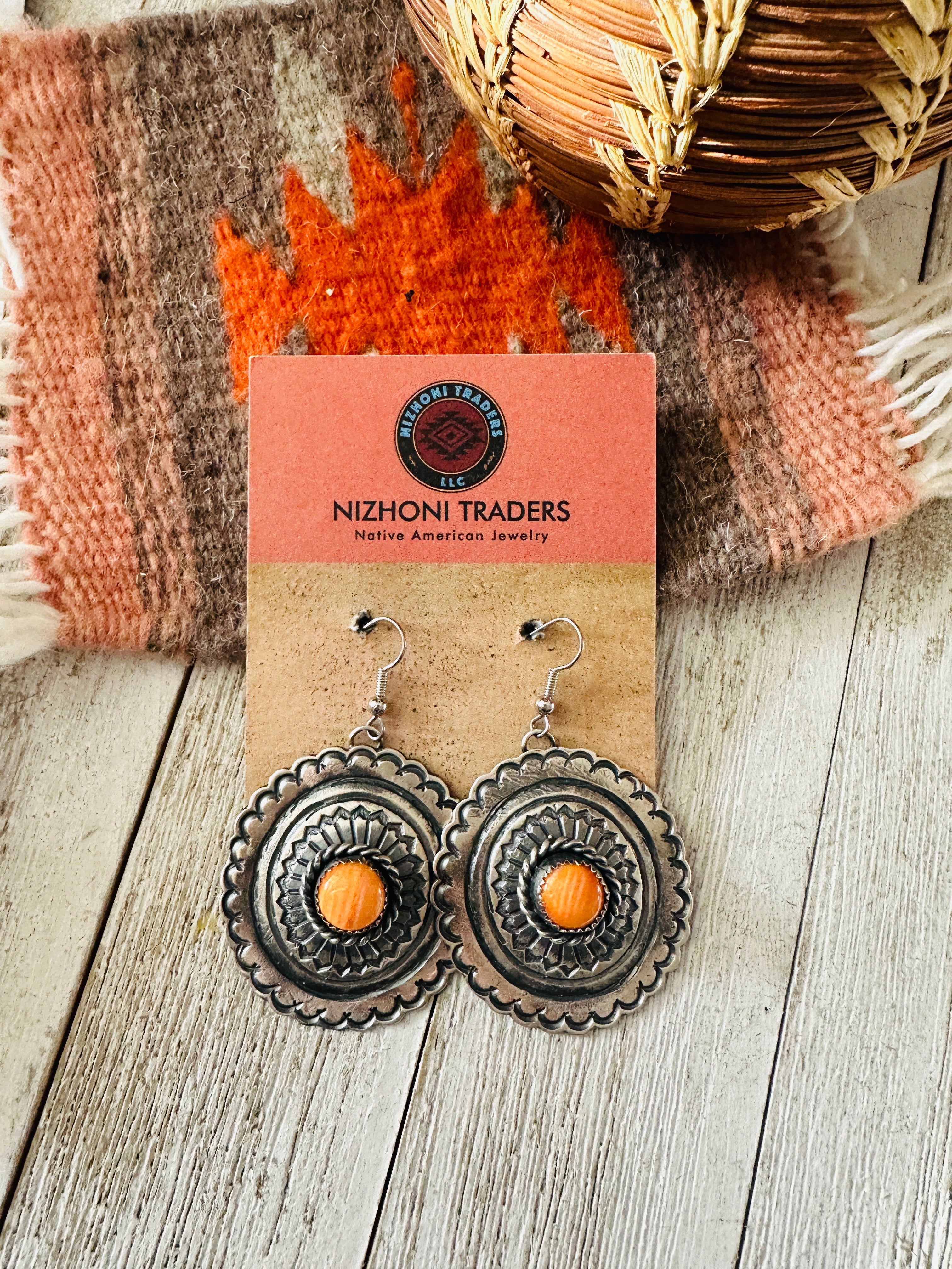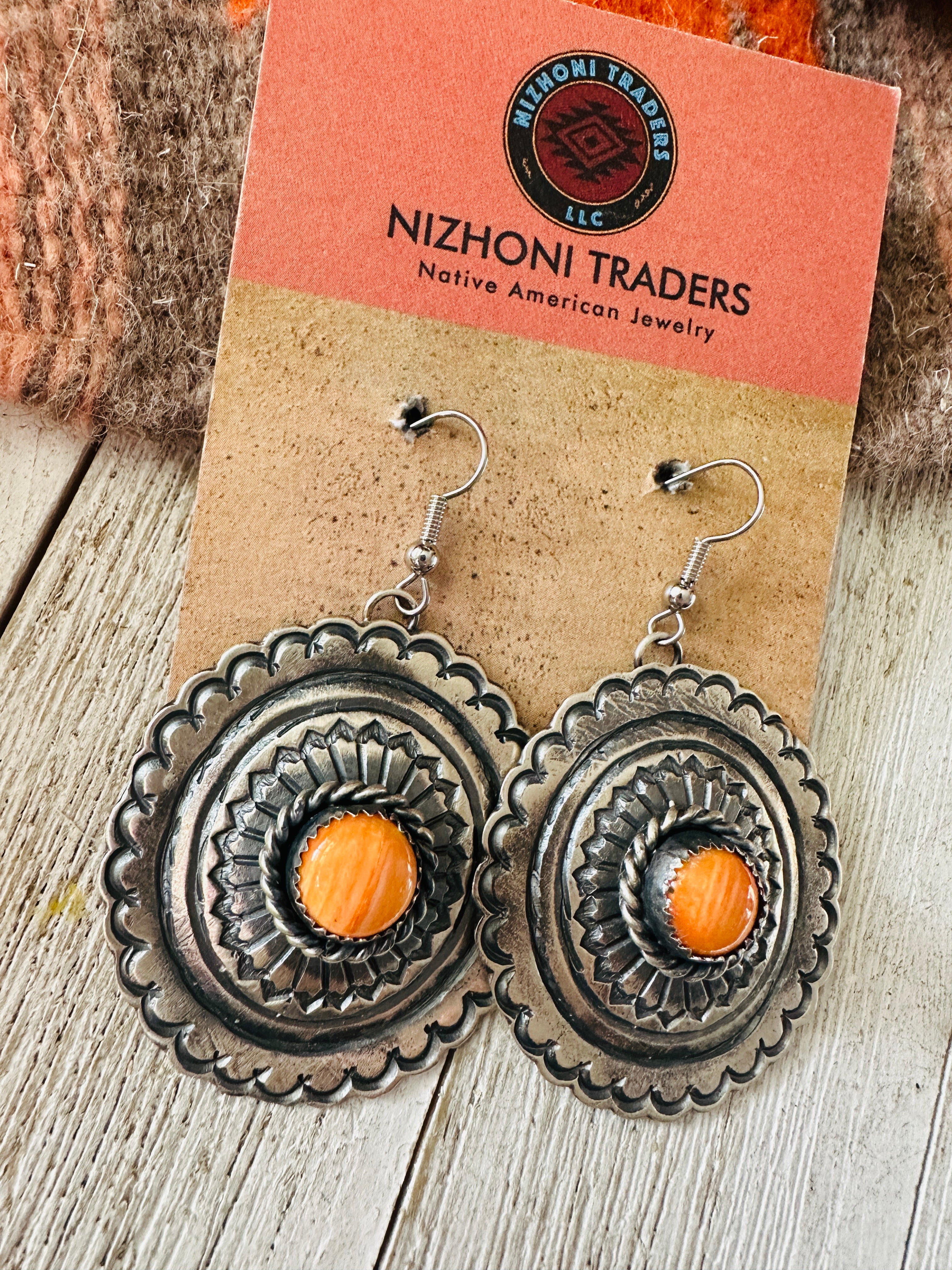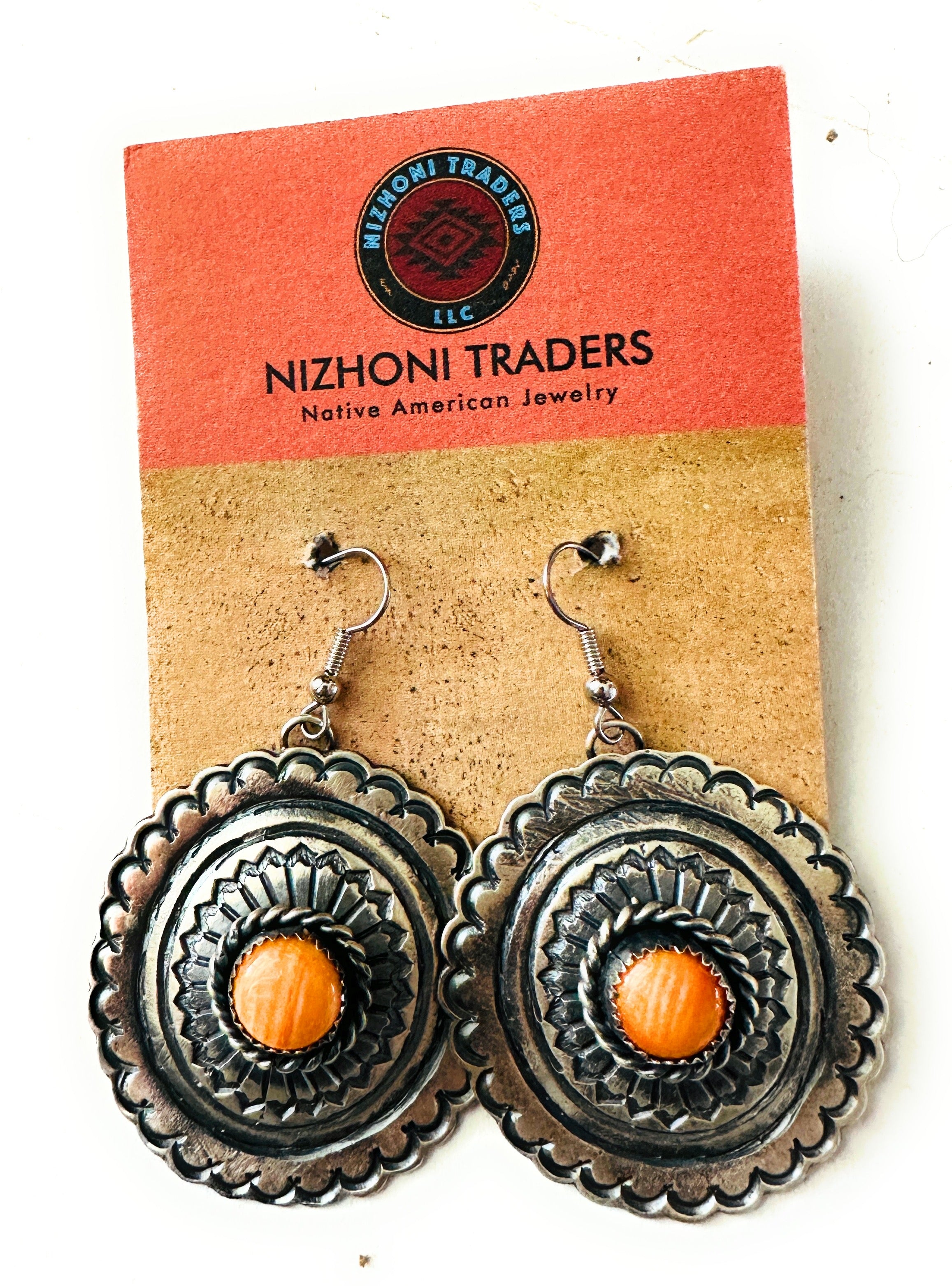 Navajo Orange Spiny and Sterling Silver Concho Dangle Earrings