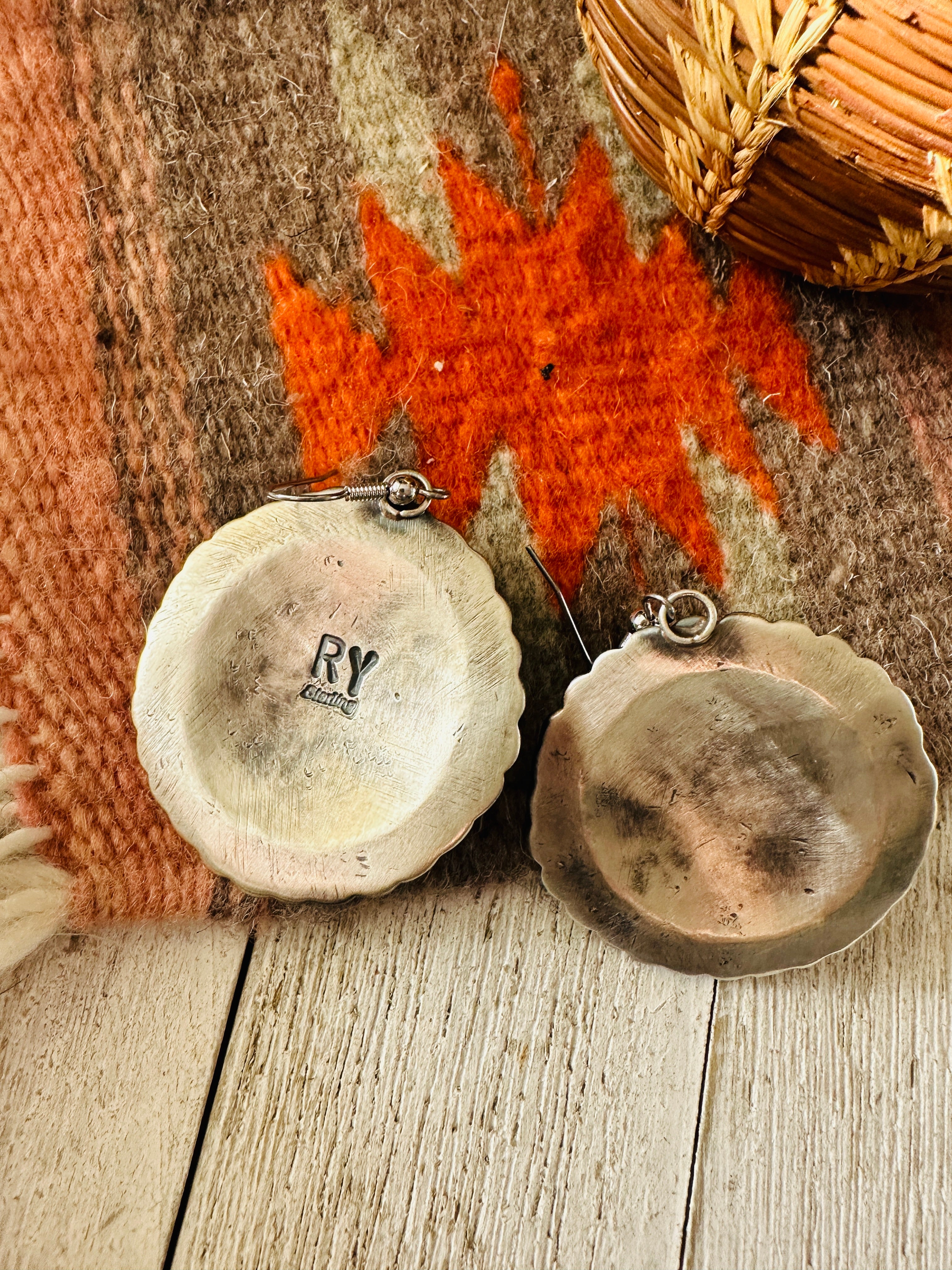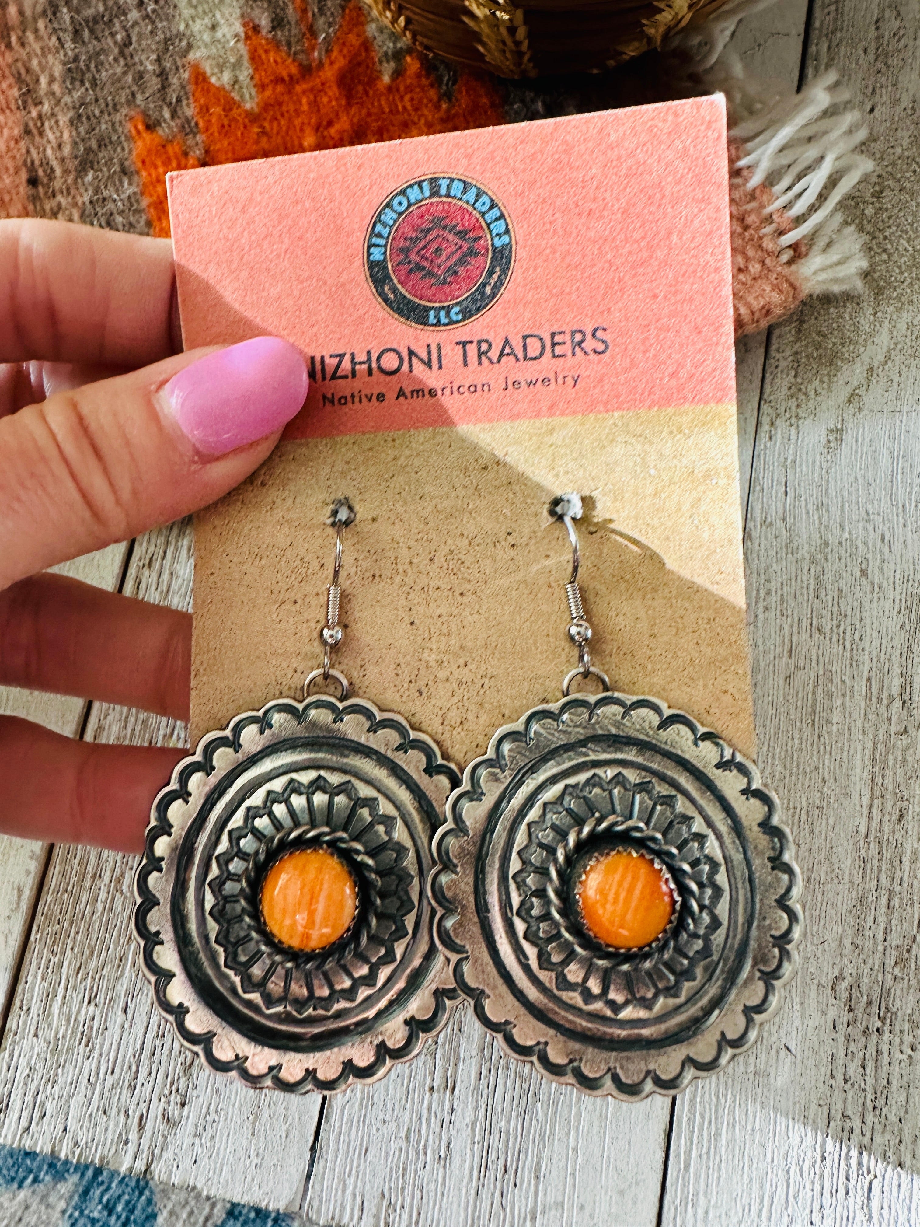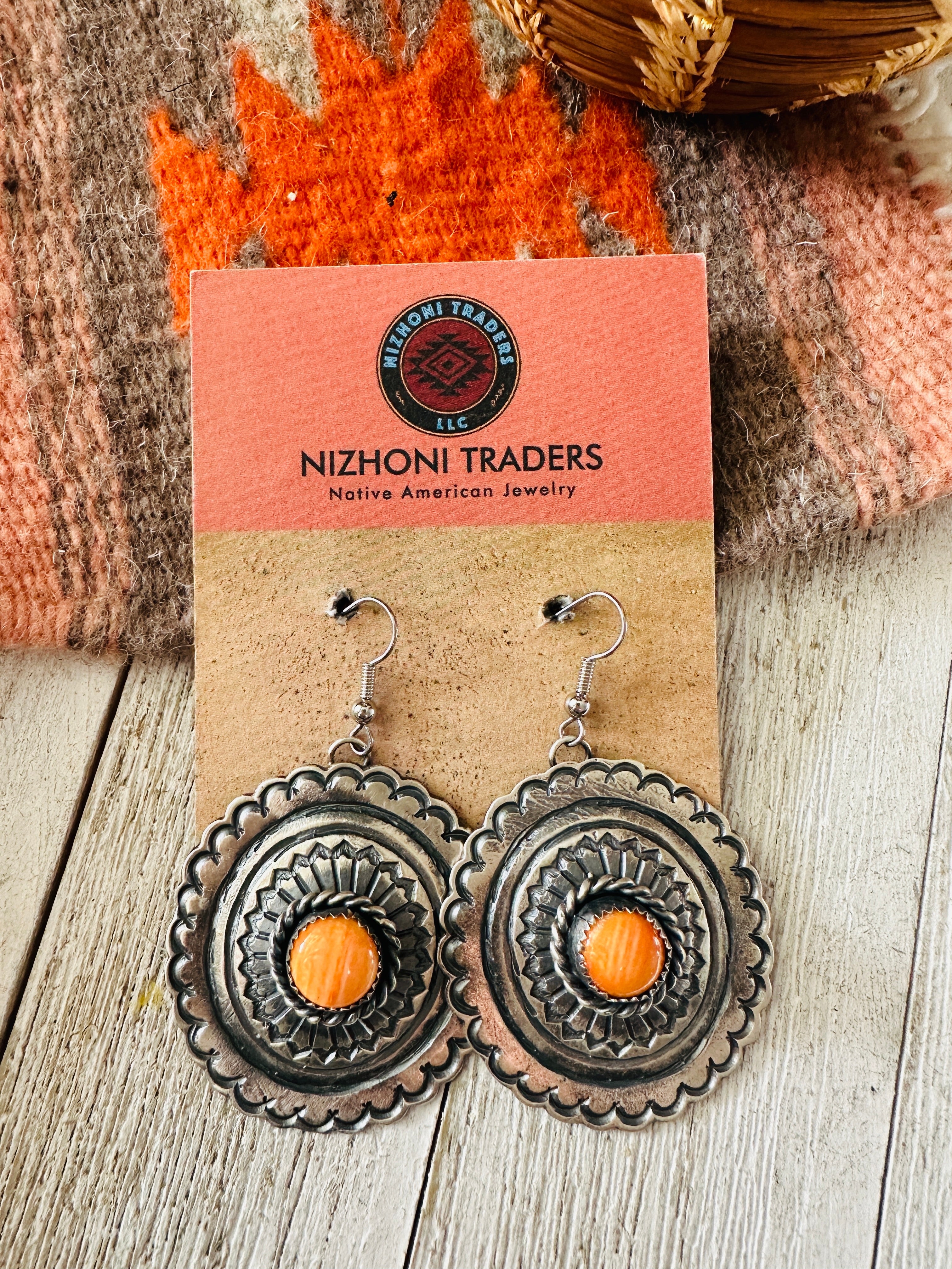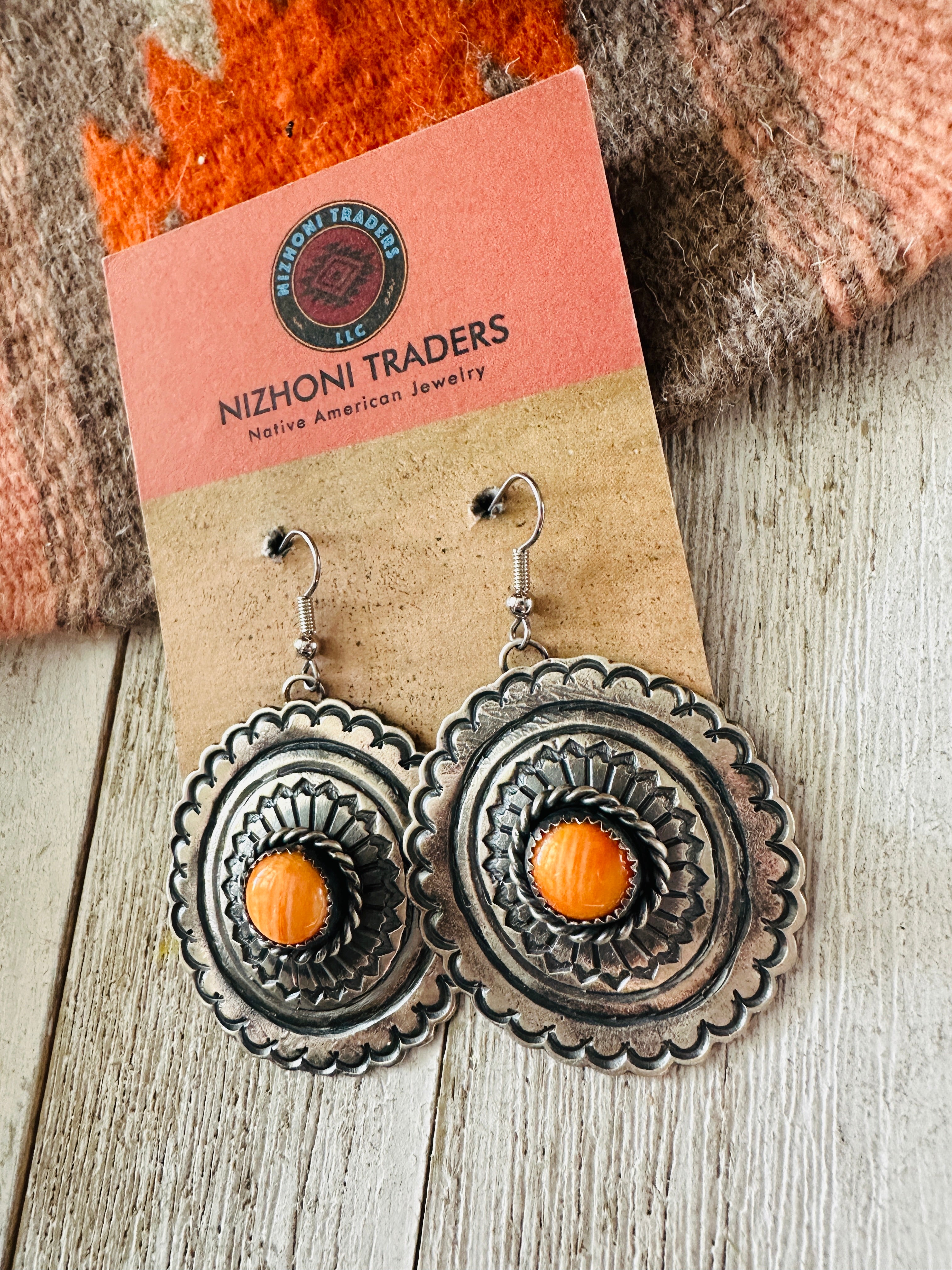 Navajo Orange Spiny and Sterling Silver Concho Dangle Earrings