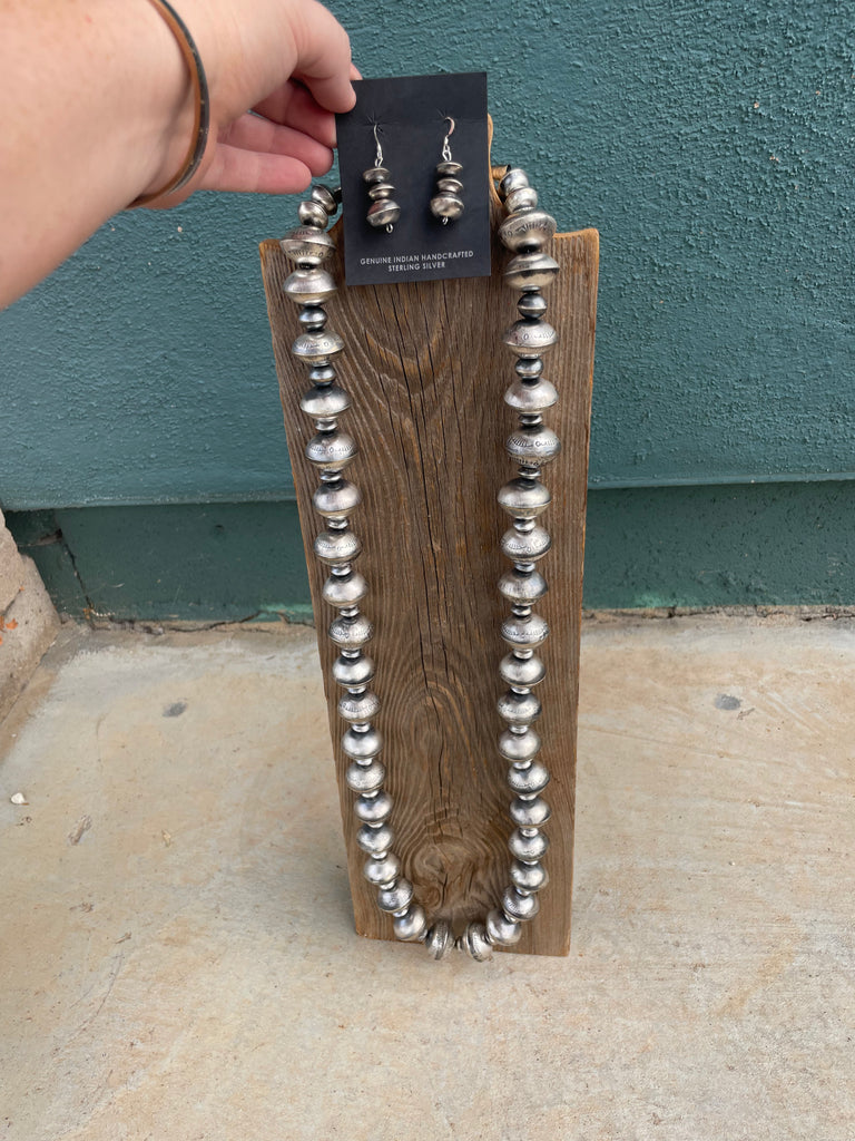 This is a pair of Navajo handmade Sterling Silver Pearl dangle earrings and necklace set. These earrings are 1 1/2 inches long. Necklace is 40 inches long. Very beautiful statement necklace. Beads are 5mm to 20mm. Signed by the artist and stamped sterling.