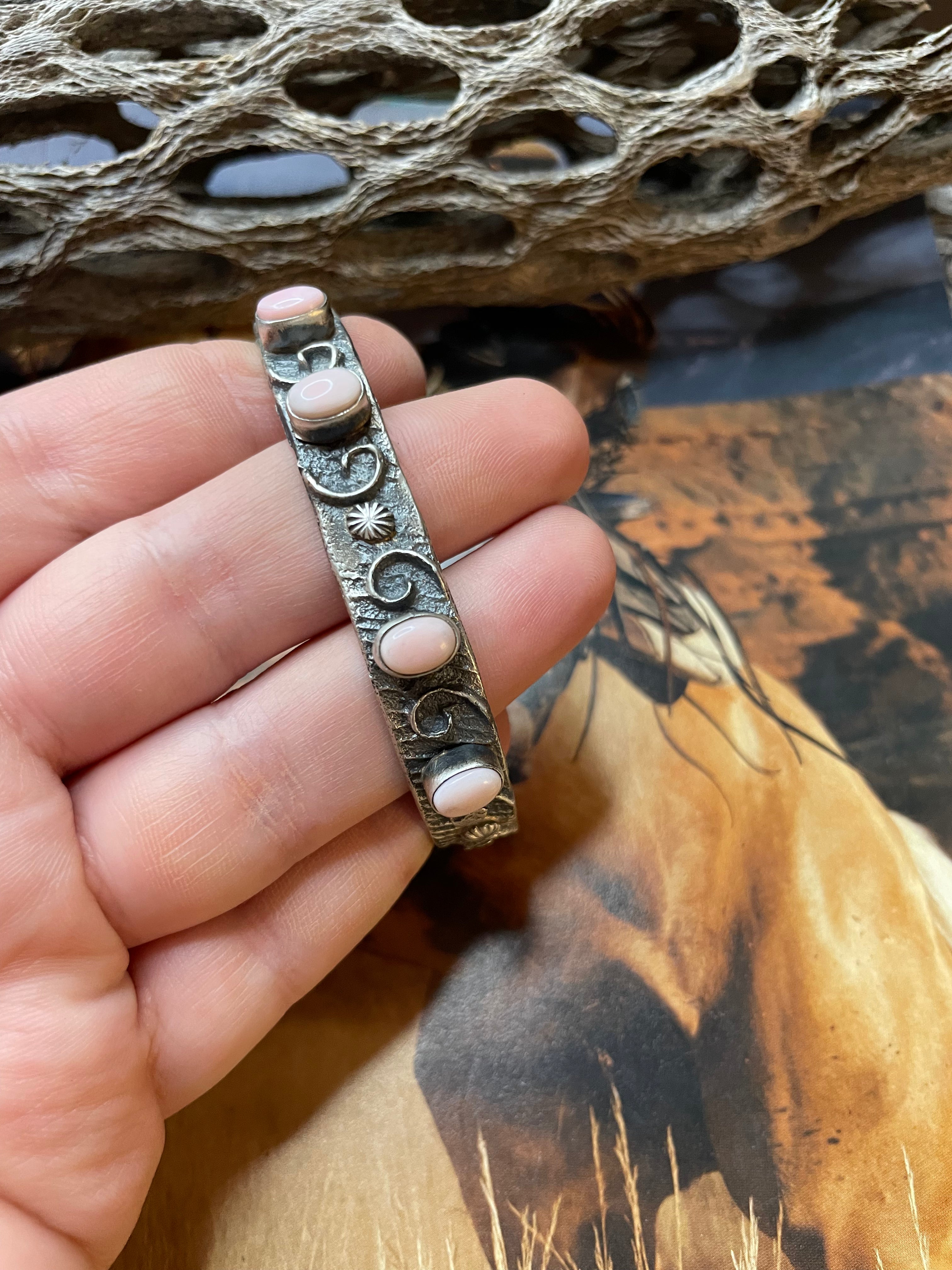 Navajo Pink Conch & Sterling Silver Tufa Cast Cuff Bracelet Signed