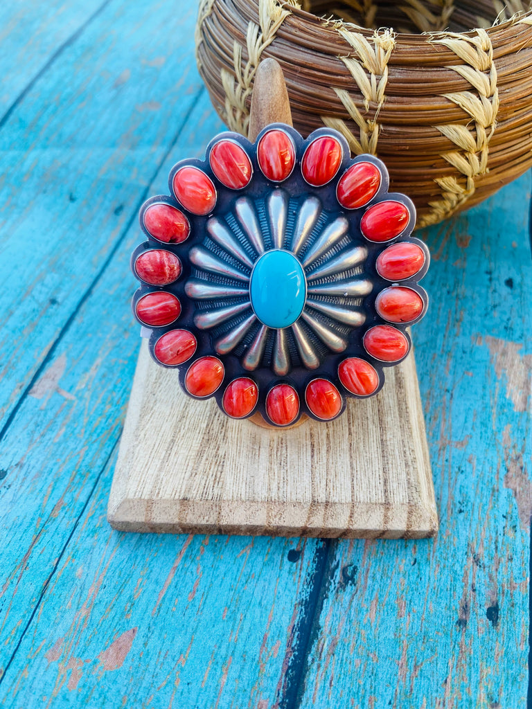 Beautiful Navajo Sterling Silver, Red Spiny Oyster Shell and Kingman Turquoise ring. Classic elegant style of the Southwest. Size is adjustable. Measuring 2 1/2 inches wide. Signed by the artist and stamped Sterling. Really pretty ring!